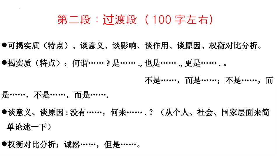 高中文文语议论万能模板之渡段过作文没有过渡段就像是台阶一脚迈俩,过渡段是一篇文章是否丝滑的决定性因素,是文章是否高级的重要表现之一,优秀的过渡句不仅承上启下,富含哲理,还能使文章流畅自然,更让阅卷老师惊叹连连!同学们写议论文,最易犯的毛病之一就是段落与段落之间缺少过渡和衔接的词词及语句或段落,以至语意不连贯,甚至上下段完全脱节。实际上,一篇好的议论文,除了其论点正确独到,论据充分典型外,还有更重要的一个方面,就是通过过渡和衔接,使语意连贯,从而达到文章如行云流水般,晓畅自然。渡段的重要性过可揭实质(特点)、谈意义、谈影响、谈作用、谈原因、权衡对比分析。揭实质(特点):何谓……?是…….,也是…….,更是…….。不是……,而是……;不是……,而是……,不是……,而是……。谈意义、谈原因:没有……,何来…….?(从个人、社会、国家层面来简单论述一下)权衡对比分析:诚然……,但是……。第二段:渡段(过100字左右)还是压根不会写,或者想拿高分?请拿出素材积累本做好以下笔记!分分钟变作文高手,小小作文,拿下!汗水成线,信仰为针,在枯白的时间中编织色彩。(中心论点)让我们有穿越层层阻碍的勇气,让渺小的期待闪烁着光芒,让我们有梦可追,有泪可落。个人的(中心论点)汇聚成集体的向往,奏起时代的号角,在今日的上空响彻,为每一个赶路人注入力量。万能模板之渡段过单一论点时:大海如果失去了巨浪的翻滚,就会失去雄浑;沙漠如果失去飞沙的狂舞,就会失去壮观;人生如果失去(中心论点),生命也就失去了意义。流光一瞬,华表千年,(中心论点)是坚稳大坝,抵御时代洪流滚滚。万能模板之渡段过单一论点时:(中心论点)是千里大堤一沙一石的凝聚,(中心论点)是春蚕吐丝一缕一缕的环绕。(中心论点)是青年远航的船帆,有了帆,船才可以与中国梦合流,与时代梦交汇,驶往更广阔更深远的海域。万能模板之渡段过单一论点时:盈盈月光,我选一杯最亮的;落落余辉,我拥一缕最暖的;灼灼红叶,我拾一片最热的;凄凄芳草,我摘一束最灿的;漫漫人生,我要采撷世间最重要的(中心论点),赋予暗夜洪流以烈阳绚烂,于心间端一杯人间温暖。万能模板之渡段过单一论点时:万能模板之渡段过单一论点时:(中心论点)是巍巍大厦的栋梁,没有它,就只是一堆散乱的砖瓦;(中心论点)是滔滔大江的河床,没有它,就只有一片泛滥的波浪;(中心论点)是熊熊烈火的引星,没有它,就只有一把冰冷的柴把;(中心论点)是远洋巨轮的主机,没有它,就只剩下瘫痪的巨架。万能模板之渡段过单一论点时:虽然尚在凛冬,但是春天的的气息已经浓郁,虽然尚在波浪中摇摆,但是(中心论点)像地平线一样已经开始拓展我们的视野,沉疴终会弥愈,问题终将解决,我们不妨点燃(中心论点),秉持对此的勇气,百感交集却坚定前行,无远弗届。万能模板之渡段过单一论点时:在国危民靡的年代,国家需要(中心论点)来撑起民族的脊梁,让改革复兴的曙光驱散贫困的阴霾;在怀疑成风的时代,社会需要(中心论点)来弘扬思想的正气,让精神文明的建设发挥更大的威力;在躺平猖獗的现代,青年需要(中心论点)来直面成长的坎坷,让青春韶华的汗水浇灌贫瘠的现实。万能模板之渡段过单一论点时:(中心论点)之心,人皆有之;辩证(中心论点),鲜有人及。(中心论点)可以是照亮黑暗求知路的第一根烛,亦可以为燃葬飞蛾的熊熊烈火;唯有经审时度势、辩证看待、适度留存,方可免为扑火飞蛾,方可阻止误入歧途之悲剧演绎,方可成就行走于求知路的最好的我们,方可走好【理想目标】之路。万能模板之渡段过单一论点时:(中心论点)像一张无形的巨网,将每一个分散的个体联结在一起,既凝结了团结的力量,亦堆积了暴虐的情绪,既能救人于水火,亦能杀人于无形,(中心论点)也是一把双刃剑,但剑最终指向何方,还是由我们来决定。万能模板之渡段过多个论点阐明二者关系:犹如硬币的两面,(论点1)和(论点2)相辅相成,共同谱写的篇章。(论点1)和(论点2)是源与流的关系,同时也彼此影响。(论点1)构成(论点2)的壮阔,(论点2)因(论点1)而闪...
