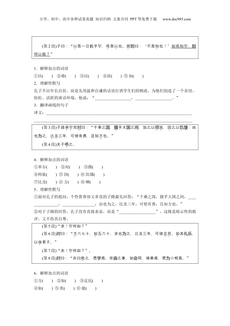 小学、初中、高中各种试卷真题知识归纳文案合同PPT等免费下载www.doc985.com[复习重点]1.积累并记牢120个实词中的“如”“莫”“爱”“若”“徒”“宜”“族”“乃”“盖”“解”“请”“率”及次常用字“方”“作”“尔”“让”“御”“释”。2.背诵《子路、曾皙、冉有、公西华侍坐》,翻译重点句子。3.掌握通假字的特点及辨析方法。[课文概览]课题文体作者核心内容艺术特色子路、曾皙、冉有、公西华侍坐对话体散文孔子弟子及再传弟子记录了孔子和子路、曾皙、冉有、公西华这四个弟子“言志”的情景,表现出各个人物的精神风貌和思想高度,反映了儒家仁政、礼乐治国的理念。1.围绕“言志”展开,中心突出2.语言、动作、神态描写传神3.人物形象生动、鲜明齐桓晋文之事论辩体散文寓言体散文孟子及其弟子通过孟子游说齐宣王提出放弃霸道施行王道的经过,比较系统地阐发了孟子的仁政主张。1.论辩艺术高妙;避实就虚、欲擒故纵、取譬设喻、逐层推进2.语言气势充沛,富有感情庖丁解牛散文庄子作者原意是用它来说明养生之道的,借此揭示了做人做事都要顺应自然规律的道理。运用细致生动的记叙和描写,以及对比、夸张等手法,阐明了抽象的道理课文1子路、曾皙、冉有、公西华侍坐一、基础夯实第1段子路、曾、冉有、公西侍坐。皙华小学、初中、高中各种试卷真题知识归纳文案合同PPT等免费下载www.doc985.com第2段子曰:“以吾一日乎尔,长毋吾以也。居曰:则‘不吾知也!’如或知尔,则何以哉?”1.解释加点的词语①以()②毋()③以()④居()⑤知()2.理解性默写孔子不以年长自居,而是先用温和自谦的话语打消学生们的顾虑,为他们创造了一个亲切、轻松、活跃的谈话环境,他说:“__________________,__________________。”3.翻译画线的句子译文:______________________________________________________________________________________________________________________________________________________(第3段)子路率尔而对曰:“千乘之,国摄乎大之,加之以国间旅师,因之以饥馑;由也之,为比及三年,可使有勇,且知方也。”(第4段)夫子哂之。4.解释加点的词语①率尔()②对()③摄()④师旅()⑤因()⑥饥馑()⑦比及()⑧方()⑨哂()5.理解性默写①面对孔子的提问,个性鲁莽却又率直的子路最先回答:“千乘之国,摄乎大国之间,________________,________________;由也为之,比及三年,可使有勇,且知方也。”②对于子路的回答,孔子没有直接表态,而是“__________________”,这既是暗示性的批评,又不伤其自尊。第5段“求!尔何如?”第6段曰:对“方六七十,如五六十,求也之,比及三年,可使为足民。如其,礼乐以俟君子。”第7段“赤!尔何如?”,第8段曰:对“非曰能之,愿焉。宗之事,如同,端章甫,愿小相焉。学庙会为”6.解释加点的词语①方()②如()③足民()④如()⑤俟()⑥能()小学、初中、高中各种试卷真题知识归纳文案合同PPT等免费下载www.doc985.com7.理解性默写①冉有比较谦虚,从他述志时说的“__________________,________________”可以看出来。②面对孔子的询问,公西华认为自己能力不足,仍需要学习,对于宗庙祭祀之事,“________________,________________”。第9段“点!尔何如?”第10段鼓瑟希,尔,舍瑟而铿作,曰:对“乎三子者之异撰。”第11段子曰:“何伤乎?亦各言其志也。”8.解释加点的词语①希()②作()③撰()④何伤()9.理解性默写文中写曾皙弹奏瑟的声音渐渐稀疏下来的两句是“____________,____________”。第12段曰:“莫春者,春服成既,冠者五六人,童子六七人,浴乎沂,风乎舞雩,咏而。归”第13段夫子喟然曰:叹“吾与点也!”10.解释加点的词语①既()②成()③冠者()④童子()⑤风()⑥咏()⑦喟然()⑧与()11.理解性默写①文中写春天天气和暖,春天的衣服已经穿定了的句子是“____________________,__________________”。②面对孔子的询问,曾皙描绘了一幅在大自然里沐浴春风,一路酣歌的美丽动人的景象,文中写此内容的句子是“__________________,__________________,_____________...