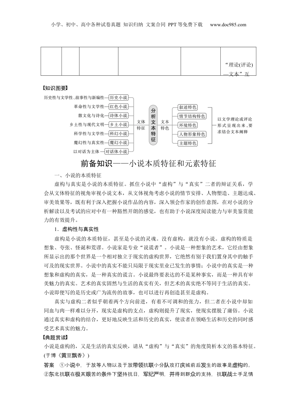 小学、初中、高中各种试卷真题知识归纳文案合同PPT等免费下载www.doc985.com课时11分析文本特征——据及篇,由理到据类复习任务1.理解小说的文体特征以及多种特征元素,学会从文本特征角度或借助文学理论阅读小说。2.掌握小说文体特征分析题和“理论(评论)—文本”互证题两种题型的解题方法。考情微观年份卷别篇名提问方式设题角度命题特点2022全国甲卷《支队政委(节选)》/《长征:前所未闻的故事(节选)》这两个内容相近的文本文体不同,因而艺术表现也有差异。请比较并简要分析。(6分)小说与回忆录(写实作品)文体特征及艺术表现比较①从文本、文体特征入手考查考生对小说的阅读,这是一个新的命题点、新方向。②命题着力点在对小说虚构与真实的本质特征的认识上。③考查以两种题型进行:a.以“个”考“类”(该篇文本所体现的文体特征);b.以理找据[给出文学理论或评论,从该文本中找出依据,也称2019全国Ⅰ卷《理水(节选)》《理水》是鲁迅小说集《故事新编》中的一篇,请从“故事”与“新编”的角度简析本文的基本特征。(6分)历史小说文体特征2018全国Ⅰ卷《赵一曼女士》小说中历史与现实交织穿插,这种叙述方式有哪些好处?请结合作品简要分析。(6分)纪实小说文体特征全国Ⅲ卷《微纪元(节选)》结合本文,谈谈科幻小说中“科学”与“幻想”的关系。(6分)科幻小说文体特征小学、初中、高中各种试卷真题知识归纳文案合同PPT等免费下载www.doc985.com“理论(评论)—文本”互知识图要前备知识——小说本质特征和元素特征一、小说的本质特征虚构与真实是小说的本质特征。抓住小说中“虚构”与“真实”二者的辩证关系,学会从文体特征的视角审视小说文本,从文体视角考虑小说的情节安排、人物塑造、主题达成、审美效果等,既有利于深入把握小说作品的内容,深入领会作家的创作意图,在对小说的分析解读以及考试的应对中有一种豁然开朗的感觉,也有助于小说深度阅读能力与审美鉴赏能力的有效提升。1.虚构性与真实性虚构是小说的本质特征,甚至是小说的灵魂。没有虚构,就没有小说。虚构的特质是想象、夸张、怪诞和荒谬。小说家是专业“说谎者”。小说是一种想象的艺术,它经由想象所显示出的那个世界是一个相对独立于现实的虚构世界,它绝然有别于我们置身其中的触手可及的现实世界。小说中的真实不能只局限于现实里业已发生的事情;小说中的真实是一种想象和虚构的真实,是一种真实的谎言。小说最终要表达的不是某种事实,而是一种具有审美魅力的真实。艺术的真实固然与生活的真实有关,但艺术的真实绝不等同于生活的真实。小说即便写的是历史或广为流传的故事,也可以进行再创造甚至是虚构。真实与虚构二者似乎朝着两个方向前进,有着不可调和的张力,但二者在小说中却如同血与肉一样难以分开,现实是虚构的支点,虚构则提升了现实,使现实摆脱了庸俗。小说通过真实和虚构的结合,更好地反映生活和历史的真实,使读者在领略生活和历史的同时感受艺术真实的魅力。典题赏读小说是虚构的,又是生活的真实反映,请从“虚构”与“真实”的角度简析本文的基本特征。(于博《豆香》黄飘)答案①小中,于放等人物以及于放抗小分攻打城前后生的故事是的。说带领联队庆发虚构②北抗在其苦的件下持抗日,明,得到群的支持,抗士手足情东联极艰条坚军纪严并众联战小学、初中、高中各种试卷真题知识归纳文案合同PPT等免费下载www.doc985.com深,都是的。真实③小通和的合,更好地反映生活和史的,予生活说过真实虚构结历真实赋和史美价,更能感染者,使者在略生活和史的同感受到的魅力。历审值读读领历时艺术真实2.真实性与文学性小说是一种文学艺术,无论它有多少种类,其特征都是建立在真实性和文学性这一基础之上的。什么是真实性?真实不等于事实。事实是针对客观而言的,真实是针对主观而言的。事实是小说创作的原料,真实则是对这些原料的加工制作,形成具有感染力的艺术真实。事实是真实的基础,社会生活是小说创作的源泉,而且是唯一的源泉。这是文学创作的一条基本规律,但小说不以呈现事实为目的,小说要表达的是作家对社会现实的深刻理解,而不是单纯呈现其所目睹的事实。因此,文学的真...