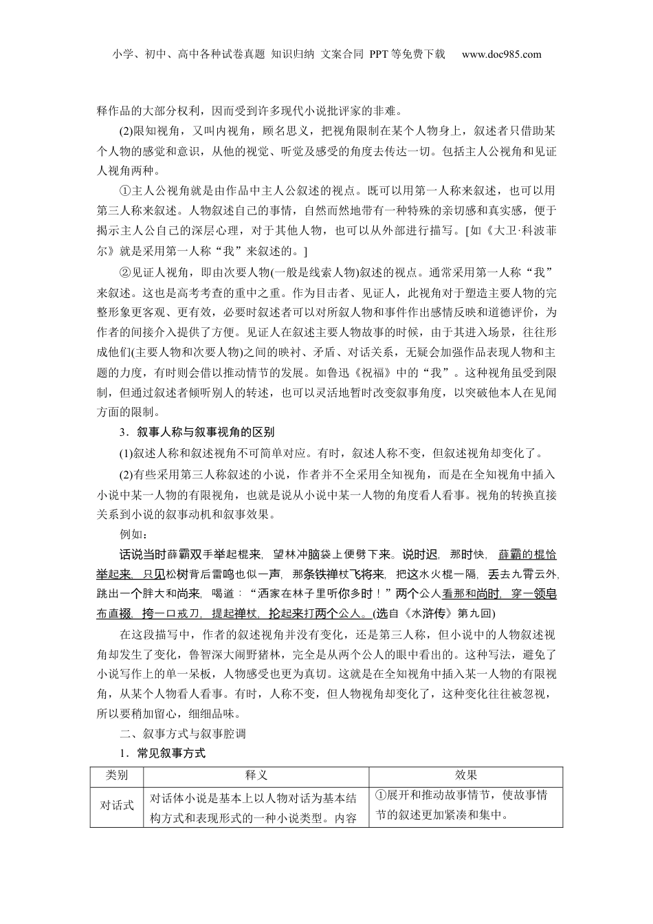 小学、初中、高中各种试卷真题知识归纳文案合同PPT等免费下载www.doc985.com课时7分析叙事特征——精判特征,精析效果复习任务1.掌握小说叙事方面的知识,重点是叙事人称、视角与叙事方式。2.学会分析小说叙事的特点,并能够掌握答题要点。考情微观年份卷别篇名提问方式设题角度命题特点2021新高考Ⅰ卷《石门阵》王木匠讲石门阵时,多处使用反复手法,这种讲述方法有什么效果?(4分)叙事方法(单一角度)①小说叙事艺术分析是近几年高考的命题热点。②高考考查有单一与综合两个角度,以前者为主。单一考查主要放在文本的某一叙事方式及特征上。③命题者一般先给出叙事方式,重在分析“作用”“效果”。2019浙江卷《呼兰河传(节选)》分析本文叙述上的特征。(6分)叙事特征(综合角度)2018全国Ⅰ卷《赵一曼女士》小说中历史与现实交织穿插,这种叙述方式有哪些好处?请结合作品简要分析。(6分)叙事方式(单一角度)2014全国Ⅰ卷《古渡头》作品是怎样叙述渡夫的故事的?这样写有什么好处?请简要分析。(6分)叙事特征(综合角度)知识图要小学、初中、高中各种试卷真题知识归纳文案合同PPT等免费下载www.doc985.com(明:说“事叙艺术”与课时6中的“故事情节”有交叉、重合容。内)前备知识——叙事三组一、叙事人称与叙事视角1.叙事人称常见的叙事人称有三种:(1)第一人称:①便于作者抒发自己或人物的思想感情;②使读者感到真实、亲切、自然。(2)第二人称:①营造一种亲切的氛围,把所要表现的事物更亲切地表现出来;②拉近作者与读者的距离。(3)第三人称:①以局外人的视点进行叙述,作者往往站在旁观者的立场上,把他们的经历或事件的发展变化呈现在读者面前;②使所叙人物或事件不受时间和空间的限制,反映的生活面更为广阔。所有人称的变化都是为表情达意服务的,不同人称的出现会丰富文章的叙事手段,有助于作者思想情感的表达。三种人称常常交叉使用,单纯使用一种叙述方法的文章比较少见。使用第一人称时往往穿插第三人称的转述,以扩大时空领域。使用第三人称的,常有人物的独白、对话等,以增强文章的真实感和亲切感。2.叙事视角叙事视角,也叫叙事聚焦,是一部作品或一个文本看世界的特殊眼光和角度,可分为全知视角和有限视角两类。(1)全知视角,又叫外视角或零聚焦,是从与故事无关的旁观者立场进行的叙述。全知视角往往采用第三人称的叙述方式,这种视角切入的优点是自由灵活,叙述人不受时空的限制,纵横捭阖,运用自如,人物和事件可以自由表现;并能让读者对人物和事件有一个全面而具体的了解,最大限度地展示社会生活的深度和广度。传统的叙事作品多采用这种叙述方式,比如《水浒传》中这么写,“李逵想……”“宋江想……”,叙述者可以随意进入任何一个人物的心灵深处挖掘隐私,袒露心声。但由于过多的叙事自由,叙述者对作品中的人物及命运、对所有事件可完全控制、任意摆布,削弱了小说的真实感,剥夺了阅读者探索、解小学、初中、高中各种试卷真题知识归纳文案合同PPT等免费下载www.doc985.com释作品的大部分权利,因而受到许多现代小说批评家的非难。(2)限知视角,又叫内视角,顾名思义,把视角限制在某个人物身上,叙述者只借助某个人物的感觉和意识,从他的视觉、听觉及感受的角度去传达一切。包括主人公视角和见证人视角两种。①主人公视角就是由作品中主人公叙述的视点。既可以用第一人称来叙述,也可以用第三人称来叙述。人物叙述自己的事情,自然而然地带有一种特殊的亲切感和真实感,便于揭示主人公自己的深层心理,对于其他人物,也可以从外部进行描写。[如《大卫·科波菲尔》就是采用第一人称“我”来叙述的。]②见证人视角,即由次要人物(一般是线索人物)叙述的视点。通常采用第一人称“我”来叙述。这也是高考考查的重中之重。作为目击者、见证人,此视角对于塑造主要人物的完整形象更客观、更有效,必要时叙述者可以对所叙人物和事件作出感情反映和道德评价,为作者的间接介入提供了方便。见证人在叙述主要人物故事的时候,由于其进入场景,往往形成他们(主要人物和次要人物)之间的映衬、矛盾、对话关系,无疑会加强作品表现人物和主题的力度,有时则会...