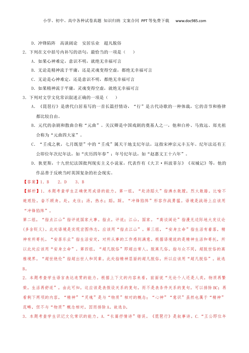 小学、初中、高中各种试卷真题知识归纳文案合同PPT等免费下载www.doc985.com2024年高考语文临考押题卷01(天津卷)(考试时间:150分钟试卷满分:150分)注意事项:1.答卷前,考生务必将自己的姓名、准考证号等填写在答题卡和试卷指定位置上。2.回答选择题时,选出每小题答案后,用铅笔把答题卡上对应题目的答案标号涂黑。如需改动,用橡皮擦干净后,再选涂其他答案标号。回答非选择题时,将答案写在答题卡上。写在本试卷上无效。3.考试结束后,将本试卷和答题卡一并交回第Ⅰ卷(选择题共33分)本试卷共11小题,每小题3分,共33分。在每小题给出的四个选项中,只有一个选项最符合题目要求。评卷人得分一、(9分)阅读下面一段文字,完成下面小题。在历史的进程中,我们同样需要守望者。守望是一种角度。当我这样说时,我已经承认对待历史进程还可以有其他的角度,它们也都有存在的理由。譬如说,你不妨做一个战士,甚至做一个将军,在时代的战场上_____,发号施令。你不妨投身到任何一种潮流中去,去经商,去从政,去称霸学术,统率文化,叱咤风云,_____,去充当各种名目的当代英雄。但是,在所有这些显赫活跃的身影之外,还应该有守望者的寂寞的身影。守望者是这样一种人,他们并不直接投身于时代的潮流,毋宁说往往与一切潮流保持着一个距离,但他们也不是旁观者,相反,对于潮流的来路和去向始终怀着深深的关切。他们关心精神价值甚于关心物质价值,在他们看来,无论个人还是人类,物质再繁荣,生活再舒适,()。所以,他们虔诚地守护着他们心灵中那一块精神的园地,其中珍藏着他们所看重的人生最基本的精神价值,同时警惕地瞭望着人类前方的地平线,注视着人类精神生活的基本走向。在天空和土地日益被拥挤的高楼遮蔽的时代,他们怀着忧虑之心仰望天空,守卫土地,他们守的是人类____的生命之土,望的是人类____的精神之天。1.依次填入文中横线上的成语,全都恰当的一项是()A.赴汤蹈火指点江山安居乐业超世绝伦B.冲锋陷阵指点江山安身立命超凡脱俗C.赴汤蹈火高谈阔论安身立命超世绝伦小学、初中、高中各种试卷真题知识归纳文案合同PPT等免费下载www.doc985.comD.冲锋陷阵高谈阔论安居乐业超凡脱俗2.下列在文中括号内补写的语句,最恰当的一项是()A.如果心神难定,意识不明,就绝无幸福可言B.无论是精神流于平庸,还是灵魂变得空虚,都绝无幸福可言C.无论是心神难定,还是意识不明,都绝无幸福可言D.如果精神流于平庸,灵魂变得空虚,就绝无幸福可言3.下列对文学文化常识叙述正确的一项是()A.《琵琶行》是唐代白居易写的一首长篇抒情诗,“行”是古代诗歌的一种体裁,它的音节和格律都比较自由。B.元代的杂剧和散曲合称“元曲”。关汉卿是中国戏剧的奠基人之一,他和白朴、马致远、郑光祖合称为“元曲四大家”。C.“壬戌之秋,七月既望”中的“壬戌”属天干地支纪年法,这指宋神宗元丰五年。纪年法还有王公即位年次纪年法,如“庆历四年春”;年号纪年法,如“赵惠文王十六年”。D.狄更斯,十九世纪法国批判现实主义小说家,代表作有《大卫·科波菲尔》《双城记》等,他的作品善于反映当时英国复杂的社会现实。【答案】1.B2.D3.B【解析】1.本题考查学生正确使用成语的能力。第一组,“赴汤蹈火”指沸水敢蹚,烈火敢踏。比喻不避艰险,奋不顾身。赴,走往;汤,热水;蹈,踩。“冲锋陷阵”形容作战勇猛。语境是战场上应该用“冲锋陷阵”。第二组,“指点江山”指评说国家大事。指点,评说;江山,国家。“高谈阔论”指漫无边际地大发议论(多含贬义)。此处语境是实现宏图伟志,应该用“指点江山”。第三组,“安身立命”指生活有着落,精神有所寄托。“安居乐业”指生活安定,对所从事的工作感到满意。根据语境说的是精神生活和寄托,所以此处应该用“安身立命”。第四组,“超凡脱俗”即超出常人,脱离凡俗。指与众不同,超脱世俗的高雅境界。“超世绝伦”指超出世人和同辈。此处指精神层面的超凡脱俗,所以应该用“超凡脱俗”。故选B。2.本题考查学生语言表达连贯的能力。根据上下文的内容来看,前面说“无论个人还是人类,物质再繁荣,生活再舒...