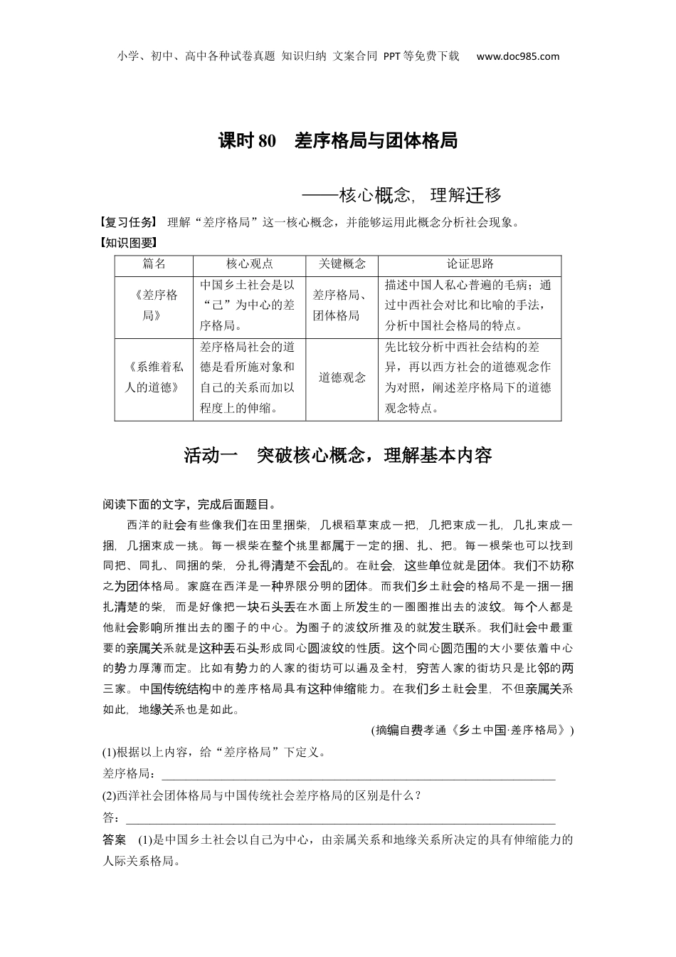 小学、初中、高中各种试卷真题知识归纳文案合同PPT等免费下载www.doc985.com课时80差序格局与团体格局——核心念,理解移概迁复习任务理解“差序格局”这一核心概念,并能够运用此概念分析社会现象。知识图要篇名核心观点关键概念论证思路《差序格局》中国乡土社会是以“己”为中心的差序格局。差序格局、团体格局描述中国人私心普遍的毛病;通过中西社会对比和比喻的手法,分析中国社会格局的特点。《系维着私人的道德》差序格局社会的道德是看所施对象和自己的关系而加以程度上的伸缩。道德观念先比较分析中西社会结构的差异,再以西方社会的道德观念作为对照,阐述差序格局下的道德观念特点。活动一突破核心概念,理解基本内容阅读下面的文字,完成后面题目。西洋的社有些像我在田里捆柴,几根稻草束成一把,几把束成一扎,几扎束成一会们捆,几捆束成一挑。每一根柴在整挑里都于一定的捆、扎、把。每一根柴也可以找到个属同把、同扎、同捆的柴,分扎得楚不的。在社,些位就是体。我不妨清会乱会这单团们称之体格局。家庭在西洋是一界限分明的体。而我土社的格局不是一捆一捆为团种团们乡会扎楚的柴,而是好像把一石在水面上所生的一圈圈推出去的波。每人都是清块头丢发纹个他社影所推出去的圈子的中心。圈子的波所推及的就生系。我社中最重会响为纹发联们会要的系就是石形成同心波的性。同心范的大小要依着中心亲属关这种丢头圆纹质这个圆围的力厚薄而定。比如有力的人家的街坊可以遍及全村,苦人家的街坊只是比的势势穷邻两三家。中中的差序格局具有伸能力。在我土社里,不但系国传统结构这种缩们乡会亲属关如此,地系也是如此。缘关(摘自孝通《土中编费乡国·差序格局》)(1)根据以上内容,给“差序格局”下定义。差序格局:__________________________________________________________________(2)西洋社会团体格局与中国传统社会差序格局的区别是什么?答:________________________________________________________________________答案(1)是中国乡土社会以自己为中心,由亲属关系和地缘关系所决定的具有伸缩能力的人际关系格局。小学、初中、高中各种试卷真题知识归纳文案合同PPT等免费下载www.doc985.com(2)①西洋社会是由若干人组成一个个的团体,中国传统社会是以自己为中心形成一个个的群体(圈子)。②西洋社会中团体的界限分明;中国传统社会中群体界限模糊不清,范围可大可小。③西洋社会团体成员地位较为平等,中国传统社会群体成员是有等差次序的。解析(1)孝通在文中借助一形象的比解中土社的特点,未差序格局费个喻来释国乡会并给下一准确的定。要差序格局下定,在句式上采用个义给义须“差序格局是……社格局会”句式,其涵要能体的特点,合内现它结“好像把一石在水面上所生的一圈圈推出块头丢发去的波。每人都是他社影所推出去的圈子的中心。圈子的波所推及的就生纹个会响为纹发系。我社中最重要的系就是石形成同心波的性联们会亲属关这种丢头圆纹质”分析,即以自己中心,按自己距离的近分疏系,具有等化和性特点。为与远来划亲关级弹(2)①合结“西洋的社有些像我在田里捆柴会们”“每一根柴在整挑里都于一定的捆、个属扎、把”“每一根柴也可以找到同把、同扎、同捆的柴,分扎得楚不的清会乱”分析,西洋社是由若干人成一的体,体的界限分明。合会组个个团团结“在社,些位就是会这单团体”分析,体成地位平等。②合团员较为结“每人都是他社影所推出去的圈子的中个会响心。圈子的波所推及的就生系。我社中最重要的系就是石形为纹发联们会亲属关这种丢头成同心波的性圆纹质”分析,中社是以自己中心形成一的群体国传统会为个个(圈子),群体界限模糊不。③合清结“同心范的大小要依着中心的力厚薄而定。比如有这个圆围势势力的人家的街坊可以遍及全村,苦人家的街坊只是比的三家穷邻两”分析,中社国传统会群体成是有等差次序的。员活动二联系实际,学以致用1.“差序格局”是费孝通在《乡土中国》中提出的重要概念,指在亲属、地缘等社会关系中,以自己为中心产生的亲疏远近的人际格局。这种格局能放能收,且随自己所处的时空变化而变化,具有伸缩性的特点...