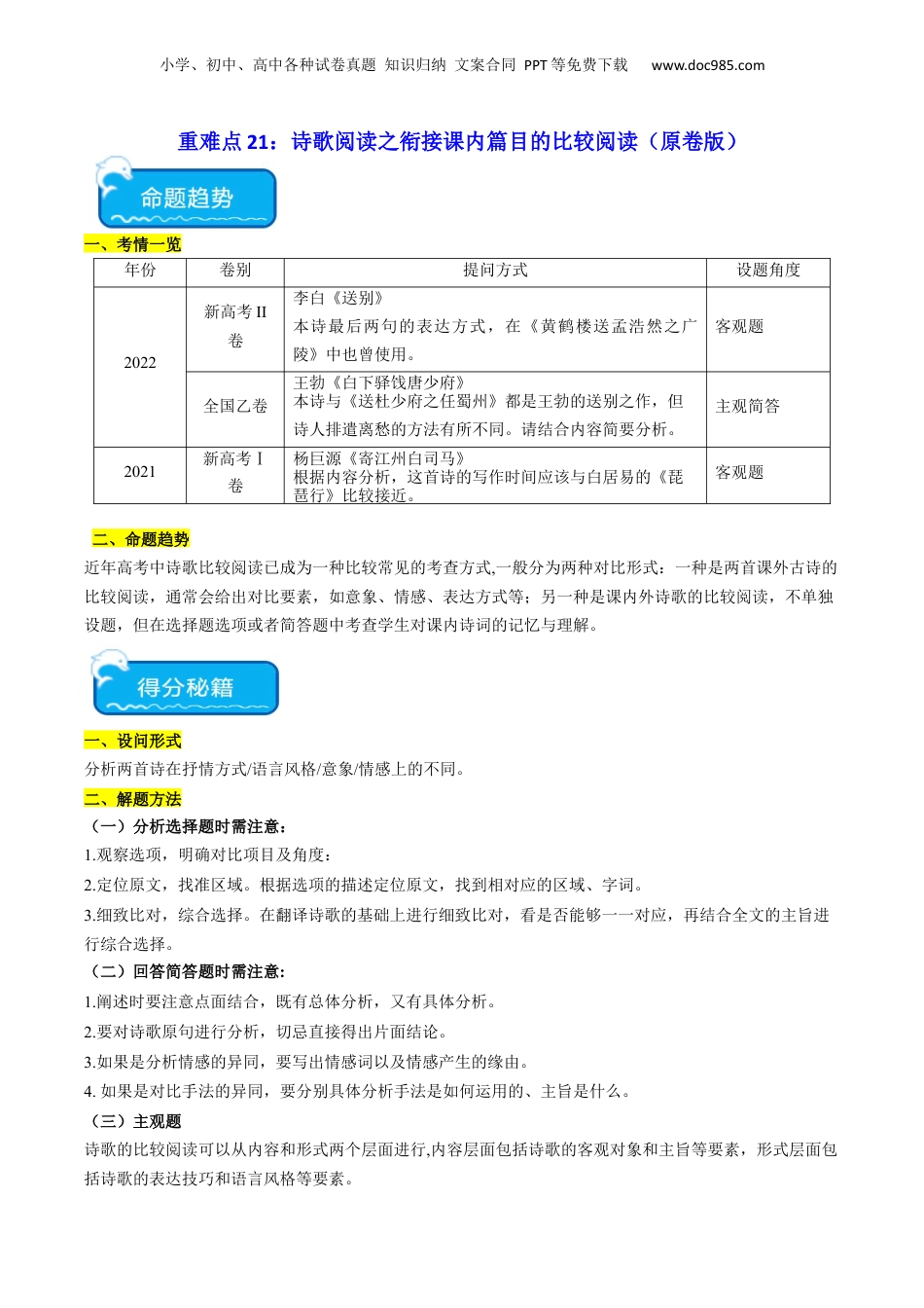 小学、初中、高中各种试卷真题知识归纳文案合同PPT等免费下载www.doc985.com重难点21:诗歌阅读之衔接课内篇目的比较阅读(原卷版)一、考情一览年份卷别提问方式设题角度2022新高考II卷李白《送别》本诗最后两句的表达方式,在《黄鹤楼送孟浩然之广陵》中也曾使用。客观题全国乙卷王勃《白下驿饯唐少府》本诗与《送杜少府之任蜀州》都是王勃的送别之作,但诗人排遣离愁的方法有所不同。请结合内容简要分析。主观简答2021新高考Ⅰ卷杨巨源《寄江州白司马》根据内容分析,这首诗的写作时间应该与白居易的《琵琶行》比较接近。客观题二、命题趋势近年高考中诗歌比较阅读已成为一种比较常见的考查方式,一般分为两种对比形式:一种是两首课外古诗的比较阅读,通常会给出对比要素,如意象、情感、表达方式等;另一种是课内外诗歌的比较阅读,不单独设题,但在选择题选项或者简答题中考查学生对课内诗词的记忆与理解。一、设问形式分析两首诗在抒情方式/语言风格/意象/情感上的不同。二、解题方法(一)分析选择题时需注意:1.观察选项,明确对比项目及角度:2.定位原文,找准区域。根据选项的描述定位原文,找到相对应的区域、字词。3.细致比对,综合选择。在翻译诗歌的基础上进行细致比对,看是否能够一一对应,再结合全文的主旨进行综合选择。(二)回答简答题时需注意:1.阐述时要注意点面结合,既有总体分析,又有具体分析。2.要对诗歌原句进行分析,切忌直接得出片面结论。3.如果是分析情感的异同,要写出情感词以及情感产生的缘由。4.如果是对比手法的异同,要分别具体分析手法是如何运用的、主旨是什么。(三)主观题诗歌的比较阅读可以从内容和形式两个层面进行,内容层面包括诗歌的客观对象和主旨等要素,形式层面包括诗歌的表达技巧和语言风格等要素。小学、初中、高中各种试卷真题知识归纳文案合同PPT等免费下载www.doc985.com1.明确对比的要求:是对比相同点还是不同点,还是异同点。2.明确对比的角度:应从哪些角度展开对比。一般题干会明确指出对比角度,角度的个数不等。3.整体感知,明确异同,根据题干所给的角度,从诗歌的题目、作者、注释等内容出发,整体比较诗的相同点与不同点。4.结合诗句,具体分析:根据某一个或某几个角度,先寻找能够体现相同点的诗句,结合该诗体分析两首诗的相同点在哪里;再寻找能够体现不同点的诗句,分别结合诗句进行具体的分析。(2022全国乙卷真题再现)阅读下面这首唐诗,完成下面小题。白下驿饯唐少府王勃下驿穷交日,昌亭旅食年。相知何用早?怀抱即依然。浦楼低晚照,乡路隔风烟。去去如何道?长安在日边。重难点突破:本诗与《送杜少府之任蜀州》都是王勃的送别之作,但诗人排遣离愁的方法有所不同。请结合内容简要分析。第一步:认真审题,明确问题的重点以及考查的方向。第二步:根据题干要求,结合文本,找出本诗和《送杜少府之任蜀州》的排遣离愁的句子。古诗词的抒情方法:直接抒情和间接抒情。直接抒情也叫直抒胸臆,由作者直接对有关人物和事件等表明爱憎态度。间接抒情又分为借景抒情、借物抒情、借古抒情和情景交融。第三步:结合具体语境,仔细分析诗句是如何排遣离愁别绪,抒发感情的。第四步:整理答案,根据分值分点,形成文字。作答步骤第一步:认真审题,明确问题的重点以及考查的方向。小学、初中、高中各种试卷真题知识归纳文案合同PPT等免费下载www.doc985.com第二步:根据题干要求,结合文本,找出两首诗中需要比较的诗句。第三步:结合具体语境,仔细分析诗句是如何体现问题的。第四步:整理答案,根据分值分点,形成文字。古代诗歌阅读(一)(2022上·广东梅州·高三校考开学考试)阅读下面这首唐诗,完成下面小题。送别李白[唐代]寻阳五溪水,沿洄直入巫山里。胜境由来人共传,君到南中自称美。送君别有八月秋,飒飒芦花复益愁。云帆望远不相见,日暮长江空自流。※1.下列对这首诗的理解和赏析,不正确的一项是()A.根据本诗内容可知,诗人的友人即将乘船出发,沿水路驶往三峡方向。B.诗人表示友人将去的地方景色优美,而友人的风采正与这美景相称。C.本诗最后两句的表达方式,在《黄鹤楼送孟浩然之广...
