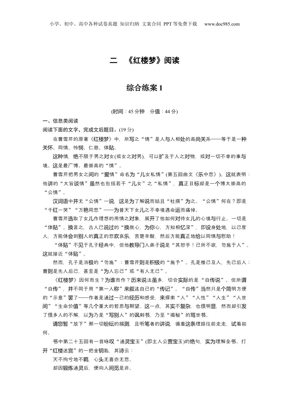 小学、初中、高中各种试卷真题知识归纳文案合同PPT等免费下载www.doc985.com二《红楼梦》阅读综合练案1(:时间45分分:钟值44分)一、信息类阅读阅读下面的文字,完成文后题目。(19分)在曹雪芹的原著《》中,所之红楼梦写“情”是人人相的高系——等于是一与处尚关种、同情、怜、仁慈、体。关怀悯贴情,不限于男之女这种绝对(或女之男对),可以及于人之物,或一切不幸的事扩对对与境。是最广博、最崇高的这“情”。曹雪芹把男女之的间“情爱”命名为“女私情儿”(第五回曲文《中悲》乐)。就表明这:他的讲“大旨情谈”然也包括若干虽“女儿”之“私情”,正目却是一博大崇高的真标个“公情”。中无汉词语并“公情”一,是了解而姑且说这为说“杜撰”之。为“公情”何在?即是“千一哭红”“万同悲艳”——普天下女之不幸境遇命而痛悼。为儿运曹雪芹取了女作理想的用情之象,展了他如何待女的心境行止。一切是选儿对开对儿与“体贴”。言之,古人已的换说过“我心,心,方知相深换为你忆”,即身地,以己度设处人,方能体到人的正的悲哀,苦楚辛酸,然后方能正地以同情慰助!会别真欢乐真给与“体贴”不于孔子典中,但他人弟子是见经教导门说“其恕乎!己所不欲,勿施于人”。就接近这“体贴”。然而,孔子是消的极“勿施”;曹雪芹是的则积极“施予”。孔是推己及人,先己后人;曹是先人后己,甚至是则“人忘己为”或“有人无己”。《》因何而生?而作?法多,切合的是红楼梦为谁历来说虽实际“自传说”。但所谓“自传”,不同于用并“第一人称”述自己的来叙“传记”。“自传”然只是明方便当个简的“示意”了——作者是通一己的和感受,探索罢过经历来“人”“人性”“人生”“人世间”“生命价值”等几重大的哲思期望。一点,其不,也很明,然而却引个与这实复杂显发了很多人的不解,以乃是为“人写别”的刺,乃至讽书“揭秘”的世。骂书请您暂“放下”那一切的揣,且听者的,循着理路往前走走,看如纷纭测笔讲说这条试何。中第二十五回有一首咏书叹“通玉灵宝”(即主人公玉贾宝)的句,理解全、打绝实为书开“迷红楼宫”的一把金匙,其云:钥诗天不拘兮地不,心无喜亦无悲。羁头却因通后,便向人是非。锻炼灵间觅小学、初中、高中各种试卷真题知识归纳文案合同PPT等免费下载www.doc985.com好了,我者的,这诉与们读“大旨”已明确无了:此石皇之,本是误经娲炼“天补”之材,不想遭弃,自自悼,不知已几千几万月了。日忽僧道二仙,坐于此单单惭历岁这来处“高谈阔论”。先是些说“云山海,神仙玄幻之事雾”,次后遂及人世的谈“富贵荣华”的事。只因一,便乐这来“打动”了石的头“凡心”,欲下世投胎,去务“受享”那人世的间快。乐然而,等到的到了人世,目睹身,百般滋味,方知二仙之不差:人世不如它真间亲诫并所遐想的那美,生之境、之命,甚少,甚而苦多——女尤其如是!么众处运乐实儿其次,石之,一头来寻“富柔之贵温乡”,原为“受享”,但一,又知物享经亲历质乐一点也不能足他的性之所求,故曰儿满灵“富不知贵乐业”。玉贾宝“别号”叫作“富贵闲人”,何?解以此乃义浅为“奇福”:又富又暇!贵闲完全了!雪芹妙是:于富利中,我是无的错笔说贵禄场缘“空闲”人,无交涉!两他又号“无事忙”,此又何?义原,来“富人贵闲”是富和无之意,此之乃既与财荣誉关谓“无所事事”,又即我之所忙,不是奔利名位,而是了竞禄为“无事之事”而忙——了女而忙,的悲离为众儿为她们欢合而焦忧伤虑……一句,他要的是人逸士的高精神生活,而世俗的价念是抵的。是以话过诗层这与值观触世人嘲诽谤讥为“痴呆疯傻”。人的心是十分痛苦的。这种内于是石悟了:皇石天,原世利人,身石,原非头娲炼补为济为头为“己”而,依来还应循皇意,以娲遗“利物人济”事。为业悟到里,才生了一巨大的这这发个“情”字!情,是人的,无私的,忘我的。为情和欲正是相的针锋对实质(理念行与为),而“外相”有相混,世俗常人,往往不辨而妄思。时此,石矢志以从头“情”己任,乃至可之为称为“情教”的主,博施的教“情圣”!可以毫不皇其地:一部《》,是演情而辨欲之。张词说红楼梦书(摘自周汝昌...
