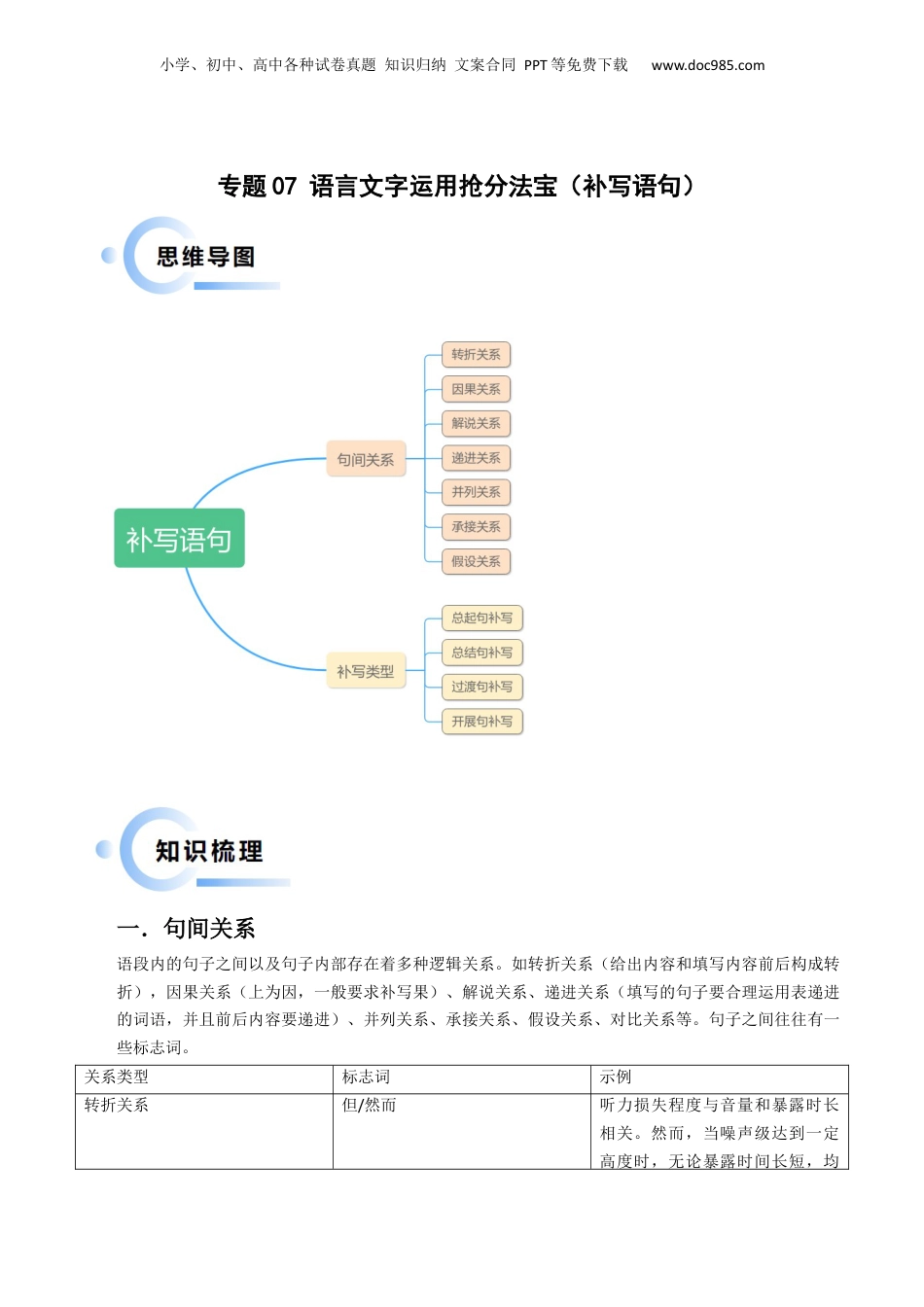 小学、初中、高中各种试卷真题知识归纳文案合同PPT等免费下载www.doc985.com专题07语言文字运用抢分法宝(补写语句)一.句间关系语段内的句子之间以及句子内部存在着多种逻辑关系。如转折关系(给出内容和填写内容前后构成转折),因果关系(上为因,一般要求补写果)、解说关系、递进关系(填写的句子要合理运用表递进的词语,并且前后内容要递进)、并列关系、承接关系、假设关系、对比关系等。句子之间往往有一些标志词。关系类型标志词示例转折关系但/然而听力损失程度与音量和暴露时长相关。然而,当噪声级达到一定高度时,无论暴露时间长短,均小学、初中、高中各种试卷真题知识归纳文案合同PPT等免费下载www.doc985.com会产生永久性听力损害。因果关系因为/所以/究其原因,就是/因此/是因为/以致食物中提供能量的三大营养素,即蛋白质、碳水化合物和脂肪,人体不能直接吸收利用,因为它、它们均以大分子形式存在,必须消化分解成小分子才能被吸收利用。解说关系比如/以,,,,,,,为例更令人称奇的是有些花的颜色可以一日数变,比如有一种牵牛花清晨是分红色,之后变成紫红色,最后变成蓝色。递进关系不仅/而且/不仅仅.....甚至.气候是一种复杂的自然现象,不仅决定着土壤、被类型的形成,改变着地表形态,而且还影响着人类的活动。并列关系并非....../既然......又/还/也是/还能进化史上最早出现的根,作用并非吸收水分和吸取养料,而是固定植株的位置,这种早期类型的根被称为假根。承接关系就/从人们对此有一种根深蒂固的看法,以为变色龙想要变成什么颜色,就可以变成什么颜色。其实,事实并非如此。假设关系倘若/如果/即使......仍然任何时候开始锻炼都不会太晚,即使进入老年阶段,记忆里已经开始衰退,你仍然可以通过适当增加有氧运动来加以改善。二.补写类型(一)总起句补写所谓总起句,即能领起或概括整个语段或下文层次的语句。这时的语句补写,实际上就是一个压缩语段题,补写的句子只要能概括语段或下文内容即可。当然,要考虑到前后句子的衔接连贯问题。(二)总结句补写所谓总结句,就是指整个语段或语段中某一个层次内容做出总结的句子。在语句补写题中,这样的句子前面通常有“因此”“所以”等提示性语言。总结句的补写,有的是对前面内容的归纳、总结,有的则是对前面具体内容的概括与升华。总结既要准确,又要全面。尤其是对上文两至三个层次的内容总结,补写时不可漏掉要点。小学、初中、高中各种试卷真题知识归纳文案合同PPT等免费下载www.doc985.com(三)过渡句补写所谓过渡句,就是承接或总结上面的内容,同时提示或领起下面的内容的句子。对过渡句的补写,要注意内容上的前后关联,结构上的承前启后,恰当地使用表各种关系的连词和关联词。(四)开展句补写所谓展开句,就是对一个句子展开说明或论述,前半句已有,要求接着往下写,再写的句子就是展开句。展开句的补写首先要明确陈述对象,即写什么,根据“瞻前顾后”的原则,在上下文找出陈述对象,然后根据“瞻前顾后”的原则揣测出陈述内容,即陈述对象的推导:一是根据上下文逻辑的发展推导出所补写语句的内容,做到内容上扣得紧;二是由与上下文相关语句、句式的照应推导出所补写语句的句式及形式,做到形式上接得上。补写语句(2023全国1卷)阅读下面的文字,完成下面小题。阅读下面的文字,完成下面小题。日常生活中,我们常常会因为忘记重要信息而懊恼,幻想着要是能过目不忘该多好啊!其实,我们更应该庆幸A,因为遗忘可以降低记忆带来的认知负荷,使认知系统能够更加高效地工作。而超强记忆力往往是以牺牲抽象、泛化能力为代价的。从下面例子中可以看出一些端倪。有一位记者,①拥有人们只能望其项背的超强记忆力。②他虽然能轻松地记住一长串数字,③却发现不了其中的规律;④他脑海里充满各种孤立的事实,⑤却不能归纳出一些模式将它们组织起来。⑥这促使他不能理解隐喻等修辞手法,⑦甚至复杂一点的句子。⑧记忆大师奥布莱恩曾多次获得世界记忆锦标赛冠军,⑨虽然他的阅读理解能力比常人低很多,⑩听课的时候也很难集中注意力。也许正是牺牲了一部分记忆,我们才有了独一无二的归纳和...