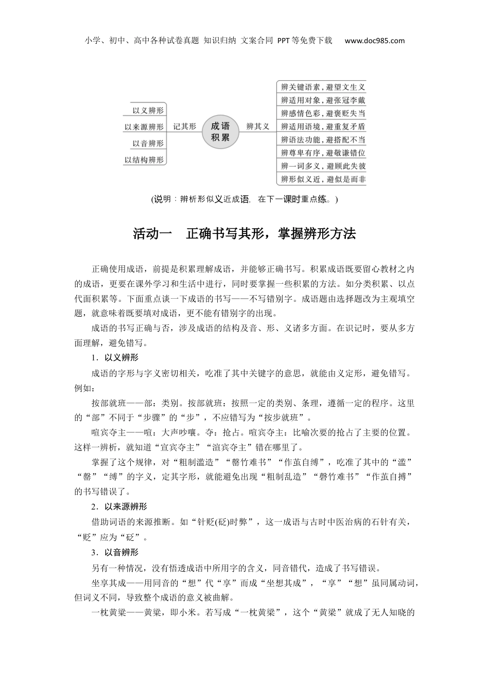 小学、初中、高中各种试卷真题知识归纳文案合同PPT等免费下载www.doc985.com课时62正确使用成语(一)——累有法,形积记识义复习任务掌握积累成语的方法,做到准确书写其形,理解其义,规避成语使用中常见误区。考情微观年份卷别所考成语提问方式命题特点2022全国甲卷(示例)天翻地覆遥不可及身临其境一览无余请在文中横线处填入恰当的成语①从2016年到2022年,高考几乎每年都考查成语,可谓是全国卷的必考点。②所选成语大都是常见常用易错的成语,尤其是近义成语。③放在大的语段情境中考查。④与病句、标点等一同考查。⑤值得注意的是,2022年由选择题改为主观填空题的题型变化,它标志着考查重点由过去的近义成语辨析转向常见常用成语的积累运用,难度空前加大。全国乙卷(示例)顺理成章难以言喻迫不及待新高考Ⅰ卷(示例)不解之缘秘而不宣在所难免新高考Ⅱ卷(示例)扣人心弦循循善诱热火朝天2021全国甲卷纸上谈兵—形同虚设受益匪浅—不虚此行自己动手—身体力行勤俭节约—吃苦耐劳选择全都恰当的一项全国乙卷近在咫尺—触手可及杞人忧天—空穴来风泾渭分明—非此即彼源源不断—取之不尽新高考Ⅰ卷交相辉映—相互映衬喧闹无比—热闹非凡络绎不绝—连绵不断原汁原味—汁醇味正新高考Ⅱ卷望而却步—踌躇不前不可低估—不胜枚举不言而喻—心照不宣寥寥无几—极其稀缺知识图要小学、初中、高中各种试卷真题知识归纳文案合同PPT等免费下载www.doc985.com(明:辨析形似近成,在下一重点。说义语课时练)活动一正确书写其形,掌握辨形方法正确使用成语,前提是积累理解成语,并能够正确书写。积累成语既要留心教材之内的成语,更要在课外学习和生活中进行,同时要掌握一些积累的方法。如分类积累、以点代面积累等。下面重点谈一下成语的书写——不写错别字。成语题由选择题改为主观填空题,就意味着既要填对成语,更不能有错别字的出现。成语的书写正确与否,涉及成语的结构及音、形、义诸多方面。在识记时,要从多方面理解,避免错写。1.以义辨形成语的字形与字义密切相关,吃准了其中关键字的意思,就能由义定形,避免错写。例如:按部就班——部:类别。按部就班:按照一定的类别、条理,遵循一定的程序。这里的“部”不同于“步骤”的“步”,不应错写为“按步就班”。喧宾夺主——喧:大声吵嚷。夺:抢占。喧宾夺主:比喻次要的抢占了主要的位置。这样一辨析,就知道“宣宾夺主”“渲宾夺主”错在哪里了。掌握了这个规律,对“粗制滥造”“罄竹难书”“作茧自缚”,吃准了其中的“滥”“罄”“缚”的字义,定其字形,就能避免出现“粗制乱造”“磬竹难书”“作茧自搏”的书写错误了。2.以来源辨形借助词语的来源推断。如“针贬(砭)时弊”,这一成语与古时中医治病的石针有关,“贬”应为“砭”。3.以音辨形另有一种情况,没有悟透成语中所用字的含义,同音错代,造成了书写错误。坐享其成——用同音的“想”代“享”而成“坐想其成”,“享”“想”虽同属动词,但词义不同,导致整个成语的意义被曲解。一枕黄粱——黄粱,即小米。若写成“一枕黄梁”,这个“黄梁”就成了无人知晓的小学、初中、高中各种试卷真题知识归纳文案合同PPT等免费下载www.doc985.com天外之物,成语的本义也就推导不出来了。4.以结构辨形有些成语的内部存在或并列或对照或对比的对称关系,也可以以此来辨析字形。如“山清水秀”,“山”与“水”相对,“清”与“秀”相对,组成“清秀”一词;如把“清”写成“青”,则“青秀”一词显然讲不通,于是可判定“青”为别字。又如“青山绿水”,“青”与“绿”相对,合起来“青绿”讲得通;如把“青”写成“清”,则“清绿”就讲不通了,于是可判定“清”为别字。上例为并列关系,再看对比关系。例如“貌和神离”,“貌”与“神”相对,“和”当与“离”相对,而“和”与“离”构不成对比关系,于是可以判定“和”为别字,应为“合”。1.请纠正下列成语中的错别字,并注意纠正方法。①世外桃园:________________________________________________________________②箭拔弩张:________________________________________________________________③灸手可热:__...