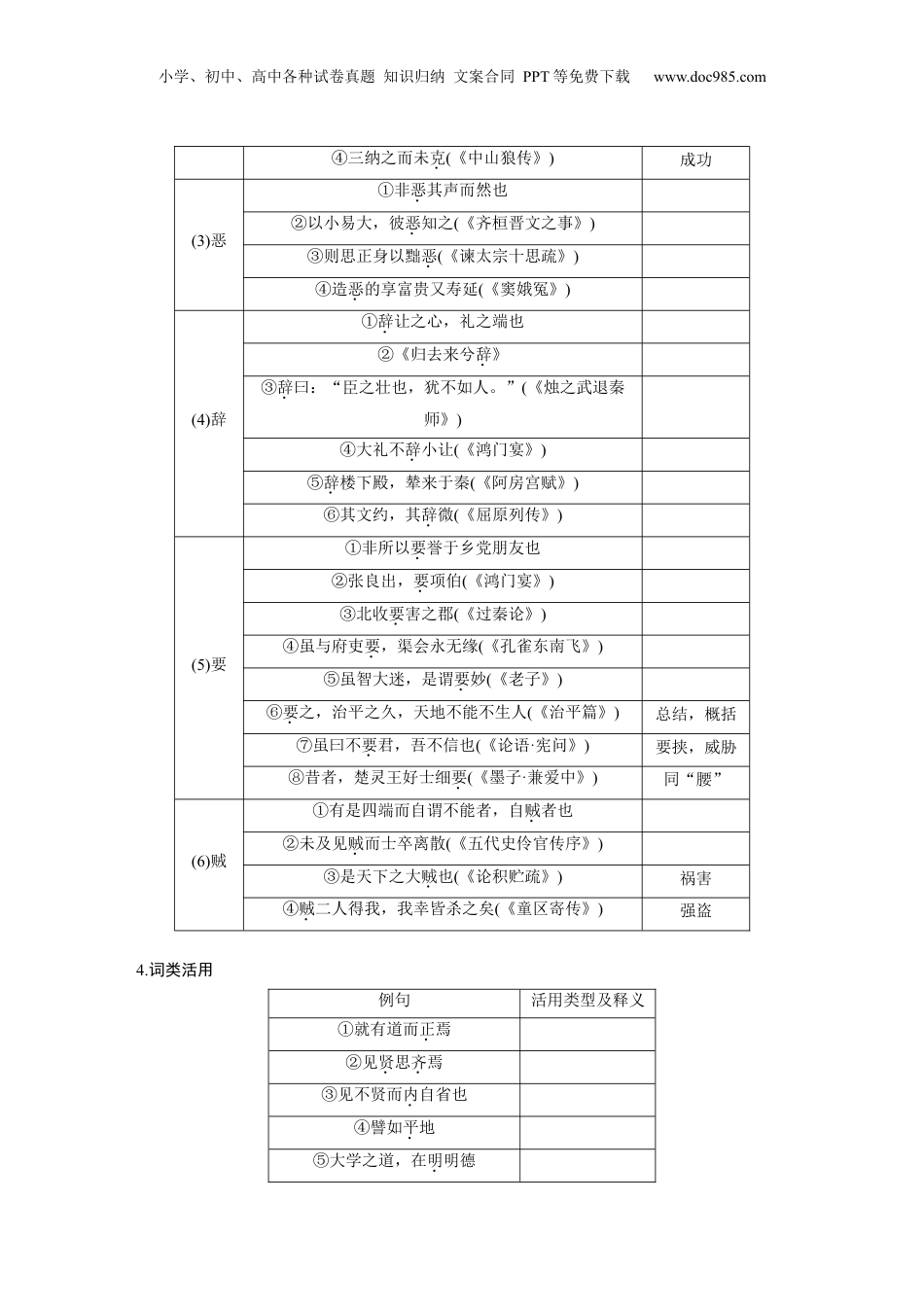 小学、初中、高中各种试卷真题知识归纳文案合同PPT等免费下载www.doc985.com学案30《〈论语〉十二章》《大学之道》《人皆有不忍人之心》一、基础梳理1.通假字例句指出通假本字及意义①知者不惑②非所以内交于孺子之父母也③若火之始然2.古今异义词词语例句解析(古今义)①平地譬如平地古义:___________________今义:平坦的土地②小子小子何莫学夫《诗》古义:___________________今义:男孩子;人(用于男性,含轻蔑意)③大学大学之道古义:____________________今义:实施高等教育的学校的一种3.多义实词词语例句意义(1)安①居无求安②静而后能安③思国之安者,必积其德义(《谏太宗十思疏》)④卮酒安足辞(《鸿门宴》)⑤然后得一夕安寝(《六国论》)⑥衣食所安,弗敢专也(《曹刿论战》)(2)克①克己复礼为仁②能克终者盖寡(《谏太宗十思疏》)③既克,公问其故(《曹刿论战》)小学、初中、高中各种试卷真题知识归纳文案合同PPT等免费下载www.doc985.com④三纳之而未克(《中山狼传》)成功(3)恶①非恶其声而然也②以小易大,彼恶知之(《齐桓晋文之事》)③则思正身以黜恶(《谏太宗十思疏》)④造恶的享富贵又寿延(《窦娥冤》)(4)辞①辞让之心,礼之端也②《归去来兮辞》③辞曰:“臣之壮也,犹不如人。”(《烛之武退秦师》)④大礼不辞小让(《鸿门宴》)⑤辞楼下殿,辇来于秦(《阿房宫赋》)⑥其文约,其辞微(《屈原列传》)(5)要①非所以要誉于乡党朋友也②张良出,要项伯(《鸿门宴》)③北收要害之郡(《过秦论》)④虽与府吏要,渠会永无缘(《孔雀东南飞》)⑤虽智大迷,是谓要妙(《老子》)⑥要之,治平之久,天地不能不生人(《治平篇》)总结,概括⑦虽曰不要君,吾不信也(《论语·宪问》)要挟,威胁⑧昔者,楚灵王好士细要(《墨子·兼爱中》)同“腰”(6)贼①有是四端而自谓不能者,自贼者也②未及见贼而士卒离散(《五代史伶官传序》)③是天下之大贼也(《论积贮疏》)祸害④贼二人得我,我幸皆杀之矣(《童区寄传》)强盗4.词类活用例句活用类型及释义①就有道而正焉②见贤思齐焉③见不贤而内自省也④譬如平地⑤大学之道,在明明德小学、初中、高中各种试卷真题知识归纳文案合同PPT等免费下载www.doc985.com⑥先齐其家/先正其心/先诚其意5.特殊句式例句句式特点(指出标志词)①见不贤而内自省也②仁以为己任,不亦重乎③有一言而可以终身行之者乎④人而不仁,如乐何⑤克己复礼为仁6.文化常识(1)小人:地位低下的人,平民百姓,是统治者对劳动者的蔑称;又指_________________的人。前者与“大人”相对,后者与“君子”相对。(2)士:在春秋时期,士在政治地位上居于卿大夫与庶民之间,处于贵族的最低层。也泛指____________。(3)《诗》,即《诗三百》,后成为儒家经典,被称为《诗经》,是中国第一部________总集,在中国乃至世界文化史上都占有重要地位。孔子曾多次论诗,有明确的诗观,并把《诗经》作为弟子学习的基本典籍。(4)《礼记》:又名《小戴礼记》《小戴记》,成书于汉代,为西汉礼学家__________所编。《礼记》是中国古代一部重要的______________选集,共二十卷四十九篇,书中内容主要写__________(时期)的礼制,体现了先秦儒家的哲学思想、教育思想、政治思想、美学思想,是研究先秦社会的重要资料,是一部__________家思想的资料汇编。(5)《大学》:原是《礼记》第四十二篇,相传为__________所作,是中国古代一部讨论教育理论的重要著作。南宋朱熹作《大学章句》,最终和__________《论语》《孟子》并称“四书”。二、重点巩固(一)名句默写1.补写出下列句子中的空缺部分。(1)(2022·北京)近代以来,中华民族饱受列强欺凌,因此绝不会将自己曾经遭受的苦难强加给其他国家与民族,正如《论语》所谓:“______________________,_____________________。”(2)《论语·泰伯》中,“____________________,______________________”两句说的是士人不能不志向远大,意志坚定,因为他们肩负着重大的使命,路程又很遥远。(3)《〈论语〉十二章》中,孔子用堆土成山这一比喻,说明了功亏一篑和持之以恒的深刻道理,其中功亏一篑是因为“________________”,而能够持之以恒是因为“___________...