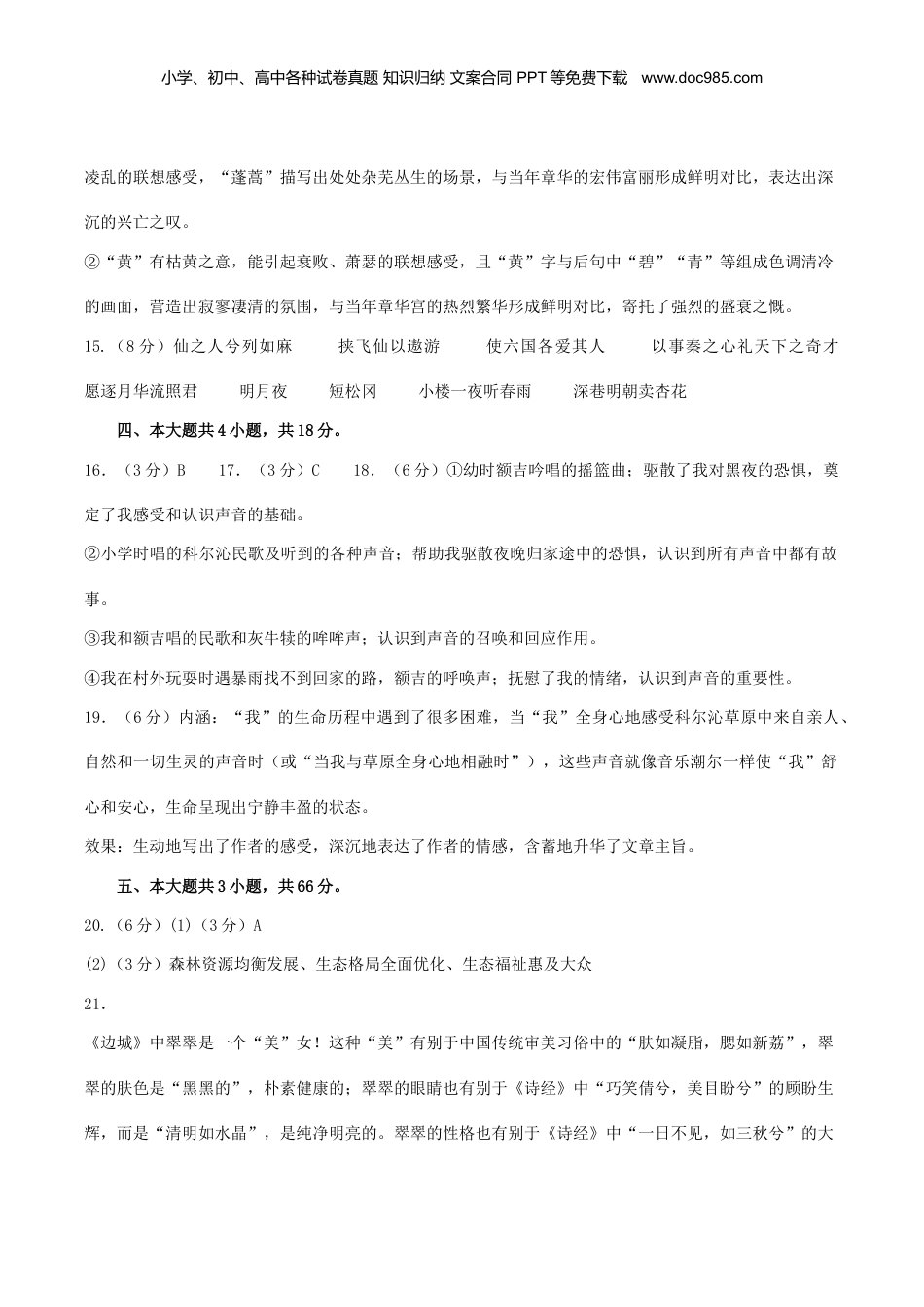 小学、初中、高中各种试卷真题知识归纳文案合同PPT等免费下载www.doc985.com2024年高考临考押题卷02(北京卷)语文·参考答案一、本大题共5小题,共18分。1.(3分)C2.(3分)B3.(3分)D4.(3分)D5.(6分)学习理念:(1)以解决真实问题为学习路径。例如,寻找循线原理在现实生活中的应用。(2)整合了多学科内容。例如,设计中算法分析、三原色原理、环保材料、撰写调查研究报告涉及信息技术、物理、化学、语文等学科。(3)自主合作的学习方式。例如,设计中将学生分为三组,各自分工,合作交流。原因:当前时代具有易变性、不确定性、复杂性、模糊性,未来的人才需要创造性地应用跨学科知识解决真实情境中的复杂问题,该设计的学习理念有利于培养这样的人才。二、本大题共6小题,共28分。6.(3分)A7.(3分)C8.(3分)B9.(3分)A10.(6分)(1)相同点:他们都认为礼乐应相互配合,方能发挥音乐的教化作用。(2)不同点:阮籍认为:音乐可以开启百姓的情怀,平和人民的内心世界,统一百姓的意志,使人们各安其位,各安其生,自然向善,改变风俗,从而实现教化目的。嵇康认为:音乐可以抑制人的情感放纵,引导人的欲望,从而使人民“从善日迁”,达到教化目的。11.(10分)(1)(4分)(李充)劳:劳心、操劳。(苏轼)劳:使……勤勉。(2)(3分)示例1:选择李充的观点:爱他就不能不为他操劳。材料②中说,做子女的遇到父母的做法不正确,应该想办法委婉提出来加以劝谏。可见爱他就要为他劳心。示例2:选择苏轼的观点:爱他就要勉励他勤勉。如材料③说,如果勉励他努力学习,不断向好,这就是君子之爱;如果只是溺爱、骄纵,这就是小人之爱,是无原则的迁就。(3)(3分)触龙的观点与苏轼的观点相符。触龙劝说赵太后为长安君做长远的打算,让他到齐国去做人质,勉励他承担国家的责任,将来就能让他自立于赵国。这样的爱就是苏轼所说的,爱他就要勉励他勤勉。三、本大题共4小题,共20分。12.(3分)B13.(3分)D14.(6分)①“蓬”是平凡微贱的野草,且“蓬”字能引起干枯、小学、初中、高中各种试卷真题知识归纳文案合同PPT等免费下载www.doc985.com凌乱的联想感受,“蓬蒿”描写出处处杂芜丛生的场景,与当年章华的宏伟富丽形成鲜明对比,表达出深沉的兴亡之叹。②“黄”有枯黄之意,能引起衰败、萧瑟的联想感受,且“黄”字与后句中“碧”“青”等组成色调清冷的画面,营造出寂寥凄清的氛围,与当年章华宫的热烈繁华形成鲜明对比,寄托了强烈的盛衰之慨。15.(8分)仙之人兮列如麻挟飞仙以遨游使六国各爱其人以事秦之心礼天下之奇才愿逐月华流照君明月夜短松冈小楼一夜听春雨深巷明朝卖杏花四、本大题共4小题,共18分。16.(3分)B17.(3分)C18.(6分)①幼时额吉吟唱的摇篮曲;驱散了我对黑夜的恐惧,奠定了我感受和认识声音的基础。②小学时唱的科尔沁民歌及听到的各种声音;帮助我驱散夜晚归家途中的恐惧,认识到所有声音中都有故事。③我和额吉唱的民歌和灰牛犊的哞哞声;认识到声音的召唤和回应作用。④我在村外玩耍时遇暴雨找不到回家的路,额吉的呼唤声;抚慰了我的情绪,认识到声音的重要性。19.(6分)内涵:“我”的生命历程中遇到了很多困难,当“我”全身心地感受科尔沁草原中来自亲人、自然和一切生灵的声音时(或“当我与草原全身心地相融时”),这些声音就像音乐潮尔一样使“我”舒心和安心,生命呈现出宁静丰盈的状态。效果:生动地写出了作者的感受,深沉地表达了作者的情感,含蓄地升华了文章主旨。五、本大题共3小题,共66分。20.(6分)(1)(3分)A(2)(3分)森林资源均衡发展、生态格局全面优化、生态福祉惠及大众21.《边城》中翠翠是一个“美”女!这种“美”有别于中国传统审美习俗中的“肤如凝脂,腮如新荔”,翠翠的肤色是“黑黑的”,朴素健康的;翠翠的眼睛也有别于《诗经》中“巧笑倩兮,美目盼兮”的顾盼生辉,而是“清明如水晶”,是纯净明亮的。翠翠的性格也有别于《诗经》中“一日不见,如三秋兮”的大小学、初中、高中各种试卷真题知识归纳文案合同PPT等免费下载www.doc985.com胆泼辣,是文静内敛的。示例:我认为表达能...