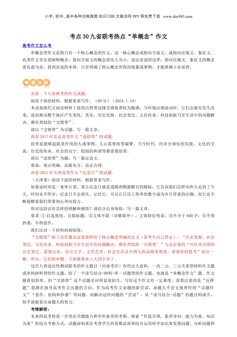 小学、初中、高中各种卷真知文案合同试题识归纳PPT等免下费载www.doc985.com考点30九省联考热点“单概念”作文高考作文怎么考单概念型作文是指只有一个核心概念的作文,这一核心概念或指向字面义,或指向比喻义、象征义。此类作文首先需阐释概念:指向字面义的概念需化大为小,划定论说的边界;指向比喻义、象征义的概念需化虚为实,找到论述的本体。只有明确了核心概念所指的现象或事物,才能准确立论说理。先看一下九省联考的作文试题:阅读下面的材料,根据要求写作。(60分)(2024.1.19)本试卷现代文阅读材料Ⅰ提到自然带边缘交错地带较为敏感,当环境出现波动时,它们会最先发生改变,进而推动整个地区产生变化,其实,历史发展、社会变迁、文化传承、科技创新乃至生活中的问题解决,都有类似的“交错带”。请以“交错带”为话题,写一篇文章。再看2017年北京高考作文“说纽带”的试题:纽带是能够起联系作用的人或事物。人心需要纽带凝聚。当今时代,经济全球化的发展、文化的交流、历史的传承、社会的安宁、校园的和谐等都需要纽带。请以“说纽带”为题,写一篇议论文。要求:观点明确,论据充分,论证合理。再看2021年天津高考作文“纪念日”的试题:(天津卷)阅读下面的材料,根据要求写作。如果说时间是一条单行道,那么纪念日就是道路两侧最醒目的路标,它告诉我们怎样从昨天走到了今天。时间永不停步,纪念日不会消失。记住它,可以让日历上简单的数字成为岁月厚重的注脚,而它也不断提醒着我们带着初心奔向前方。你对这段话有怎样的理解和感悟?请结合自身体验,写一篇文章。要求:①自选角度,自拟标题;②文体不限(诗歌除外),文体特征明显;③不少于800字;④不得抄袭,不得套作。我们比对一下材料的相似度:“交错带”除了没有像北京卷那样给了核心概念明确的定义(需考生自己界定),“历史发展、社会变迁、文化传承、科技创新乃至生活中的问题解决,都有类似的‘交错带’”与北京卷的“可以从中国的历史变迁、思想文化、语言文字、文学艺术、社会生活及中国人的品格等角度,谈谈你的思考”如出一辙。所以,它们的审题、立意就基本上大同小异了。这次九省适应性测试联考的作文题目(河南考区)有些出人意料,一改二元、三元关系型材料作文题或单纯材料型的作文题,给了一个读写结合+材料+单一话题型的作文题。也就是“单概念作文”题。作文题看似简单,但“交错带”这个话题名词明显很陌生,写好这个作文有一定难度。需要注意的是“反押题”思路在指导高考作文出题的方向。作为高考作文命题的新尝试,命题人不会无视曾经的“话题作文”“套作、宿构和抄袭”等问题。而解决这些问题的“尝试”,从“读写结合+话题”的题目构成中,似乎就能看出命题人的努力。考情解密:未来的高考将进一步突出关键能力和学科素养的考察。探索“价值引领、素养导向、能力为重、知识为基”的综合考察方式,试题命制重在考查学生的思维品质和综合运用所学知识来发现问题、分析问题和小学、初中、高中各种卷真知文案合同试题识归纳PPT等免下费载www.doc985.com解决问题的能力,增强试题的灵活性、开放性、探究性和创新性。以后的高考题将做到“无价值不入题,无思维不命题,无情景不成题”。目的就是引导学生多角度主动思考、深入探究、发现新问题、找到新规律,降低“死记硬背”“生搬硬套”“机械刷题”的提分收益,把时间还给学生,把兴趣还给学生,把精力用在更有价值的思考、探究、发现和创新上。“情境载体”是指通过设计生活实践情境和学习探索情境,将其作为任务创设和基本知识能力运用考查的载体,实现对考生学科基本概念、原理、技能和思维方法的考查和选拔。高考命题呈现出“无情境,不成题”的特征。情境试题对考生的学科素养和核心能力提出了更高的要求,它要求考生由“解答试题”转向“解决问题”。情境试题通过优化考查内容、丰富呈现方式、创新设问角度等途径,突出对关键能力的考查,让善于独立思考、认知能力强的学生脱颖而出。“交错带”是个什么类型作文——不能以传统意义上的“话题作文”的写法来写。“交错带”这道最新出现的“读写结合”写作题定位于“话题...