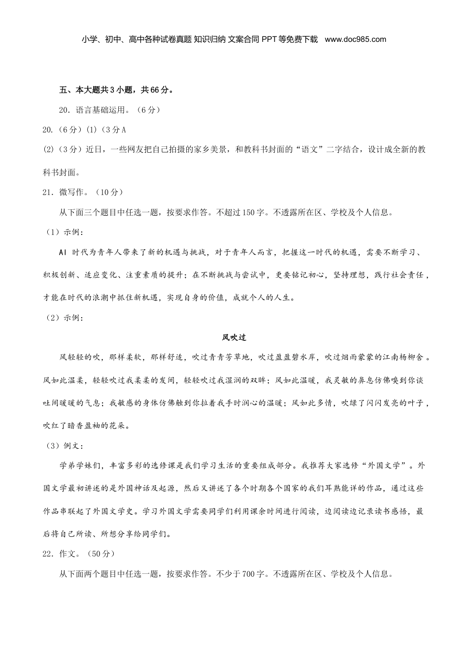 小学、初中、高中各种试卷真题知识归纳文案合同PPT等免费下载www.doc985.com2024年高考临考押题卷01(北京卷)语文·参考答案一、本大题共5小题,共18分。1.(3分)A2.(3分)C3.(3分)D4.(3分)B5.(6分)①以身为先,通过反身向诚的学习过程让“身”达到充满“乐”的状态。②“学”“乐”结合,保持“乐”的状态。不被私欲蒙蔽,不受外在环境的干扰,保持内心的宁静喜乐。③当读书带来负累或烦恼时,要及时反思学习的方向和方式,做出相应的调整。二、本大题共6小题,共28分。(一)阅读下面文言文,完成6-10题。(共18分)6.(3分)B7.(3分)C8.(3分)D9.(3分)BCE10.(6分)先举管仲、诸葛亮执法公正使人信服的事例,慨叹当今存在不公的问题,提出只有刚与公并行才能使天下人信服的观点;接着分析朝廷存在赏罚不明、执法不公的现象和弊端,指出其原因正是“执之不刚,守之不公”;最后引用《诗经》,强调只有公者能以刚服天下,劝勉君主追求真正的为君之乐。(二)根据要求,完成第11题。(共10分)11.(10分)元妃省亲贾宝玉梦游太虚幻境黛玉葬花香菱学诗抄检大观园要点一:大观园是太虚幻境在人间的投射,是贾宝玉和众女子的理想世界,但它不能独立于贾府而存在,不断被肮脏污浊的现实世界侵蚀,最终必然走向毁灭,体现了这一理想世界的虚幻性。要点二:大观园的兴衰,是贾府走向衰落的缩影,也是红颜薄命的象征,体现了小说的悲剧性。三、本大题共4小题,共20分。阅读下面这首词,完成12-14题。(共12分)12.(3分)C13.(3分)A14.(6分)答案示例1:在遣词用句上,姜夔善用含蓄之语表达丰富意蕴。如“倦网都收,归禽时度,月上汀洲冷”中“倦”“归”“冷”三个词语,含蓄写出漂泊江湖、无处容身的凄凉之感,暗示自己对清客生活的厌倦与回归自然安顿疲惫心灵的意愿。答案示例2:在意象选取上,姜夔善于选择清冷的意象,并着意使承载清冷含义的意象与感伤空寂的情绪小学、初中、高中各种试卷真题知识归纳文案合同PPT等免费下载www.doc985.com融合。如“月上汀洲冷”写月,月亮上升,岸边的沙汀和江心的小洲在烟月辉映下静静地躺着,显得格外幽冷。清月冷水,形成幽寂凄冷的氛围,融入了作者漂泊江湖、无处容身的凄凉之感。答案示例3:意境营造上,姜夔善营造清幽空灵的意境,寄托作者高洁清雅的情怀。如上阕“中流容与,画桡不点清镜”一句,画面清幽,意境空灵,和词人放浪江湖、追求自由的高雅情怀相契合,体现出一种幽远闲淡的情致。答案示例4:在表现手法上,姜夔善于从虚处作笔,不注重对事物作具体细致的刻画,而着重抒发作者对生活的主观感受。如下阕头三句写舟中友人“弹琴”,却是从想象入手,以虚写实。从湘江上响起的琴音联想到湘灵鼓瑟的古老传说,江上琴声,意境清幽哀伤。答案示例5:在思想情怀上,姜夔具有魏晋超然清雅的名士风采。如“五湖旧约,问经年底事,长负清景?”说自己原与江湖相约,可是此约长时不得实现,辜负了江湖胜景,表现了姜夔崇尚自然超然物外的思想和清雅的情趣。15.在横线处填写作品原句。(8分)15.(8分)可怜楼上月裴回湖月照我影醉不成欢惨将别别时茫茫江浸月不知东方之既白不知今夕何夕(抑)本其成败之迹而皆自于人欤四、本大题共4小题,共18分。16.(3分)D17.(3分)B18.(6分)①审美倾向:作者笔下的夹竹桃茂盛蓊郁、叶绿花嫩,一派清新而富有生机的景象,与女子柔美的特点相映衬,体现了诗性之美。②人生思考:夹竹桃是秦淮女儿的情感凝结,见证了秦淮女儿的喜悦与悲愁、真情与大爱,虽然时移世易、朝代更迭,但这种情感是不减不灭的,秦淮女儿的生命与精神是不会消失的,随着夹竹桃、秦淮河一直延续至今。19.(6分)示例:灵动优美的文字,细腻温婉的表达,无处不在的诗意,让读者沉浸在秦淮河的柔波里;跌宕起伏的结构,巧妙自然的安排,层层递进的概叹,毫无刻意雕凿摆龙门阵的有意为之之感;高瞻远瞩的立意,宽阔济世的胸襟,家国情怀追求,命运多舛的秦淮女子们在乱世中依然活得铮铮有声,用柔弱的双肩扛起了家国大任。秦淮女子令人动容,秦淮河让人仰视,《夜泊秦淮河》也让人肃然起敬。小学...