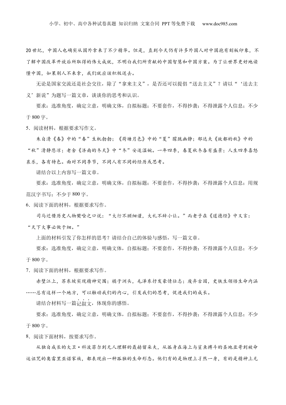 小学、初中、高中各种试卷真题知识归纳文案合同PPT等免费下载www.doc985.com考点二十九读写结合与教考衔接——突破高考作文题(原卷版)1.阅读下面的材料,根据要求写作。“顺木之天,以致其性”,是柳宗元笔下郭橐驼的种树诀窍,细细思忖,又何尝不是育人之法呢?其实,生活中人们也常常以“种树”喻“育人”,如成语有“十年树木,百年树人”,俗语也说“小树要砍,小孩要管”。作为青年的你对此有何感受和思考?请写一篇文章。要求:选准角度,确定立意,明确文体,自拟标题;不要套作,不得抄袭;不得泄露个人信息;不少于800字。2.阅读材料,根据要求作文。赤壁的明月与清风让贬谪黄州的苏轼获得了精神上的解脱,荷塘的月色与荷香让“心里颇不宁静”的朱自清偷得片刻的宁静与欢愉,荒芜但不衰败的地坛让残疾而困顿的史铁生领悟到生命的活力……在人生旅途中,总会有一个不经意的瞬间让人心生感慨并难以忘怀。以上材料对你有何启示?请你以“带你走近……”为主题,写一篇文章,谈谈你的感悟与思考。要求:选准角度,确定立意,明确文体,自拟标题;不要套作,不得抄袭;不得泄露个人信息;不少于800字。3.阅读下面的材料,根据要求写作。当今时代瞬息万变,纷繁芜杂。身处其中,有些青年方向迷失,目标缺席,“佛系”“躺平”;有些青年志向远大,但半途而废,人生“停摆”……面对这些现象,我们可以从古代先贤的智慧中获得人生启迪,如《老子》中的“慎终如始,则无败事”,《大学之道》中的“物有本末,事有终始,知其先后,则近道矣”。对“始”和“终”的认识影响着我们做一件事情的态度,甚至是事情的结果。以上材料带给你怎样的启示?请结合自己的思考与感悟写一篇文章。要求:选准角度,确定立意,明确文体,自拟标题;不要套作,不得抄袭;不得泄露个人信息;不少于800字。4.阅读下面的材料,根据要求写作。20世纪三十年代,鲁迅先生在批判“送去主义”的同时,提出了“拿来主义”的积极主张。纵观整个小学、初中、高中各种试卷真题知识归纳文案合同PPT等免费下载www.doc985.com20世纪,中国人也确实从国外拿来了不少精华。但是,直到今天仍有许多外国人对中国抱有刻板印象,不了解中国改革开放后所取得的伟大成就,不明白我们所贡献的中国智慧和中国方案。为了让世界更好地读懂中国,如果别人不来拿,我们就应该积极送去。无论是国家交流还是社会交往,除了“拿来主义”,是否还可以提倡“送去主义”?请以“‘送去主义’新说”为题写一篇文章,谈谈你的思考和认识。要求:选准角度,确定立意,明确文体,自拟标题;不要套作,不得抄袭;不得泄露个人信息;不少于800字。5.阅读材料,根据要求写作文。朱自清《春》中的“春”生机勃勃;《荷塘月色》中的“夏”朦胧幽静;郁达夫《故都的秋》中的“秋”清静悲凉;老舍《济南的冬天》中“冬”安适温婉。一年四季,春夏秋冬各有盛景;人生四季喜怒哀乐,各有特色。面对不同季节,不同人有不同的经历或思考。请结合以上内容写一篇文章。要求:选准角度,确定立意,明确文体,自拟标题;不要套作,不得抄袭;不得泄露个人信息;用规范汉字书写;不少于800字。6.阅读下面的材料,根据要求写作。司马迁借历史人物樊哙之口说:“大行不顾细谨,大礼不辞小让。”而老子在《道德经》中又言:“天下大事必做于细。”上面的材料引发了你怎样的思考?请结合自己的体验与感悟,写一篇文章。要求:选准角度,确定立意,明确文体,自拟标题;不要套作,不得抄袭;不得泄露个人信息;不少于800字。7.阅读下面的材料,根据要求写作。赤壁江上,苏东坡实现精神突围;橘子洲头,毛泽东抒发豪情壮志;废弃古园,史铁生领悟生命内涵……总有这样一个地方,可以触动我们的内心,引发我们的思考,促进我们的成长。请结合材料写一篇记叙文,体现你的感悟。要求:选准角度,确定立意,明确文体,自拟标题;不要套作,不得抄袭;不得泄露个人信息;不少于800字。8.阅读下面材料,按要求写作。从独自成长的大卫·科波菲尔到无人理解的聂赫留朵夫,从孤身在海上与鲨鱼搏斗的圣地亚哥到被命运诅咒的奥雷里亚诺家族,都表现出一种孤独的生命...