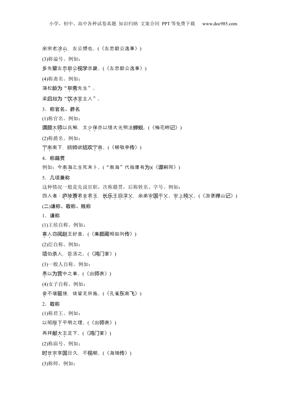 小学、初中、高中各种试卷真题知识归纳文案合同PPT等免费下载www.doc985.com识记六古代文化常识中国古代文化博大精深,内涵十分丰富,而且,有许多内容随着历史的发展,本身也在不断地发展演变。因此,更显示出它的复杂性。下面从七个方面对古代文化常识加以介绍。A.姓名和称谓(一)人称姓名1.直称姓名(1)用于自称。例如:陵庐文天祥自序其。诗(《指南后序》录)丘迟首。顿(《伯之》与陈书)(2)用于所厌恶、所轻视的人。例如:不幸孟吕师于前,构恶余贾庆于后。献谄(《指南后序》录)(3)用于做介绍,为人作传。例如:衡张字平子,南西鄂人也。阳(《衡》张传)2.称字、号、谥号、斋名这种情况是出于称呼者对被称呼者的礼貌和尊敬。(1)称字。例如:生东阳马君则,在太已二年。学(《送生序》东阳马)(2)称号。例如:五人者,盖当蓼洲周公之被逮,激于而死焉者也。义(《五人墓碑》记)小学、初中、高中各种试卷真题知识归纳文案合同PPT等免费下载www.doc985.com余宗老涂山,左公甥也。(《左忠毅公逸事》)(3)称谥号。例如:先左乡辈忠毅公京畿。视学(《左忠毅公逸事》)(4)称斋名。例如:蒲松龄为“聊斋先生”。梁超启为“冰室饮主人”。3.称官名、爵名(1)称官名。例如:谓颜太师以兵解,文少保亦以悟大光明法。蝉蜕(《梅花岭》记)(2)称爵名。例如:宁南南下,皖欲帅结欢宁南。(《柳敬亭》传)4.称籍贯例如:今南海之生死未卜。(“南海”代指康有为)(《嗣同》谭)5.几项兼称这种情况一般是先说官职,次称籍贯,后称姓名、字号。例如:四人者:陵君圭君玉庐萧,王回深父长乐,余弟安平父国、安上父纯。(《游褒山》禅记)(二)谦称、敬称、贱称1.谦称(1)王侯自称。例如:寡人窃王好音。闻赵(《廉相如列》颇蔺传)(2)臣自称。例如:伯人,项杀臣活之。(《宴》鸿门)(3)一般人自称。例如:愚以中之事。为营(《出表》师)(4)女子自称。例如:妾不堪使,徒留无所施。驱(《孔雀南》东飞)2.敬称(1)称君王。例如:以昭陛下平明之理。(《出表》师)再拜献大王足下。(《宴》鸿门)(2)称庙号。例如:时世宗享日久,不朝。国视(《海瑞》传)(3)称师。例如:小学、初中、高中各种试卷真题知识归纳文案合同PPT等免费下载www.doc985.com夫子哂之。(《子路、曾、冉有、公西侍坐》皙华)师者,所以道受解惑也。传业(《》师说)(4)称朋友、尊长。例如:君安伯有故?与项(《宴》鸿门)三日五匹,断大人故嫌。迟(《孔雀南》东飞)3.上称下或平辈之间称呼例如:尔安敢吾射?轻(《油翁》卖)誓不相隔卿。(《孔雀南》东飞)4.贱称例如:子竖不足!与谋(《宴》鸿门)小子无所畏,何敢助!妇语(《孔雀南》东飞)5.表示特定关系的称呼(1)加“从”表示叔伯关系。例如:安,字安石,谢尚弟从也。(《安》谢传)(2)加“太”表示长一辈。例如:必躬造左公第,候太公、太母起居。(《左忠毅公逸事》)(3)加“先”表示已逝世的尊长。例如:,妪先大母婢也。(《脊志》项轩)先考,指已逝的父;先妣,指已故的母。亲亲(三)名、字、号古代人的名字和现代有很大的差别。古人有取字、号的习惯。名,一般指人的姓名或单指名。幼年时由父母命名,供长辈呼唤。字,是男子20岁(成人)举行加冠礼时取字,女子15岁许嫁举行笄(jī)礼时取字,以表示对本人的尊重或供朋友称呼。名和字一般在意义上都存在一定的联系。有两种情况:①“名”和“字”词义相近或“字”是对“名”的进一步阐述,例如:屈原名平,字原,“原”是宽阔平坦的意思。②“名”和“字”意思相反,例如:韩愈,字退之。后人取字,通常是以两个字为“字”,例如:诸葛亮,字孔明。古人通常表示尊敬对方时称自己名,表示自己谦卑时也称自己名。如“不然,籍何以至此?”中的“籍”就是项羽自呼己名,表示对对方的尊敬。除了名和字之外,古人还有别号(又称别字)。别号是名和字以外的称号。古时,人们为了尊重别人,一般不直呼其名,也不称其字,而称其别号。号和名不一定有意义上的联系。号可以是两个字的,也可以是三个字以上的。例如:陆游,号放翁;陶潜,号五柳先生;苏轼,号东坡居士。字数多的别号有时可以压缩为两个字,如苏东坡。此外,有小学、初中、高中各种试卷真题知识归纳文案合...