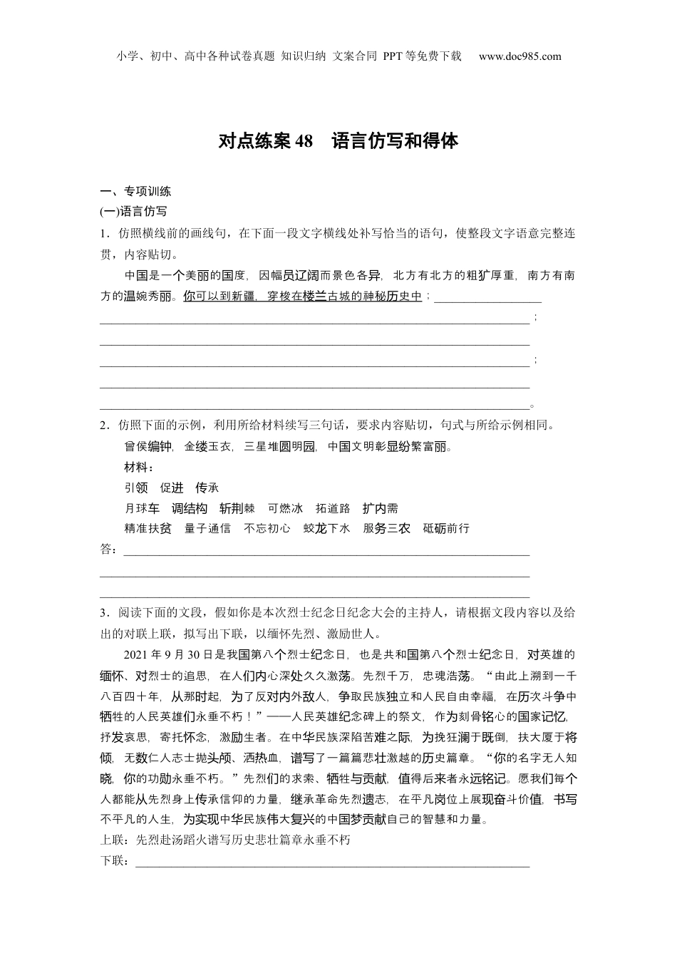 小学、初中、高中各种试卷真题知识归纳文案合同PPT等免费下载www.doc985.com对点练案48语言仿写和得体一、专项训练(一)语言仿写1.仿照横线前的画线句,在下面一段文字横线处补写恰当的语句,使整段文字语意完整连贯,内容贴切。中是一美的度,因幅而景色各,北方有北方的粗厚重,南方有南国个丽国员辽阔异犷方的婉秀。温丽可以到新疆,穿梭在古城的神秘史中你楼兰历;__________________________________________________________________________________________;________________________________________________________________________________________________________________________________________________;________________________________________________________________________________________________________________________________________________。2.仿照下面的示例,利用所给材料续写三句话,要求内容贴切,句式与所给示例相同。曾侯,金玉衣,三星堆明,中文明彰繁富。编钟缕圆园国显纷丽材料:引促承领进传月球棘可燃冰拓道路需车调结构斩荆扩内精准扶量子通信不忘初心蛟下水服三砥前行贫龙务农砺答:____________________________________________________________________________________________________________________________________________________________________________________________________________________3.阅读下面的文段,假如你是本次烈士纪念日纪念大会的主持人,请根据文段内容以及给出的对联上联,拟写出下联,以缅怀先烈、激励世人。2021年9月30日是我第八烈士念日,也是共和第八烈士念日,英雄的国个纪国个纪对、烈士的追思,在人心深久久激。先烈千万,忠魂浩。缅怀对们内处荡荡“由此上溯到一千八百四十年,那起,了反外人,取民族立和人民自由幸福,在次斗中从时为对内敌争独历争牲的人民英雄永垂不朽!牺们”——人民英雄念碑上的祭文,作刻骨心的家,纪为铭国记忆抒哀思,寄托念,激生者。在中民族深陷苦之,挽狂于倒,扶大厦于发怀励华难际为澜既将,无仁人志士抛、洒血,了一篇篇悲激越的史篇章。倾数头颅热谱写壮历“的名字无人知你,的功永垂不朽。晓你勋”先烈的求索、牲,得后者永。愿我每们牺与贡献值来远铭记们个人都能先烈身上承信仰的力量,承革命先烈志,在平凡位上展斗价,从传继遗岗现奋值书写不平凡的人生,中民族大的中自己的智慧和力量。为实现华伟复兴国梦贡献上联:先烈赴汤蹈火谱写历史悲壮篇章永垂不朽下联:__________________________________________________________________小学、初中、高中各种试卷真题知识归纳文案合同PPT等免费下载www.doc985.com________________________________________________________________________(二)语言得体4.(2017·全国Ⅲ)下列各句中,表达得体的一句是()A.他是个可怜的孤儿,小时候承蒙我父母照顾,所以现在经常来看望他们。B.杨老师年过七旬仍然笔耕不辍,作为他的高足,我们感到既自豪又惭愧。C.这篇文章是我刚完成的,无论观点还是文字都不够成熟,请您不吝赐教。D.由于路上堵车非常严重,我赶到约定地点的时候,对方早已恭候多时了。5.(2018·全国Ⅲ)下面是一封信的主要内容,其中有五处不得体,请找出并作修改。悉文院下周活,隆重先生获学举办动庆贺教书50周年,我因俗身,不能光,特务缠临惠花一束,以表敬意。信寄去近期出版的拙著一,望先生先睹快。赠鲜随册还为盛夏快了,先生保重身体。来请答:____________________________________________________________________________________________________________________________________________________________________________________________________________________6.下列各句中,表达得体的一句是()A.记者采访李教授时说:“听说您最近有一项重要的科研成果问世。您真是好样的!我向您表示衷心祝贺。”B.弟弟在银行上班,衣着总是光鲜亮丽,每次见到他,我都夸奖说:“足下真是异彩生辉!”C.拙作《老子补正》新成,惶恐以赠,尚祈雅正,不吝赐教。D.这幅作品...