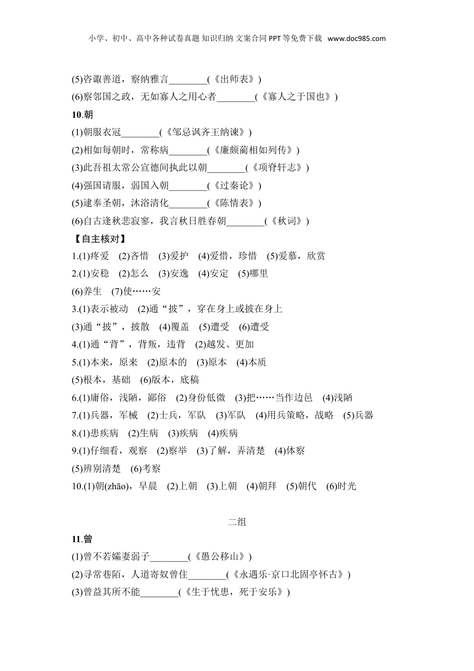 小学、初中、高中各种试卷真题知识归纳文案合同PPT等免费下载www.doc985.com第二部分古代诗文阅读知识清单五120个文言实词一组1.爱(1)爱其子,择师而教之________(《师说》)(2)不爱珍器重宝肥饶之地________(《过秦论》)(3)项燕为楚将,数有功,爱士卒,楚人怜之________(《陈涉世家》)(4)向使三国各爱其地________(《六国论》)(5)予独爱莲之出淤泥而不染________(《爱莲说》)2.安(1)风雨不动安如山________(《茅屋为秋风所破歌》)(2)安能屈豪杰之流,扼腕墓道________(《五人墓碑记》)(3)然后得一夕安寝________(《六国论》)(4)思国之安者,必积其德义________(《谏太宗十思疏》)(5)固一世之雄也,而今安在哉!________(《赤壁赋》)(6)衣食所安,弗敢专也________(《曹刿论战》)(7)既来之,则安之________(《论语》)3.被(1)曲罢曾教善才服,妆成每被秋娘妒________(《琵琶行》)(2)将军身被坚执锐________(《陈涉世家》)(3)被发行吟泽畔________(《屈原列传》)(4)闻妻一言,如被冰雪________(《促织》)(5)秦王复击轲,被八创________(《荆轲刺秦王》)(6)虽万被戮,岂有悔哉________(《报任安书》)4.倍小学、初中、高中各种试卷真题知识归纳文案合同PPT等免费下载www.doc985.com(1)愿伯具言臣之不敢倍德也________(《鸿门宴》)(2)每逢佳节倍思亲________(《九月九日忆山东兄弟》)5.本(1)自言本是京城女,家在虾蟆陵下住________(《琵琶行》)(2)此之谓失其本心________(《鱼我所欲也》)(3)本自无教训,兼愧贵家子________(《孔雀东南飞》)(4)少无适俗韵,性本爱丘山________(《归园田居》)(5)盖亦反其本矣________(《齐桓晋文之事》)(6)今存其本不忍废,________(《〈指南录〉后序》)6.鄙(1)鄙贱之人,不知将军宽之至此也________(《廉颇蔺相如列传》)(2)先帝不以臣卑鄙________(《出师表》)(3)越国以鄙远,君知其难也________(《烛之武退秦师》)(4)肉食者鄙,未能远谋________(《曹刿论战》)7.兵(1)兵刃既接,弃甲曳兵而走________(《寡人之于国也》)(2)赵亦盛设兵以待秦,秦不敢动________(《廉颇蔺相如列传》)(3)起视四境,而秦兵又至矣________(《六国论》)(4)斯用兵之效也________(《六国论》)(5)收天下之兵,聚之咸阳________(《过秦论》)8.病(1)三岁余,王病,赐武马畜、服匿、穹庐________(《苏武传》)(2)相如每朝时,常称病________(《廉颇蔺相如列传》)(3)百年多病独登台________(《登高》)(4)余久卧病无聊,乃使人复葺南阁子________(《项脊轩志》)9.察(1)能张目对日,明察秋毫________(《童趣》)(2)前太守臣逵察臣孝廉,后刺史臣荣举臣秀才________(《陈情表》)(3)虽不能察,必以情________(《曹刿论战》)(4)怨灵修之浩荡兮,终不察夫民心________(《离骚》)小学、初中、高中各种试卷真题知识归纳文案合同PPT等免费下载www.doc985.com(5)咨诹善道,察纳雅言________(《出师表》)(6)察邻国之政,无如寡人之用心者________(《寡人之于国也》)10.朝(1)朝服衣冠________(《邹忌讽齐王纳谏》)(2)相如每朝时,常称病________(《廉颇蔺相如列传》)(3)此吾祖太常公宣德间执此以朝________(《项脊轩志》)(4)强国请服,弱国入朝________(《过秦论》)(5)逮奉圣朝,沐浴清化________(《陈情表》)(6)自古逢秋悲寂寥,我言秋日胜春朝________(《秋词》)【自主核对】1.(1)疼爱(2)吝惜(3)爱护(4)爱惜,珍惜(5)爱慕,欣赏2.(1)安稳(2)怎么(3)安逸(4)安定(5)哪里(6)养生(7)使……安3.(1)表示被动(2)通“披”,穿在身上或披在身上(3)通“披”,披散(4)覆盖(5)遭受(6)遭受4.(1)通“背”,背叛,违背(2)越发、更加5.(1)本来,原来(2)原本的(3)原本(4)本质(5)根本,基础(6)版本,底稿6.(1)庸俗,浅陋,鄙俗(2)身份低微(3)把……当作边邑(4)浅陋7.(1)兵器,军械(2)士兵,军队(3)军队(4)用兵策略,战略(5)兵器8.(1)患疾病(2)生病(3)疾病(4)疾病9.(1)仔细看,观察(2)察举(3)了解,弄清楚(4)体察(5)辨别清楚(6)考察10.(1)朝(zhāo),早晨(2)上朝(3)上朝(4)朝拜(5)朝代(6)时光二组11.曾(1)曾不若孀妻弱子________(《愚公移山》)(2)寻常巷陌,人道寄奴曾住________(《永遇乐·京口北固亭怀古》)(3)曾...