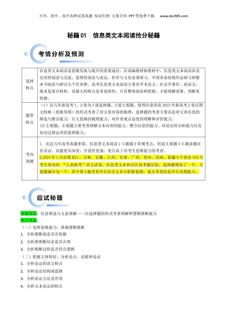 小学、初中、高中各种试卷真题知识归纳文案合同PPT等免费下载www.doc985.com秘籍01信息类文本阅读抢分秘籍选材特点信息类文本阅读是思维发展与提升的重要途径。在部编教材新教材中,信息类文本阅读涉及实用性阅读与交流、思辨性阅读与表达、科学与文化论著研习、中国革命传统作品研习和整本书阅读与研讨五个任务群。高考信息类文本阅读主要有学术论文、社会学著作、政论文,基本是复合材料,其最大的特点是非连续性,只有整体阅读和把握,才能理解更准、判断更快捷。题型特点(1)近几年新高考1、2卷为3道选择题,2道主观题,值得注意的是2022年新高考2卷以图文转换(思维导图)的形式考查了对文章内容的梳理,选择题的考查主要还是对文章信息的筛选与整合能力、行文思路的梳理能力、对作者观点态度的理解和评价能力。(2)主观题:主观题主要考查理解文本内容的能力、整合信息的能力、对论证的分析能力以及知识迁移运用的思辨能力。考向预测1.从近几年高考真题来看,信息类文本阅读1-3题属于常规考点,但是主观题4-5题命题比价灵活,设题更具深度,开放性更强,更凸显了对考生思维能力的考查。2.2024年1月由黑龙江、吉林、安徽、江西、甘肃、广西、贵州、河南、新疆9个省份410万考生参加的“九省联考”语文试卷,信息类文本和以往高考题比较,选择题增加了一个,主观题减少为一个,其中第4题考查学生结合文本分析框架图,重点考查的是学生读图能力。基础考法:信息筛选与文意理解——以选择题的形式考查理解和逻辑推断能力热点考法:(一)发挥思维能力,准确逻辑推断1.分析推断前是否有依据2.分析推推断结论是否合理3.分析推断过程是否符合逻辑(二)把握文体特征,分析论点、论据和论证1.分析论证的语言特点2.分析论证结构或思路3.分析论证方法及作用4.分析文本论证的特点小学、初中、高中各种试卷真题知识归纳文案合同PPT等免费下载www.doc985.com(三)观点评价与情境探究1.评价文体的观点与倾向2.理解文本观点并迁移运用“3步骤”准确解答选择题步骤1读全文,理出论述的核心问题、基本观点态度。步骤2回归文本,找出答案所在区域。步骤3比对分析定答案,对比词语、关系、结论和依据。“3步骤”准确解答主观题步骤1读懂题干,熟知题目类型,明确题目要求。步骤2锁定文本中心,找准题干所对应的材料或观点与文本的契合点。步骤3精准分析,规范答题要点。熟记基础知识,强化基本技能1.把握文本的文本特征,关注体现社会热点的文章,读懂文章。2.掌握逻辑知识,理解语句间的逻辑关系能够清晰、准确地分析阐明观点和材料之间的联系,运用到思辨性阅读的逻辑推断中。3.学会分析论证,并能准确辨析命题中的“逻辑谬误”。(2023·新高考2卷·高考真题)阅读下面的文字,完成下面小题。材料一:搞好调查研究,一定要从群众中来、到群众中去,广泛听取群众意见。人民群众的社会实践,是获得正确认识的源泉,也是检验和深化我们认识的根本所在。调查研究成果的质量如何,形成的意见正确与否,最终都要由人民群众的实践来检验。毛泽东同志1930年在寻乌县调查时,直接与各界群众开调查会,掌握了大量第一手材料,诸如该县各类物产的产量、价格,县城各业人员数量、比例,各商铺经营品种、收入,各地农民分了多少土地、收入怎样,各类人群的政治态度,等等,都弄得一清二楚。这种深入、唯实的作风值得我们学习。领导干部进行调查研究,要放下架子、扑下身子,深入田间地头和厂矿车间,同群众一起讨论问题,倾听他们的呼声,体察他们的情绪,感受他们的疾苦,总结他们的经验,吸取他们的智慧。既要听群众的顺耳话,也要听群众的逆耳言;既要让群众反映情况,也要请群众提出意见。尤其对群众最盼、最急、最忧、最怨的问题更要主动调研,抓住不放。这样才能真正听到实话、察到实情、获得真知、收到实效。小学、初中、高中各种试卷真题知识归纳文案合同PPT等免费下载www.doc985.com调查研究必须坚持实事求是的原则,树立求真务实的作风,具有追求真理、修正错误的勇气。现在有的干部善于察言观色,准备了几个口袋,揣摩上面或领导的意图来提供材料。很显然,这样的调查是看不到实情、得不到真知...