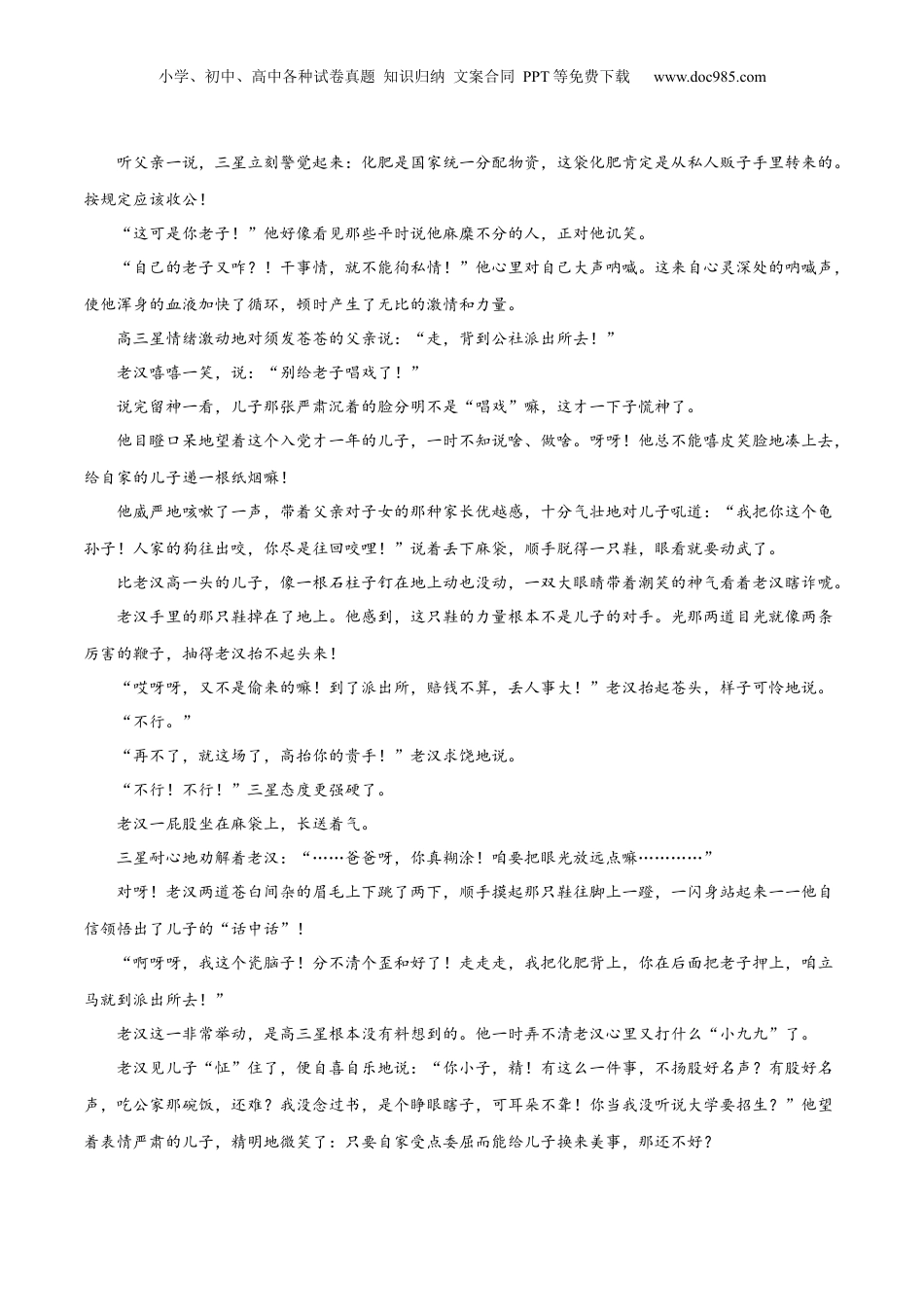 小学、初中、高中各种试卷真题知识归纳文案合同PPT等免费下载www.doc985.com专题分层训练(解析版)解密04文学类文本阅读小说之形象分析内容概览A·常考题不丢分一、人物的形象二、人物的作用三、物象的含义和作用B·拓展培优拿高分C·挑战真题争满分一、人物的形象(2023·陕西·校联考三模)阅读下面的文字,完成小题。父子俩路遥掌灯时分,黄河的涛声渐渐地涨高了。一只手电光向渡口劈面照来,夜色中,像一柄明晃晃的剑。和往常一样,是民兵队长高三星察视渡口来了。他两腮鼓鼓的,一副随时准备和人吵架的模样。他有力地迈动着脚步,不断有些风干了的黄泥巴,从他赤裸的腿上掉下来。离河边约摸二百码的地方,手电光罩住了一个苍头发老汉。呀,这是他爸嘛!“怪事!你是前几天去河东镇子上看病的嘛,可肩胛上的麻袋里沉甸甸地背了些什么?”三星望着父亲,心里盘算着。职责感使他的神经系统很快地进入戒备状态。他本想先问候问候老人的病情,可嘴里不由得带着盘查的口气问:“你这是背了些什么嘛?!”老汉被手电光照得眼花缭乱,听见问话,才知道是儿子,便火气十足地说:“胡照啥哩,灭了!……给咱家地里闹腾的一袋化肥,怎?!”他眼珠子瞪得老大。小学、初中、高中各种试卷真题知识归纳文案合同PPT等免费下载www.doc985.com听父亲一说,三星立刻警觉起来:化肥是国家统一分配物资,这袋化肥肯定是从私人贩子手里转来的。按规定应该收公!“这可是你老子!”他好像看见那些平时说他麻糜不分的人,正对他讥笑。“自己的老子又咋?!干事情,就不能徇私情!”他心里对自己大声呐喊。这来自心灵深处的呐喊声,使他浑身的血液加快了循环,顿时产生了无比的激情和力量。高三星情绪激动地对须发苍苍的父亲说:“走,背到公社派出所去!”老汉嘻嘻一笑,说:“别给老子唱戏了!”说完留神一看,儿子那张严肃沉着的脸分明不是“唱戏”嘛,这才一下子慌神了。他目瞪口呆地望着这个入党才一年的儿子,一时不知说啥、做啥。呀呀!他总不能嘻皮笑脸地凑上去,给自家的儿子递一根纸烟嘛!他威严地咳嗽了一声,带着父亲对子女的那种家长优越感,十分气壮地对儿子吼道:“我把你这个龟孙子!人家的狗往出咬,你尽是往回咬哩!”说着丢下麻袋,顺手脱得一只鞋,眼看就要动武了。比老汉高一头的儿子,像一根石柱子钉在地上动也没动,一双大眼睛带着潮笑的神气看着老汉瞎诈唬。老汉手里的那只鞋掉在了地上。他感到,这只鞋的力量根本不是儿子的对手。光那两道目光就像两条厉害的鞭子,抽得老汉抬不起头来!“哎呀呀,又不是偷来的嘛!到了派出所,赔钱不算,丢人事大!”老汉抬起苍头,样子可怜地说。“不行。”“再不了,就这场了,高抬你的贵手!”老汉求饶地说。“不行!不行!”三星态度更强硬了。老汉一屁股坐在麻袋上,长送着气。三星耐心地劝解着老汉:“……爸爸呀,你真糊涂!咱要把眼光放远点嘛…………”对呀!老汉两道苍白间杂的眉毛上下跳了两下,顺手摸起那只鞋往脚上一蹬,一闪身站起来一一他自信领悟出了儿子的“话中话”!“啊呀呀,我这个瓷脑子!分不清个歪和好了!走走走,我把化肥背上,你在后面把老子押上,咱立马就到派出所去!”老汉这一非常举动,是高三星根本没有料想到的。他一时弄不清老汉心里又打什么“小九九”了。老汉见儿子“怔”住了,便自喜自乐地说:“你小子,精!有这么一件事,不扬股好名声?有股好名声,吃公家那碗饭,还难?我没念过书,是个睁眼瞎子,可耳朵不聋!你当我没听说大学要招生?”他望着表情严肃的儿子,精明地微笑了:只要自家受点委屈而能给儿子换来美事,那还不好?小学、初中、高中各种试卷真题知识归纳文案合同PPT等免费下载www.doc985.com三星终于明白父亲这个“小九九”了。起先,他想笑。可他没有笑。父亲那自私的、可怜的笑容打消了他的笑意。他思想:“不管爸爸你如何打你的小九九,我有我的老主意哩!……好嘛,眼下只要你同意去公社派出所就好!”他对父亲说:“那咱就起身。”就这样,父子俩一前一后,沿着黄河畔坎坷的石头路,向公社派出所走去。波涛汹涌的黄河,在夜行者的脚下奔腾东去:听得见岸沿上一处、两处泥沙被波浪...