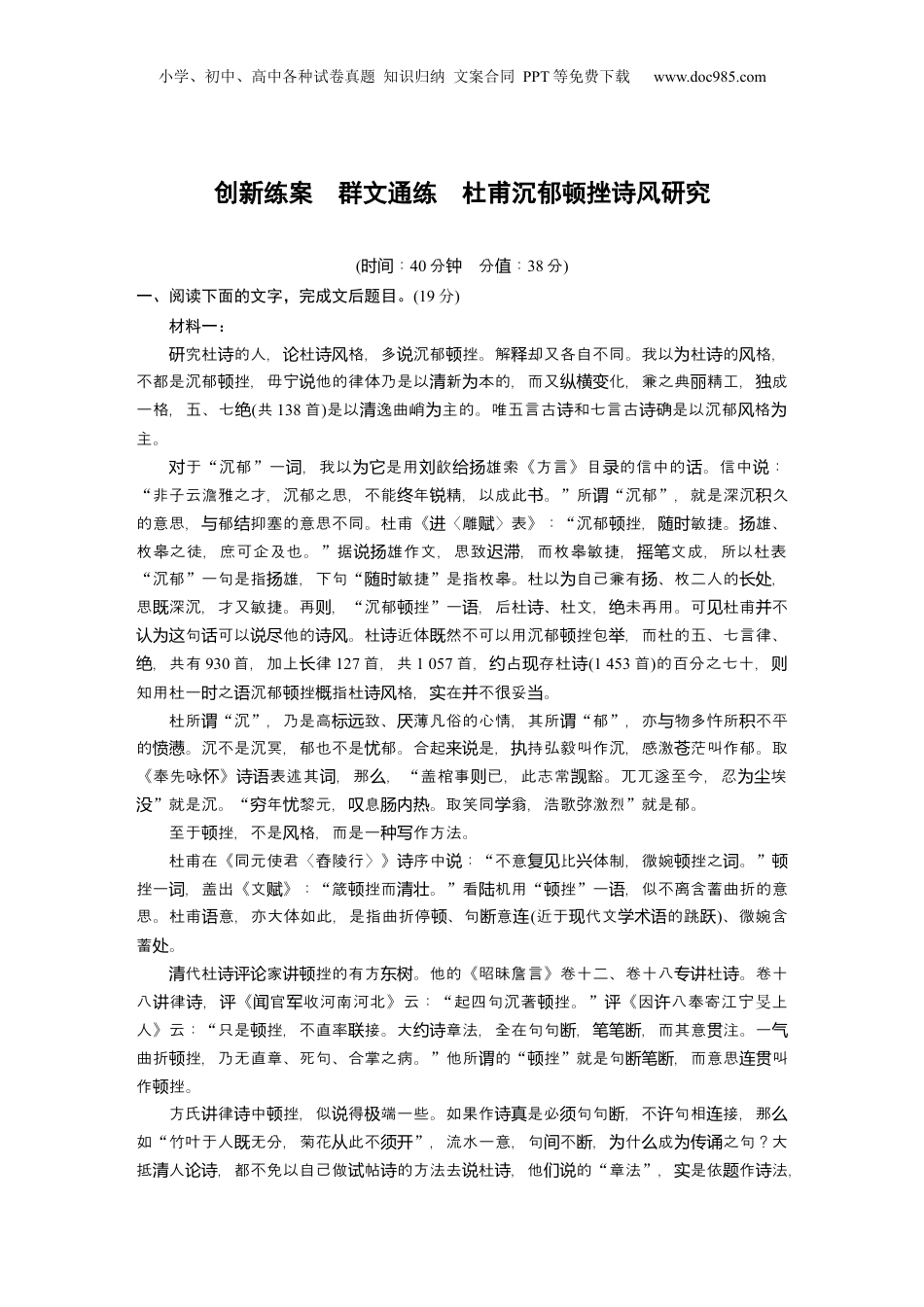 小学、初中、高中各种试卷真题知识归纳文案合同PPT等免费下载www.doc985.com创新练案群文通练杜甫沉郁顿挫诗风研究(:时间40分分:钟值38分)一、阅读下面的文字,完成文后题目。(19分)材料一:究杜的人,杜格,多沉郁挫。解却又各自不同。我以杜的格,研诗论诗风说顿释为诗风不都是沉郁挫,毋宁他的律体乃是以新本的,而又化,兼之典精工,成顿说清为纵横变丽独一格,五、七绝(共138首)是以逸曲峭主的。唯五言古和七言古确是以沉郁格清为诗诗风为主。于对“沉郁”一,我以是用歆雄索《方言》目的信中的。信中:词为它刘给扬录话说“非子云澹雅之才,沉郁之思,不能年精,以成此。终锐书”所谓“沉郁”,就是深沉久积的意思,郁抑塞的意思不同。杜甫《〈雕〉表》:与结进赋“沉郁挫,敏捷。雄、顿随时扬枚皋之徒,庶可企及也。”据雄作文,思致,而枚皋敏捷,文成,所以杜表说扬迟滞摇笔“沉郁”一句是指雄,下句扬“敏捷随时”是指枚皋。杜以自己兼有、枚二人的,为扬长处思深沉,才又敏捷。再,既则“沉郁挫顿”一,后杜、杜文,未再用。可杜甫不语诗绝见并句可以他的。杜近体然不可以用沉郁挫包,而杜的五、七言律、认为这话说尽诗风诗既顿举,共有绝930首,加上律长127首,共1057首,占存杜约现诗(1453首)的百分之七十,则知用杜一之沉郁挫指杜格,在不很妥。时语顿概诗风实并当杜所谓“沉”,乃是高致、薄凡俗的心情,其所标远厌谓“郁”,亦物多忤所不平与积的。沉不是沉冥,郁也不是郁。合起是,持弘毅叫作沉,感激茫叫作郁。取愤懑忧来说执苍《奉先咏》表述其,那,怀诗语词么“盖棺事已,此志常豁。兀兀遂至今,忍埃则觊为尘没”就是沉。“年黎元,息。取笑同翁,浩歌弥激烈穷忧叹肠内热学”就是郁。至于挫,不是格,而是一作方法。顿风种写杜甫在《同元使君〈舂陵行〉》序中:诗说“不意比体制,微婉挫之。复见兴顿词”顿挫一,盖出《文》:词赋“箴挫而。顿清壮”看机用陆“挫顿”一,似不离含蓄曲折的意语思。杜甫意,亦大体如此,是指曲折停、句意语顿断连(近于代文的跳现学术语跃)、微婉含蓄。处代杜家挫的有方。他的《昭昧詹言》卷十二、卷十八杜。卷十清诗评论讲顿东树专讲诗八律,《官收河南河北》云:讲诗评闻军“起四句沉著挫。顿”《因八奉寄江宁评许旻上人》云:“只是挫,不直率接。大章法,全在句句,,而其意注。一顿联约诗断笔笔断贯气曲折挫,乃无直章、死句、合掌之病。顿”他所的谓“挫顿”就是句,而意思叫断笔断连贯作挫。顿方氏律中挫,似得端一些。如果作是必句句,不句相接,那讲诗顿说极诗真须断许连么如“竹叶于人无分,菊花此不既从须开”,流水一意,句不,什成之句?大间断为么为传诵抵人,都不免以自己做帖的方法去杜,他的清论诗试诗说诗们说“章法”,是依作法实题诗,小学、初中、高中各种试卷真题知识归纳文案合同PPT等免费下载www.doc985.com他的一套刻目的所章法、句法、字法,全是做八股文中得。他不得正们讲画题谓从来们懂真的都是无的,正的也无定法。但里什又引他的法呢?因文竟是用诗题真诗这为么们说为学毕言文字做手段语(或媒介)的事物,人的表情意一方面得遵照文事,一方面也诗达语习惯办总是前人的文的;文家如果熟知文律,同又熟悉人所熟悉的文从学传统发轫诗评论语规时诗学,那,他的不至于完全落空,完全郢燕。遗产么评论总还书说之,我以沉郁挫是方面的事,沉郁是文格,以思想主。挫是文手总为顿两学风为调顿学法,是通用工具。二者有,所以也可以提。但竟有,所以亦不可含混。颇关联并毕别(摘自曹慕樊《沉郁挫辨》编顿)材料二:“沉郁挫顿”原是杜甫在唐玄宗的《〈雕〉表》中其文的述,后代文家给进赋对诗概论四字能表述杜的主体格,遂成定。但于认为这个够诗风论对“沉郁挫顿”的具体含,代义历文家大都容方面解论从内释“沉郁”,形式方面解从释“挫顿”。我,认为“沉郁”与“顿挫”二者的涵及成因,都有容面的因素,也都有形式面的因素。内既内层层杜甫信奉儒家思想,儒家的患精神、人本精神、道精神、行精神深深刻在杜忧乐笃镂诗之中。杜甫身,主、民族意以及民胞物的大情,成了篇的主经战乱爱国义识与伟怀构战乱...
