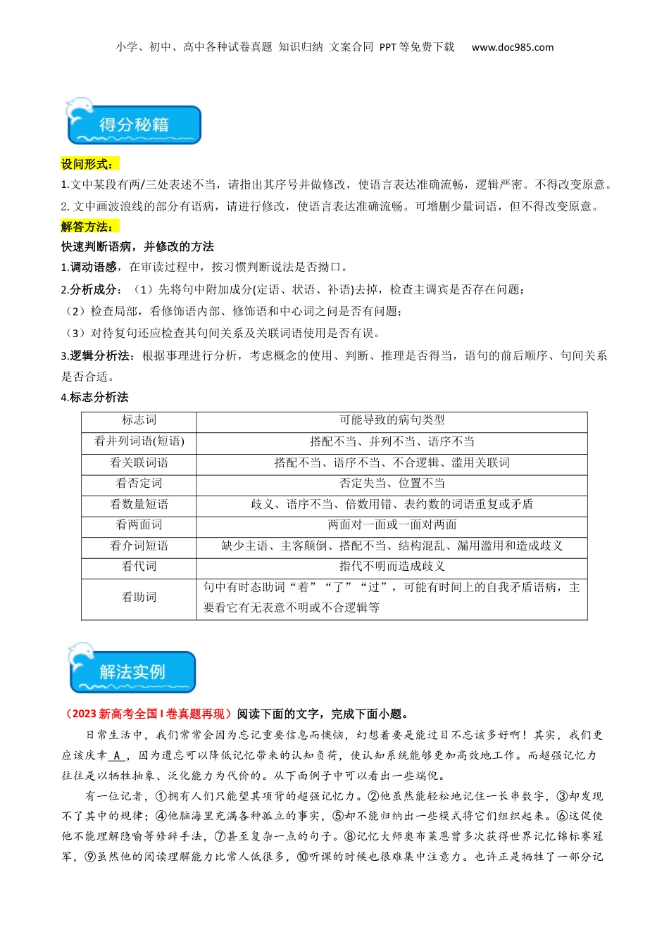 小学、初中、高中各种试卷真题知识归纳文案合同PPT等免费下载www.doc985.com热点14:语言文字运用之病句修改类题型(原卷版)一、考情微观年份卷别题型病句类型2023新高考I卷语段中病句修改主观题成语误用、搭配不当、关联词新高考II卷语段中病句修改主观题成分残缺、搭配不当全国甲卷语段中病句修改主观题不合逻辑全国乙卷语段中病句修改(删除冗余词语)主观题重复赘余2022新高考Ⅱ卷语段中病句修改主观题成分残缺、结构混乱全国甲卷语段中病句修改主观题搭配不当、不合逻辑全国甲卷语段中病句修改主观题结构混乱、关联词使用不当2021新高考Ⅰ卷语段中病句修改选择题结构混乱、搭配不当新高考Ⅱ卷语段中病句修改选择题成分残缺、关联词语使用不当全国甲卷语段中病句修改选择题成分残缺全国乙卷语段中病句修改选择题搭配不当、结构混乱二、命题特点1.考查频率“高”:几乎未“缺席”过全国卷。2.命题形式“变”:2022年由过去几年考的“语段中病句修改选择题”改为“语段中病句修改主观题”。3.病句类型“显”:主要以搭配不当、结构混乱为主,兼有语序不当、成分残缺等。4.所选病句较长,一般含两处病因;要求能准确修改。5.在2023年的新课标I卷中,病句辨析和成语运用合二为一了。小学、初中、高中各种试卷真题知识归纳文案合同PPT等免费下载www.doc985.com设问形式:1.文中某段有两/三处表述不当,请指出其序号并做修改,使语言表达准确流畅,逻辑严密。不得改变原意。2.文中画波浪线的部分有语病,请进行修改,使语言表达准确流畅。可增删少量词语,但不得改变原意。解答方法:快速判断语病,并修改的方法1.调动语感,在审读过程中,按习惯判断说法是否拗口。2.分析成分:(1)先将句中附加成分(定语、状语、补语)去掉,检查主调宾是否存在问题;(2)检查局部,看修饰语内部、修饰语和中心词之问是否有问题;(3)对待复句还应检查其句间关系及关联词语使用是否有误。3.逻辑分析法:根据事理进行分析,考虑概念的使用、判断、推理是否得当,语句的前后顺序、句间关系是否合适。4.标志分析法标志词可能导致的病句类型看并列词语(短语)搭配不当、并列不当、语序不当看关联词语搭配不当、语序不当、不合逻辑、滥用关联词看否定词否定失当、位置不当看数量短语歧义、语序不当、倍数用错、表约数的词语重复或矛盾看两面词两面对一面或一面对两面看介词短语缺少主语、主客颠倒、搭配不当、结构混乱、漏用滥用和造成歧义看代词指代不明而造成歧义看助词句中有时态助词“着”“了”“过”,可能有时间上的自我矛盾语病,主要看它有无表意不明或不合逻辑等(2023新高考全国I卷真题再现)阅读下面的文字,完成下面小题。日常生活中,我们常常会因为忘记重要信息而懊恼,幻想着要是能过目不忘该多好啊!其实,我们更应该庆幸A,因为遗忘可以降低记忆带来的认知负荷,使认知系统能够更加高效地工作。而超强记忆力往往是以牺牲抽象、泛化能力为代价的。从下面例子中可以看出一些端倪。有一位记者,①拥有人们只能望其项背的超强记忆力。②他虽然能轻松地记住一长串数字,③却发现不了其中的规律;④他脑海里充满各种孤立的事实,⑤却不能归纳出一些模式将它们组织起来。⑥这促使他不能理解隐喻等修辞手法,⑦甚至复杂一点的句子。⑧记忆大师奥布莱恩曾多次获得世界记忆锦标赛冠军,⑨虽然他的阅读理解能力比常人低很多,⑩听课的时候也很难集中注意力。也许正是牺牲了一部分记小学、初中、高中各种试卷真题知识归纳文案合同PPT等免费下载www.doc985.com忆,我们才有了独一无二的归纳和抽象思维能力。网络时代,我们没有办法也没有必要B,毕竟互联网随时可以帮我们查阅。不过我们也不能过于依赖互联网,像互联网可以解决所有问题似的。通过一些训练提升记忆力,也一直是我们孜孜以求的目标。热点突破文中第二段有三处表述不当,请指出其序号并做修改,使语言表达准确流畅,逻辑严密。不得改变原意。(3分)作答步骤1.仔细读题,明确题干的要求。2.阅读语段,根据语感或者分析成分或者看标志,找出有语病的句子:3.根据语病情况,找出修改的方法:4.整理答案:作答总结:1.仔细读题,明确题...