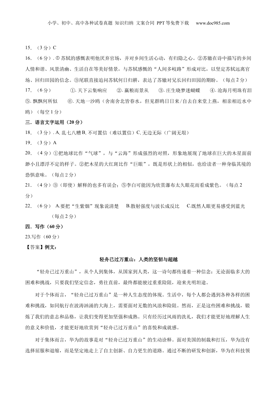 小学、初中、高中各种试卷真题知识归纳文案合同PPT等免费下载www.doc985.com备战2024年高考考前抢分模拟卷01语文·参考答案一.现代文阅读(35分)1.(3分)A2.(3分)B3.(3分)B4.(3分)C5.(6分)①深入挖掘中国传统服饰的制衣理念和共性,对汉服进行现代化的改造,使之成为现代社会中可以正常穿着的衣物;②将汉服应用在仪式、节日等重要场景,将其升华为汉族乃至中华民族的一种文化符号;③在公众心中重构“汉服是现代中国人传统民族服饰”的集体记忆,并且获得主流文化和舆论的接受与认可。(每点2分)6.(3分)B7.(3分)C8.(5分)①正标题是喻体,副标题是本体,形象生动地写出了作者对时间的印象:“捉不住”。②“鼬鼠”的比喻,深刻地揭示出时间的特点:灵活、具有伸缩性、速度快、无处不在、冷酷凶猛等。③正标题与副标题结合,揭示了文章的写作对象,又暗示了文章的主旨,奇妙的比喻能引发读者的阅读兴趣。(答出2点即可)9.(6分).①多处句式整齐对称,节奏鲜明,读来朗朗上口,有音乐美感。②描写时间时句式简短,语言精练,富含哲理。③运用丰富的修辞手法如比喻、拟人、排比等,语言生动形象,富有诗意。④抒情方式含蓄与直接兼顾,表达情感强烈,令人深受感染。⑤思想深邃,对时间的本质和生命的可悲本性有着深入的理解和发现,富含哲理。(每点2分)二.古诗文阅读(35分)10.(3分)CEG11.(3分)B12.(3分)B13.(8分)①如果不是祖先神灵保佑,鄗城几乎就失守了,先王对此深以为耻。(4分)小学、初中、高中各种试卷真题知识归纳文案合同PPT等免费下载www.doc985.com②所以形势会跟着习俗而发生变化,礼法制度要随着形势的改变一起改变,这才是圣人治国的原则啊(4分)14.(3分)①不拘泥于成制,善于变通;②坚持主见,勇于变革;③能言善辩,善于劝说。(每点1分)参考译文:赵武灵王平日没事闲坐时,肥义在旁边陪坐。武灵王说:“现在我打算教导百姓改穿胡服、练习骑射,那么社会上一定会对我进行非议了。”肥义说:“愚蠢的人对于即使成功的事情也弄不明白,聪慧的人在事态尚未露出苗头之际就能察觉出来了,希望大王马上去施行吧。”赵武灵王于是改穿胡服。(赵武灵王)派王孙绁对公子成说:“子女不违抗父母,臣子不违抗国君,这是先王时就已通行的规矩。现在我要改穿胡服的目的,决不是放纵情欲而娱乐心志啊。所以我希望仰仗叔父的正确行动,来促成改穿胡服的成功。我特地派王孙绁来拜望您,请叔父穿上胡服吧。”公子成拜了两拜,说:“中原这个地方,是圣贤进行教化的地方,是仁义道德所施行的地方。现在君王舍弃了这些,而去袭用边远地区的服装,背离了圣贤们的教导,我希望大王要多多考虑啊。”王孙绁把公子成的话向赵武灵王报告。于是,(赵武灵王)就亲自到了公子成家里,对他说:“衣服的式样,不过是为了人们穿用方便;而礼制,是为了处理事情方便。我国东面有齐国、中山国,北面是燕国、东胡,西面有楼烦、秦、韩紧紧相邻。如果没有骑马射箭的武备,凭什么能守得住呢?早些时候,中山国依仗齐国的雄厚兵力,侵犯我国的土地,俘虏我国的百姓,又引水围鄗城;如果不是祖先神灵保佑,鄗城几乎就失守了,先王对此深以为耻。所以我决心改穿胡服,学习骑射,想以此抵御四面的灾难,一报中山国之仇。而叔父您一味依循中原旧俗,厌恶改变服装,忘记了鄗城的奇耻大辱,这不是我对您期望的!”公子成听了以后拜了两拜,于是赵武灵王就赐给他一套胡服。赵文又前来劝阻武灵王说:“服装有一定的样式,这是礼法所规定的,这是古代圣人用来教导我们的。希望君王认真考虑一下这件事。”武灵王说:“夏、商、周三个朝代的服饰不同却能统一天下,春秋五霸的教化不同却都能治理好国家。所以形势会跟着习俗而发生变化,礼法制度要随着形势的改变一起改变,这才是圣人治国的原则啊。”赵造规劝说:“不竭尽忠心,属于奸邪之类;因私心而危害国家,属于贼害之类。我虽然愚钝,愿尽忠心。不敢逃避死罪。”武灵王说:“忠臣不避危险,明君不拒绝别人提意见,你就说吧!”赵造说:“圣人不交换百姓而进行教化,聪明的人不改变习俗而行动。我希望大王好好考虑...