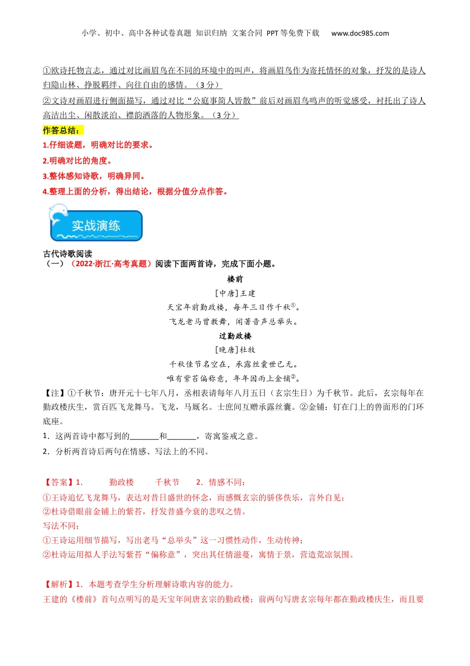 小学、初中、高中各种试卷真题知识归纳文案合同PPT等免费下载www.doc985.com热点11:古诗文阅读之比较分析类题(解析版)一、考情微观年份卷别篇名提问方式设题角度2022全国甲卷《画眉鸟》《画眉禽》这两首诗中,画眉鸟所起的作用并不相同。请简要分析。(6分)物象作用比较全国乙卷《白下驿饯唐少府》本诗与《送杜少府之任蜀州》都是王勃的送别之作,但诗人排遣离愁的方法有所不同。请结合内容简要分析。(6分)抒情手法比较浙江卷《楼前》《过勤政楼》分析两首诗后两句在情感、写法上的不同。(6分)情感、写法比较2019全国Ⅲ卷《插田歌(节选)》与《酬乐天扬州初逢席上见赠》相比,这几句诗的语言风格有什么不同?(6分)语言风格比较二、命题特点①随着新课标群文学习理念的落地,高考会越来越重视对群诗学习及群诗比较的考查。②比较考查的角度在形象、语言、技巧、情感等方面都有所涉及,或求同,或辨异,或求同辨异。③设题考查的方式有两种:一是一生(陌生之诗)一熟(学过或接触过的);二是两生并考(两首诗全是陌生的),多以主观题为主。设问形式:1.分析两首诗在抒情方式/语言风格/意象/情感上的不同。2.本诗与课本中的某一首诗在-----方面有----什么不同?设问解读:近年高考中诗歌比较阅读已成为一种比较常见的考查方式,一般分为两种对比形式:一种是两首课外古诗的比较阅读,通常会给出对比要素,如意象、情感、表达方式等;另一种是课内外诗的比较阅读,不单独设题,但在选择题选项或者简答题中考查学生对课内诗词的记忆与理解。解答方法:诗歌的比较阅读可以从内容和形式两个层面进行,内容层面包括诗歌的客观对象和主旨等要素,形式层面包括诗歌的表达技巧和语言风格等要素。小学、初中、高中各种试卷真题知识归纳文案合同PPT等免费下载www.doc985.com1.明确对比的要求:是对比相同点还是不同点。2.明确对比的角度:应从哪些角度展开对比。一般题干会明确指出对比角度,角度的个数不等。3.整体感知,明确异同:根据题干所给的角度,从诗歌的题目、作者、注释等内容出发,整体比较两首诗的相同点与不同点。4.结合诗句,具体分析:根据某一个或某几个角度,先寻找能够体现相同点的诗句,结合该诗句具体分析两首诗的相同点在哪里;再寻找能够体现不同点的诗句,分别结合诗句进行具体的分析。回答主观题时需注意:1.阐述时要注意点面结合,既有总体分析,又有具体分析。2.要对诗歌原句进行分析,切忌直接得出片面结论。3.如果是分析情感的异同,要写出情感词以及情感产生的缘由。4.如果是对比手法的异同,要分别具体分析手法是如何运用的,主旨是什么。(2022全国甲卷高考真题)阅读下面两首宋诗,完成下面小题。画眉鸟欧阳修百啭千声随意移,山花红紫树高低。始知锁向金笼听,不及林间自在啼。画眉禽文同尽日闲窗生好风,一声初听下高笼。公庭事简人皆散,如在千岩万壑中。热点突破这两首诗中,画眉鸟所起的作用并不相同。请简要分析。(6分)作答步骤1.仔细读题,明确对比的要求。分析画眉鸟所起的作用的不同。2.明确对比的角度:鉴赏诗歌事物形象的能力,从手法入手,找出二者作用的不同。3.整体感知诗歌,明确异同:根据题干的要求,整体比较两首诗手法上的不同点。欧诗以画眉鸟为直接描写对象,托物言志,写诗人听见画眉鸟在山林繁花之间千啼百啭,才知道笼中画眉的叫声,远比不上它在山间的自由歌唱那么悦耳动听。在文诗中,诗人对画眉鸟进行正面描写,通过对比画眉鸟在“山花红紫树高低”和“锁向金笼”两种截然不同的环境中的叫声,将画眉鸟作为寄托情怀的对象,表面写鸟,实则写人,抒发的是诗人归隐山林、挣脱羁绊、向往自由的感情。4.整理上面的分析,得出结论,根据分值分点作答。(6分)小学、初中、高中各种试卷真题知识归纳文案合同PPT等免费下载www.doc985.com①欧诗托物言志,通过对比画眉鸟在不同的环境中的叫声,将画眉鸟作为寄托情怀的对象,抒发的是诗人归隐山林、挣脱羁绊、向往自由的感情。(3分)②文诗对画眉进行侧面描写,通过对比“公庭事简人皆散”前后对画眉鸟鸣声的听觉感受,衬托出了诗人高洁出尘、闲散淡泊、襟韵洒落的人物形象。(3分)作答总结:1...