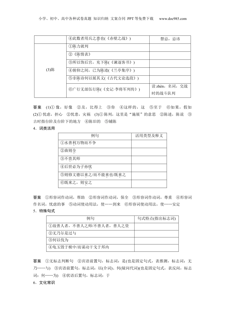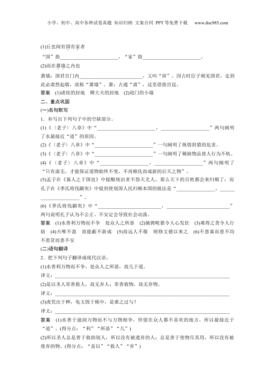小学、初中、高中各种试卷真题知识归纳文案合同PPT等免费下载www.doc985.com课时37《〈老子〉八章》《季氏将伐颛臾》一、基础梳理1.通假字例句指出通假本字及意义①正善治②故能蔽不新成③知者不博答案①同“政”,为政②同“敝”,破旧③同“智”,智慧2.古今异义词词语例句解析(古今义)①有事季氏将有事于颛臾古义:______________今义:泛指有事情②不能陈力就列,不能者止古义:_______________今义:办不到答案①用兵②没有能力3.多义实词词语例句意义(1)若①上善若水②徐公不若君之美也(《邹忌讽齐王纳谏》)③若入前为寿(《鸿门宴》)④以若所为,求若所欲,犹缘木而求鱼也(《齐桓晋文之事》)⑤若民,则无恒产,因无恒心(《齐桓晋文之事》)⑥若亡郑而有益于君(《烛之武退秦师》)(2)患①不患寡而患不均②由是则可以辟患而有不为也(《鱼我所欲也》)③时有患疟疾者(《晋书·桓石虔传》)生病小学、初中、高中各种试卷真题知识归纳文案合同PPT等免费下载www.doc985.com④此数者用兵之患也(《赤壁之战》)禁忌,忌讳(3)陈①陈力就列②《陈情表》③所以饰后宫,充下陈(《谏逐客书》)④俯仰之间,已为陈迹(《兰亭集序》)⑤非陈诗何以展其义(《古代文论选段》)⑥广行无部伍行陈(《史记·李将军列传》)读zhèn,名词,交战时的战斗队列答案(1)①像,好像②及,比得上③你④这样的,这⑤至于⑥如果,假如(2)①忧虑,担心②忧患,灾祸(3)①陈列,这里是“施展”的意思②陈述,陈说③古时指台阶及台阶下的地方④陈旧的⑤铺陈4.词类活用例句活用类型及释义①水善利万物而不争②曲则全③不贵其师④后世必为子孙忧⑤则修文德以来之/而不能来也/既来之⑥既来之,则安之答案①形容词作动词,帮助②形容词作动词,保全③形容词作动词,尊重④形容词作名词,忧虑的事⑤动词使动用法,使……到来⑥形容词使动用法,使……安定5.特殊句式例句句式特点(指出标志词)①故善人者,不善人之师/不善人者,善人之资②无乃尔是过与③何以伐为④龟玉毁于椟中/而谋动干戈于邦内答案①无标志判断句②宾语前置句,标志词:是(也是固定句式,表推测,标志词:无乃……与)③宾语前置句,标志词:以(介词)、何(疑问代词)(也是固定句式,表反问,标志词:何……为)④状语后置句,标志词:于6.文化常识小学、初中、高中各种试卷真题知识归纳文案合同PPT等免费下载www.doc985.com(1)丘也闻有国有家者“国”指________________________,“家”指________________________。(2)而在萧墙之内也萧墙:国君宫门内__________________________,又叫“屏”。因古时臣子朝见国君,走到此必肃然起敬,故称“萧墙”。萧:古通“肃”,这里借指宫廷。答案(1)诸侯的封地卿大夫的封地(2)迎门的小墙二、重点巩固(一)名句默写1.补写出下列句子中的空缺部分。(1)《〈老子〉八章》中“________________________,____________________”两句阐明了水最接近“道”的原因。(2)《〈老子〉八章》中“________________________”一句阐明了纵情狩猎的危害。(3)《〈老子〉八章》中“________________________”一句阐明了稀缺物品使人行为不轨。(4)《〈老子〉八章》中“____________________,____________________”两句阐明了“只有虚无,才能保证道物始终不变,不再顺化而成新的后天之物”。(5)孟子在《寡人之于国也》中提醒统治者不怨天尤人,那么天下的百姓都会来归顺了;而孔子在《季氏将伐颛臾》中提到使别国人民归顺本国的做法是“________________,______________________”。(6)《季氏将伐颛臾》中“__________________________,__________________________”两句说明孔子认为不公正、不安定会导致社会动荡。答案(1)水善利万物而不争处众人之所恶(2)驰骋畋猎令人心发狂(3)难得之货令人行妨(4)夫唯不盈故能蔽不新成(5)故远人不服则修文德以来之(6)不患寡而患不均不患贫而患不安(二)语句翻译2.把下列句子翻译成现代汉语。(1)水善利万物而不争,处众人之所恶,故几于道。译文:________________________________________________________________________(2)是以圣人常善救人,故无弃人;常善救物,故无弃物。译文:_________...