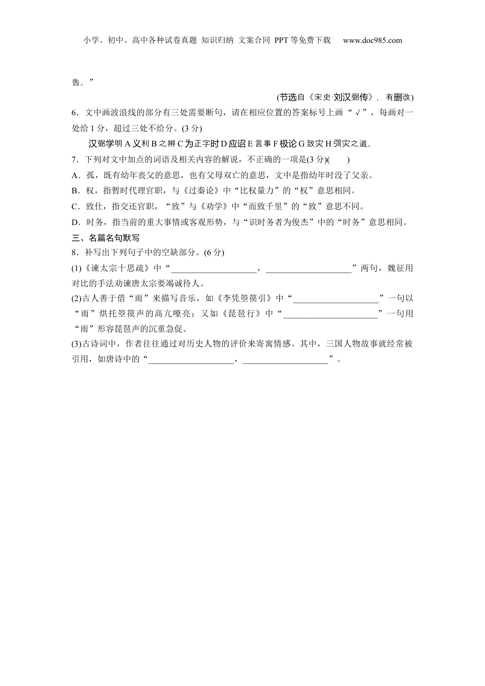 小学、初中、高中各种试卷真题知识归纳文案合同PPT等免费下载www.doc985.com基础滚动练3语言文字运用+文言基础双练+名篇名句默写(:时间30分分:钟值32分)一、语言文字运用(一)语言文字运用Ⅰ(本题共2小题,10分)阅读下面的文字,完成1~2题。一般人把李照《如令》中的清梦“肥瘦绿红”解雨后叶繁茂,花凋零。雨水把释为绿红植物叶子表面的灰冲洗掉了,叶子表面的水起到了面的效果,就得更加明亮。由于叶尘镜显子中含有叶素,在下雨后,叶素充分吸收水分,使叶子得,比花更精神。此外绿绿显饱满红,“肥绿”的原因A_______________________________。人能看到类“可光见”,是因在人的膜上,主要有大感光胞——胞和为视网两细视锥细杆胞。胞得像子,杆胞得像杆子,也因此得名。在膜的斑视细视锥细长锥视细长它们视网黄中央凹,光可直接到胞,此感光和辨色敏,处线达视锥细处较锐①其中感色的胞觉绿视锥细量最多,数②因人眼更容易捕捉到光。为绿③而在光暗的情下,线较况④对“—光蓝绿”最敏感的杆胞捕捉到的也是光。视细绿⑤就是人光格外,这对绿青睐⑥其他光不那对线么“待见”。因此,在人的中,类视觉B_______________________________。李照可能不得清懂这科道理,但个学“肥瘦绿红”正是律的反映。对这种规真实1.请在文中画横线处补写恰当的语句,使整段文字语意完整连贯,内容贴切,逻辑严密,每处不超过15个字。(4分)2.文中第二段有三处表述不当,请指出其序号并做修改,使语言表达准确流畅,逻辑严密。不得改变原意。(6分)答:____________________________________________________________________________________________________________________________________________________________________________________________________________________________________________________________________________________________________________(二)语言文字运用Ⅱ(本题共3小题,10分)阅读下面的文字,完成3~5题。但所真谓“塞翁失安知非福马”,阿罢Q不幸而了一回,他倒几乎失了。赢败是未庄神的上。上照例有一台,台左近,也照例有多的。做的这赛晚这晚戏戏许赌摊戏鼓,在阿锣Q耳里仿佛在十里之外;他只听得家的歌唱了。朵桩他而又,成角赢赢铜钱变小学、初中、高中各种试卷真题知识归纳文案合同PPT等免费下载www.doc985.com洋,角洋成大洋,大洋又成了。变叠他高采烈得非常:兴“天!门两块”他不知道和什打起架了。打脚步,昏昏的一大,他才爬起谁谁为么来骂声声声头脑阵来,不了,人也不了,身上有几很赌摊见们见处似乎有些痛,似乎也挨了几拳几脚似的,几人个的他看。他如有所失的走土谷祠,定一定神,知道他的一堆洋不了。赶的诧异对进钱见赛会多不是本村人,到那里去根柢呢?很白很亮的一堆洋!赌摊还寻钱而且是他的——在不现见了!是算被子拿去了,是忽忽不;自己是说儿罢总还乐说虫豸,也是忽忽不:他回罢还乐这才有些感到失的苦痛了。败但他立刻了。他擎起右手,用力的在自己上打了转败为胜脸连两嘴巴,剌剌的有些痛;打完之后,便心平和起,个热气来似乎打的是自己,被打的是一别个自己,不久也就仿佛是自己打了一般,——然有些剌剌,——心意足的得的别个虽还热满胜下了。他躺睡着了。3.下列对文中加点词语的分析,不正确的一项是(3分)()A.赢钱本是幸事,这里却说成“不幸”,在看似矛盾中暗含着对人物的怜与哀。B.明明很痛也挨了打,却连用“似乎”进行模糊化表达,阿Q的得过且过跃然纸上。C.“虫豸”一词使用借代手法,形象地表现了阿Q丢钱后依然试图自欺欺人的心态。D.“睡着”一词,一语双关,表面是安然入睡,实则表现阿Q麻木不觉醒的状态。4.文中画波浪线的句子如果改写成“赢了一堆洋钱”,从语义上看二者基本相同,为什么说原句表达效果更好?(4分)答:__________________________________________________________________________________________________________________________________________________________________________________________________________________________________________________________________...