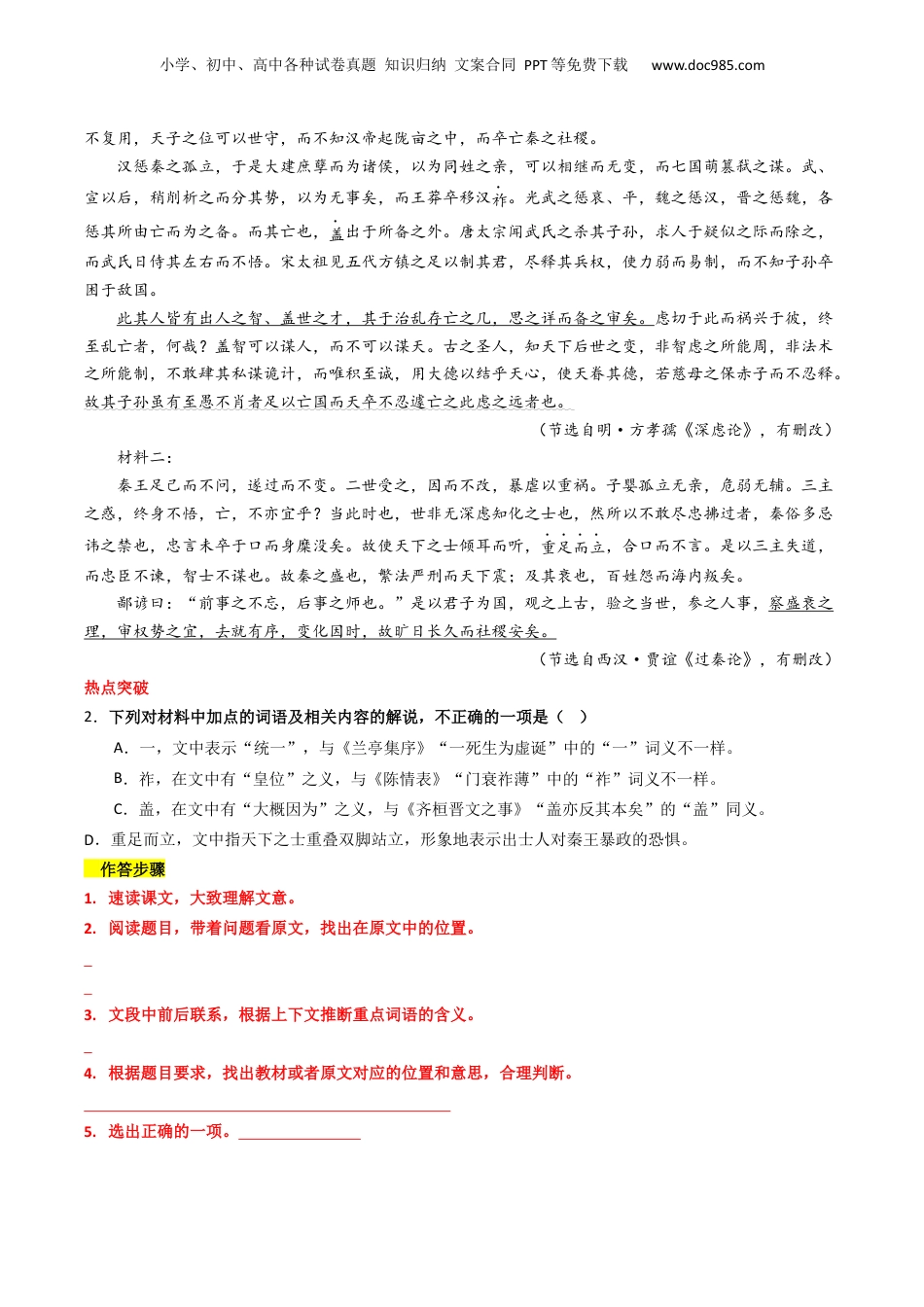 小学、初中、高中各种试卷真题知识归纳文案合同PPT等免费下载www.doc985.com热点09:古诗文阅读之文言复合文本比较阅读题型突破(原卷版)一、考情微观年份卷别提问方式设题角度2023新高考Ⅰ卷两则材料《韩非子·难一》《孔丛子·答问》1涂黑+2客观+1翻译+1主观概括文言基础知识+翻译概括能力新高考Ⅱ卷两则材料《百战奇略》《唐太宗李卫公问对》1涂黑+2客观+1翻译+1主观概括文言基础知识+翻译概括能力二、命题特点1.试题材料为复合文本,由两段文言文组合而成,第一次出现在新高考中,符合教材编排的群文阅读特点。2.两则材料,在内容上巧妙关联,所述事理简易顺畅,语言典雅规范,知识全面清晰,具有典范性,与高中毕业生文言文阅读水平相适应。3.考查文言文断句能力、文言文词语理解能力、文言文翻译能力以及事理分析能力,要求考生具备一定的批判性思维能力。试题与中学教材、课程标准有效关联,考查更加细致。解答这种题型的关键在于:1.读懂文本内容,解读文本内涵。2.紧扣教材篇目,夯实文言基础。3.拓宽阅读范围,培养文言语感。4.减少机械刷题,提高能力素养。(2023上·山西晋城·高三晋城市第一中学校校考阶段练习)阅读下面的文言文,完成下面小题。材料一:虑天下者,常图其所难而忽其所易,备其所可畏而遗其所不疑。然而祸常发于所忽之中,而乱常起于不足疑之事。岂其虑之未周与?盖虑之所能及者,人事之宜然;而出于智力之所不及者,天道也。当秦之世,而灭诸侯、一天下,而其心以为周之亡在乎诸侯之强耳;变封建而为郡县。方以为兵革可小学、初中、高中各种试卷真题知识归纳文案合同PPT等免费下载www.doc985.com不复用,天子之位可以世守,而不知汉帝起陇亩之中,而卒亡秦之社稷。汉惩秦之孤立,于是大建庶孽而为诸侯,以为同姓之亲,可以相继而无变,而七国萌篡弑之谋。武、宣以后,稍削析之而分其势,以为无事矣,而王莽卒移汉祚。光武之惩哀、平,魏之惩汉,晋之惩魏,各惩其所由亡而为之备。而其亡也,盖出于所备之外。唐太宗闻武氏之杀其子孙,求人于疑似之际而除之,而武氏日侍其左右而不悟。宋太祖见五代方镇之足以制其君,尽释其兵权,使力弱而易制,而不知子孙卒困于敌国。此其人皆有出人之智、盖世之才,其于治乱存亡之几,思之详而备之审矣。虑切于此而祸兴于彼,终至乱亡者,何哉?盖智可以谋人,而不可以谋天。古之圣人,知天下后世之变,非智虑之所能周,非法术之所能制,不敢肆其私谋诡计,而唯积至诚,用大德以结乎天心,使天眷其德,若慈母之保赤子而不忍释。故其子孙虽有至愚不肖者足以亡国而天卒不忍遽亡之此虑之远者也。(节选自明·方孝孺《深虑论》,有删改)材料二:秦王足己而不问,遂过而不变。二世受之,因而不改,暴虐以重祸。子婴孤立无亲,危弱无辅。三主之惑,终身不悟,亡,不亦宜乎?当此时也,世非无深虑知化之士也,然所以不敢尽忠拂过者,秦俗多忌讳之禁也,忠言未卒于口而身糜没矣。故使天下之士倾耳而听,重足而立,合口而不言。是以三主失道,而忠臣不谏,智士不谋也。故秦之盛也,繁法严刑而天下震;及其衰也,百姓怨而海内叛矣。鄙谚曰:“前事之不忘,后事之师也。”是以君子为国,观之上古,验之当世,参之人事,察盛衰之理,审权势之宜,去就有序,变化因时,故旷日长久而社稷安矣。(节选自西汉·贾谊《过秦论》,有删改)热点突破2.下列对材料中加点的词语及相关内容的解说,不正确的一项是()A.一,文中表示“统一”,与《兰亭集序》“一死生为虚诞”中的“一”词义不一样。B.祚,在文中有“皇位”之义,与《陈情表》“门衰祚薄”中的“祚”词义不一样。C.盖,在文中有“大概因为”之义,与《齐桓晋文之事》“盖亦反其本矣”的“盖”同义。D.重足而立,文中指天下之士重叠双脚站立,形象地表示出士人对秦王暴政的恐惧。作答步骤1.速读课文,大致理解文意。2.阅读题目,带着问题看原文,找出在原文中的位置。3.文段中前后联系,根据上下文推断重点词语的含义。4.根据题目要求,找出教材或者原文对应的位置和意思,合理判断。5.选出正确的一项。小学、初中、高中各种试卷真题知识归纳文案合同PPT等免费下载www....