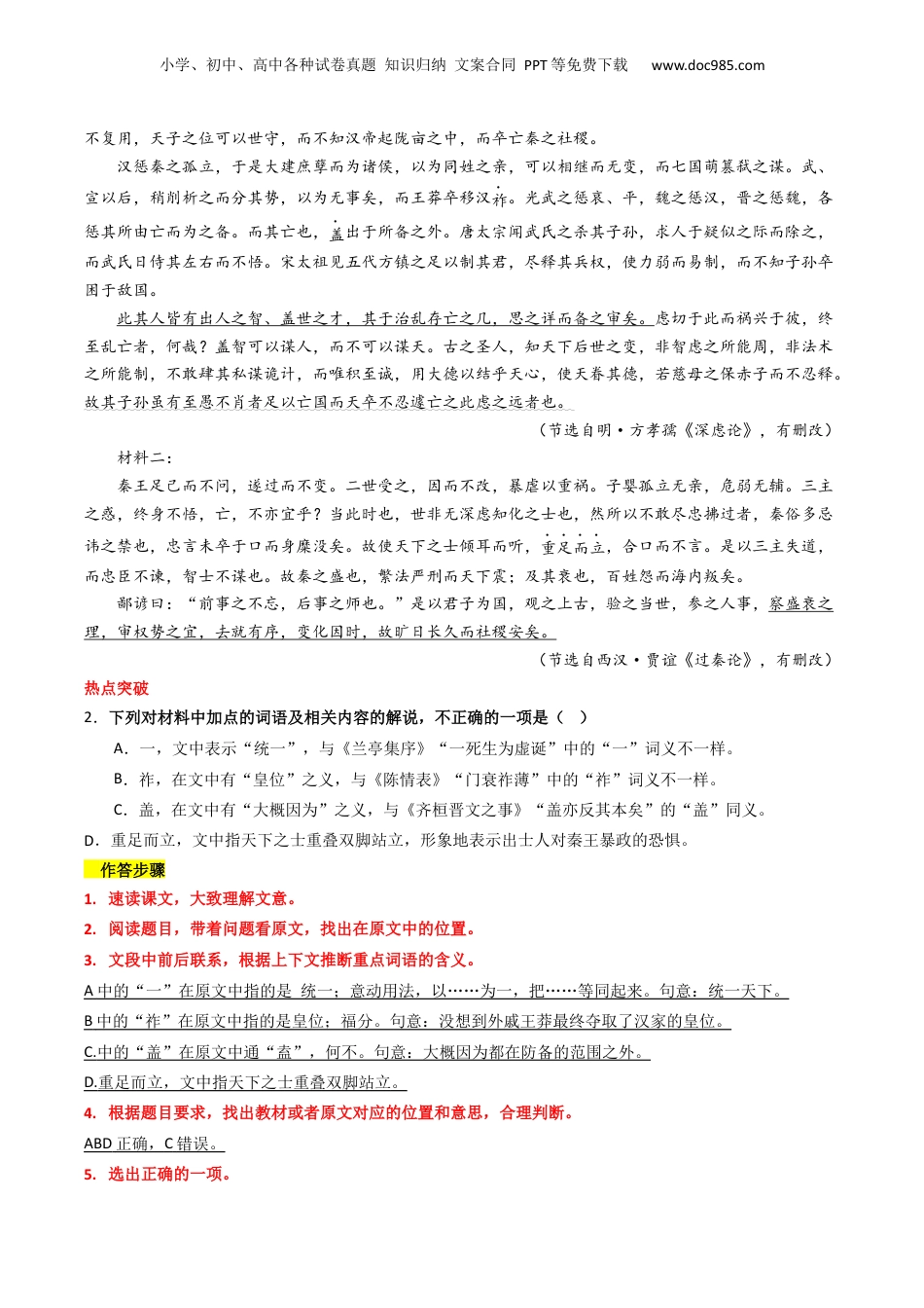 小学、初中、高中各种试卷真题知识归纳文案合同PPT等免费下载www.doc985.com热点09:古诗文阅读之文言复合文本比较阅读题型突破(解析版)一、考情微观年份卷别提问方式设题角度2023新高考Ⅰ卷两则材料《韩非子·难一》《孔丛子·答问》1涂黑+2客观+1翻译+1主观概括文言基础知识+翻译概括能力新高考Ⅱ卷两则材料《百战奇略》《唐太宗李卫公问对》1涂黑+2客观+1翻译+1主观概括文言基础知识+翻译概括能力二、命题特点1.试题材料为复合文本,由两段文言文组合而成,第一次出现在新高考中,符合教材编排的群文阅读特点。2.两则材料,在内容上巧妙关联,所述事理简易顺畅,语言典雅规范,知识全面清晰,具有典范性,与高中毕业生文言文阅读水平相适应。3.考查文言文断句能力、文言文词语理解能力、文言文翻译能力以及事理分析能力,要求考生具备一定的批判性思维能力。试题与中学教材、课程标准有效关联,考查更加细致。解答这种题型的关键在于:1.读懂文本内容,解读文本内涵。2.紧扣教材篇目,夯实文言基础。3.拓宽阅读范围,培养文言语感。4.减少机械刷题,提高能力素养。(2023上·山西晋城·高三晋城市第一中学校校考阶段练习)阅读下面的文言文,完成下面小题。材料一:虑天下者,常图其所难而忽其所易,备其所可畏而遗其所不疑。然而祸常发于所忽之中,而乱常起于不足疑之事。岂其虑之未周与?盖虑之所能及者,人事之宜然;而出于智力之所不及者,天道也。当秦之世,而灭诸侯、一天下,而其心以为周之亡在乎诸侯之强耳;变封建而为郡县。方以为兵革可小学、初中、高中各种试卷真题知识归纳文案合同PPT等免费下载www.doc985.com不复用,天子之位可以世守,而不知汉帝起陇亩之中,而卒亡秦之社稷。汉惩秦之孤立,于是大建庶孽而为诸侯,以为同姓之亲,可以相继而无变,而七国萌篡弑之谋。武、宣以后,稍削析之而分其势,以为无事矣,而王莽卒移汉祚。光武之惩哀、平,魏之惩汉,晋之惩魏,各惩其所由亡而为之备。而其亡也,盖出于所备之外。唐太宗闻武氏之杀其子孙,求人于疑似之际而除之,而武氏日侍其左右而不悟。宋太祖见五代方镇之足以制其君,尽释其兵权,使力弱而易制,而不知子孙卒困于敌国。此其人皆有出人之智、盖世之才,其于治乱存亡之几,思之详而备之审矣。虑切于此而祸兴于彼,终至乱亡者,何哉?盖智可以谋人,而不可以谋天。古之圣人,知天下后世之变,非智虑之所能周,非法术之所能制,不敢肆其私谋诡计,而唯积至诚,用大德以结乎天心,使天眷其德,若慈母之保赤子而不忍释。故其子孙虽有至愚不肖者足以亡国而天卒不忍遽亡之此虑之远者也。(节选自明·方孝孺《深虑论》,有删改)材料二:秦王足己而不问,遂过而不变。二世受之,因而不改,暴虐以重祸。子婴孤立无亲,危弱无辅。三主之惑,终身不悟,亡,不亦宜乎?当此时也,世非无深虑知化之士也,然所以不敢尽忠拂过者,秦俗多忌讳之禁也,忠言未卒于口而身糜没矣。故使天下之士倾耳而听,重足而立,合口而不言。是以三主失道,而忠臣不谏,智士不谋也。故秦之盛也,繁法严刑而天下震;及其衰也,百姓怨而海内叛矣。鄙谚曰:“前事之不忘,后事之师也。”是以君子为国,观之上古,验之当世,参之人事,察盛衰之理,审权势之宜,去就有序,变化因时,故旷日长久而社稷安矣。(节选自西汉·贾谊《过秦论》,有删改)热点突破2.下列对材料中加点的词语及相关内容的解说,不正确的一项是()A.一,文中表示“统一”,与《兰亭集序》“一死生为虚诞”中的“一”词义不一样。B.祚,在文中有“皇位”之义,与《陈情表》“门衰祚薄”中的“祚”词义不一样。C.盖,在文中有“大概因为”之义,与《齐桓晋文之事》“盖亦反其本矣”的“盖”同义。D.重足而立,文中指天下之士重叠双脚站立,形象地表示出士人对秦王暴政的恐惧。作答步骤1.速读课文,大致理解文意。2.阅读题目,带着问题看原文,找出在原文中的位置。3.文段中前后联系,根据上下文推断重点词语的含义。A中的“一”在原文中指的是统一;意动用法,以……为一,把……等同起来。句意:统一天下。B中的“祚”在原文中指的是皇位;福分。句意:没想到外戚...