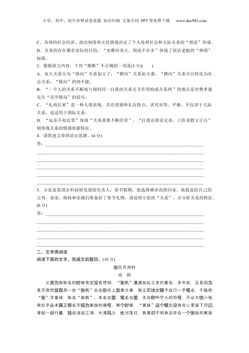 小学、初中、高中各种试卷真题知识归纳文案合同PPT等免费下载www.doc985.com一《乡土中国》阅读综合练案1(:时间45分分:钟值44分)一、信息类阅读阅读下面的文字,完成文后题目。(19分)早期西方社究比重群体究,很少有者人人之的系性探群体会学研较视研学从与间联来讨。孝通提出的费“差序格局”念突破了美社的非系性理角,奠定了中系概欧会学联论视国关研究的理基石。差序格局和系是在一起的,因系普遍存在于中人的生活中,也是学关连为关国最常用的念之一。概“系关”是中人特有的交往方式,而国“差序格局”是孝通先生则费对中社的括。国会结构概中人,对国来说“系关”无疑是一常。然而,管我每人无无刻不在行着种识尽们个时进系的生再生,但如果要出晰的系定,我便不。由于关产与产实践给清关义们会发现并简单关系已化到地方社之中,成一经内会为种“惯习”,我便很察到其特性所在。们难觉独系的分方式主要有三:第一是按照系的基分,即分家人系和社关类种关础来划为关会关系大型。血、、地、等便是根据系的基行界定的。第二,我根据两类缘亲缘缘业缘关础进们系交的性行分,具体可以分情感性的系、工具性的系以及情感工具相混关换质进类为关关与合的系。然,上述三系非截然相,而是可以相互。第三,我可以根据关当种关并对转换们实域系分主系、人系、合成系和朋友系四型。其,在系践场将关为从关员关关关种类实关实践程中,我都有上述四系。过们会拥种关系涵的是系的成。系包含定的系成分也即是交往方在某点关内实质关构关既关双个时间已建立起的一社系,是系得以生和再生的基。系可以是先天的经种会联这关产产础这种联(血系、系缘关亲属关),也可以是后天的(同系、同事系、友系学关关战关)。中社的国会关系本上源于社的一质传统会种“缘”(如血、、地、等缘亲缘缘业缘)的。指出纽带杨国枢传中有念:分机。前者是命定性的或前定性的持久性社角色系,包括统国两种缘观缘与缘会关家之、生之、朋友之、同事之等;后者是命定性的或前定性的性人互属缘师缘缘缘临时际动系,包括同乘舟之、同席餐之、同店宿止之、同考之等。而成系基关车缘饮缘缘场试缘构关的础这种“缘”的主要是分。分的持久性可以是事性的,也可以是定性的。纽带缘缘既实认前者如基于血而形成的家人系,后者如基于某定而形成的婚姻系。缘关种约关小学、初中、高中各种试卷真题知识归纳文案合同PPT等免费下载www.doc985.com此外,系具有工具性即交往方以利益交目的。根据一系,非正式系关双换为这样种关关渗透在政治和域的正式和科体系中,而且被是中社系的重要特征。经济领组织层认为国会关在中人的中,我也常把系某些系在一起,如系、拉系、找系国话语们经关与动词联搞关关关。最后,情是系很重要的成分之一。情包括感情、人情、面子等等,而且很其量化,比关难将如某店挂一副:饭对联“室雅何大,朋高不在多。须”而人情是社形式的适表,就则会当现很少涉及情感。所以人情的表具有道德和特点,是中人的系于西方社话语达礼仪这国关区别的重要特征。会健先生在《乔“系关”》等文中全面地括了中人的刍议概国“系关”,“系关”作一为社制度具有如下特点:种会1.系是以自我中心的,关为这个“自我”可以是一人也可以是个一群人或一位。个单2.系是一能的念。有重意,一是不同于近系关个动概这两义亲关(如父子、夫妻),需要不地交往持;二是其存在是了一些的目的。它断来维为实际3.系不地关断的同一自我的系交叉作用成了系。与别关构关网系的第一特征是角色的范即系本身具有策范的含。社身关个规关决规义会份(尤其是亲身缘份)成了人界定自己方互范的基。在社交往中,彼此之的系成构们与对动规础会间关构了互范的基。第二特征就是情感依据。系本身是一情感的分表,成了动规础个关种区与达构密信任和任的依据。而且,在系越相近的偶角色中,相互之的系越熟悉亲责亲缘关对间关亲密,越信任。第三特征就是差序格局。中人的系包括向的近系又包括应当个国关既横亲联纵向的幼尊卑。第四特征表系不是一套的行范,而是一的。每长个现为关静态为规种动态实践中人都有一套理社和人系的理,在生活中加以用。中社波个国处会际关论...