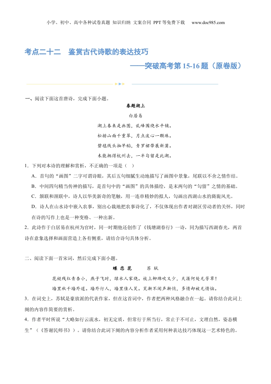 小学、初中、高中各种试卷真题知识归纳文案合同PPT等免费下载www.doc985.com考点二十二鉴赏古代诗歌的表达技巧——突破高考第15-16题(原卷版)一、阅读下面这首唐诗,完成下面小题。春题湖上白居易湖上春来是画图,乱峰围绕水平铺。松排山面千重翠,月点波心一颗珠。碧毯线头抽早稻,青罗裙带展新蒲。未能抛得杭州去,一半勾留是此湖。1.下列对本诗的理解和赏析,不正确的一项是()A.首句的“画图”二字可谓诗眼,其后五句细腻生动地描写了画图中景象,尾联以不舍之情作结。B.中间四句精当传神的描写,是首句中的“画图”的具体描绘,是末两句的“勾留”之情的基础。C.颔联和颈联中,诗人以华美新奇的笔触,用一连串精妙的拟人,勾画出西湖山水的旖旎风光。D.诗人在山水诗中嵌入农事,别出心裁地把农事诗化了,不仅体现出作者对湖区劳动者的关怀,同时在诗的写作上也是一种变格、一种出新。2.此诗作于白居易在杭州为官时,同一时期他还创作了《钱塘湖春行》一诗,同为描写西湖春光,两首诗在意象选择和画面营造上各有侧重,请结合诗句具体分析。二、阅读下面一首宋词,然后完成下面小题。蝶恋花苏轼花褪残红青杏小,燕子飞时,绿水人家绕。枝上柳绵吹又少,天涯何处无芳草!墙里秋千墙外道。墙外行人,墙里佳人笑。笑渐不闻声渐悄,多情却被无情恼。3.在词史上,苏轼是豪放派的代表作家,但在这首词中,作者把两种风格融合在一起。请你结合此词上阕的内容作简要的赏析。4.作者平时所说“大略如行云流水,初无定质,但常行于所当行,常止于不可止,文理自然,姿态横生”(《答谢民师书》)。请你结合此词下阕的内容分析作者采用何种表达技巧体现这一艺术特色的。小学、初中、高中各种试卷真题知识归纳文案合同PPT等免费下载www.doc985.com三、阅读下面这首清诗,完成各题。天农寺同景玉桐君①施润章远山齐木杪②,一带晚烟横。月照竹林早,露从衣袂生。云中孤塔隐,峰顶怪禽鸣。偶借支公榻③,萧然梦亦清。[注]①这首诗写于康熙七年(1668年)夏末秋初,诗人由家乡赴浙江杭州、绍兴一带游览之时。景玉桐是诗人的朋友。②木杪(miǎo):树梢。③支公榻:指代天衣寺的床榻。“支公”指东晋佛学家支遁,好谈玄理,曾与定居在会稽的书法家王羲之交游。5.下列对这首诗的赏析,不正确的一项是()A.首句写天衣寺远处的山影与树梢相齐,后句写远山前漂浮着玉带似的雾霭。B.“露从衣袂生”,“生”字用得很形象,滴滴夜露打湿衣袖显示出初秋之夜的清冷。C.“峰顶怪禽鸣”写怪禽的鸣叫,一个“怪”字,表现了诗人的厌烦之情。D.诗歌虚实结合,前三联实写所见之景,后一联想象梦中,感触,虚实相生,突出了环境的清幽。6.请结合诗句赏析这首诗的写景技巧(艺术)。四、阅读下面这首宋诗,完成各题。晨起陆游初听高枝鹎鵊鸣,旋闻深井辘轳声。堙笼小台犹疑雨,日射东窗顿作晴。古洗注汤供浇濯,春畦摘菜助炰烹。老人颓惰虽堪笑,终胜胸中怀不平。7.下列对这首诗的理解和赏析,不正确的一项是()A.首联中的“鹎鵊鸣”“辘轳声”“初听”“旋闻”,从听觉的角度描绘出田园初醒宁静又不失活力的景象。B.颔联“犹疑”“顿作”,凝练生动,一个情迁自然、心系晴雨的诗人形象呼之欲出。C.颈联通过“古洗注汤”和“春畦摘菜”两个动作的细节描写表现了诗人晨起的习书之乐与饮食之乐。D.尾联直抒胸臆,以“颓惰”“堪笑”自嘲,但难掩避世隐居的自得自适之情,心中的不平得以消释化解。小学、初中、高中各种试卷真题知识归纳文案合同PPT等免费下载www.doc985.com8.这首诗如同陆游闲居乡野的生活纪录片,直观形象地再现了诗人晨起的生活轨迹。请赏析本诗的叙事艺术。五、阅读下面的唐诗,完成下面小题。秋日题窦员外崇德里新居唐刘禹锡长爱街西风景闲,到君居处暂开颜。清光门外一渠水,秋色墙头数点山。疏种碧松通月朗,多栽红药待春还。莫言堆案无余地,认得诗人在此间。【注】堆案,堆积案头,谓文书甚多。9.下列对本诗的解说,不正确的一项是()A.从首联可以看出,诗人谪居多年,心情苦闷,受朋友窦员外邀请,来到他的崇德里新居,看到街西美丽的风景,禁不住喜笑颜开。“开颜”二字...