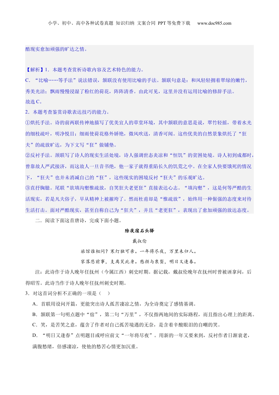 小学、初中、高中各种试卷真题知识归纳文案合同PPT等免费下载www.doc985.com考点二十一读懂古代诗歌,鉴赏诗歌形象——突破高考第15-16题(解析版)一、阅读下面这首唐诗,完成下面小题。狂夫杜甫万里桥西一草堂,百花潭水即沧浪。风含翠筿①娟娟净,雨裛②红蕖冉冉香。厚禄故人③书断绝,恒饥稚子色凄凉。欲填沟壑惟疏放,自笑狂夫老更狂。【注】①筿(xiǎo):细竹。②裛(yì):同“浥”,沾湿。③故人:严武。诗人初到成都时,曾靠严武接济,分赠禄米。1.下列关于这首诗的赏析,不正确的一项是()A.首联写诗人的居住环境,万里桥与百花潭,草堂与沧浪,相互衬托,自然天成,诗人在经历颠沛流离后获得了一处安居之所,心情是轻松舒展的。B.杜甫诗中善用叠字,如“流连戏蝶时时舞,自在娇莺恰恰啼”,本诗颔联中“娟娟”“冉冉”既生动形象,又富有音韵之美。C.颔联用比喻、色彩对比、多感官描写等手法,描绘了一幅令人陶醉的图画:微风轻吹,翠竹轻摇,细雨蒙蒙,荷花妖娆,红翠相映,色彩鲜明。D.颈联中的“厚禄”“恒饥”放在句首,强调“恒饥”的贫困处境,使尾联的“欲填沟壑”的说法不致有失实之感。2.本诗运用哪些手法塑造了“狂夫”这一形象?请结合诗歌简要分析。【答案】1.C2.①烘托手法。诗的前两联描写草堂环境。翠竹明净悦目,荷花清香可闻,以优美的自然景象烘托了“狂夫”的疏放旷达。②反衬手法。颈联写自己的现实生活处境,在全家人快要饿死的情况下,“狂夫”却从没有被生活的磨难压倒,反衬了“狂夫”的乐观旷达。③直抒胸臆。尾联“惟疏放”“自笑狂夫老更狂”,诗人进行自我解嘲,表达了诗人在岁月流逝中面对严小学、初中、高中各种试卷真题知识归纳文案合同PPT等免费下载www.doc985.com酷现实愈加顽强的旷达之情。【解析】1.本题考查赏析诗歌内容及艺术特色的能力。C.“比喻……等手法”说法错误,颔联没有使用比喻的手法。颔联句意是:和风轻轻拥着翠绿的嫩竹,秀美光洁;飘雨慢慢浸湿了粉红的荷花,阵阵清香。由此可见,这里并没有运用比喻的修辞手法。故选C。2.本题考查鉴赏诗歌表达技巧的能力。①烘托手法。诗的前两联传神地描写了优美宜人的草堂环境,其中颔联的意思是说,翠竹轻摇,带着水光的细枝疏叶,明净悦目;细雨使荷花格外娇艳,微风吹送,清香可闻。这些优美的自然景象烘托了“狂夫”的疏放旷达,为下文写“狂”做铺垫。②反衬手法。颈联写了诗人的现实生活处境,诗人强调世态炎凉和“恒饥”的贫困处境。诗人初到成都时,曾靠故人严武接济,而这故人一旦音书绝,他一家子就得重陷长久的饥荒之中。在全家人快要饿死的情况下,“狂夫”也并未消减自己的“狂”,这些现实的困境反衬“狂夫”的乐观旷达。③直抒胸臆。尾联“欲填沟壑惟疏放,自笑狂夫老更狂”直接表达心志。“填沟壑”,这是何等严酷的生活现实,若是凡夫俗子,早从精神上被摧垮了。然而杜甫却是“惟疏放”,始终用一种倔强的态度来对待生活打击。面对严酷现实,甚至自称自己为“狂夫”,并且“老更狂”,表现出了愈加顽强的放达态度。二.阅读下面这首唐诗,完成下面小题。除夜宿石头驿戴叔伦旅馆谁相问?寒灯独可亲。一年将尽夜,万里未归人。寥落悲前事,支离笑此身。愁颜与衰鬓,明日又逢春。注:此诗作于诗人晚年任抚州(今属江西)刺史时期。据记载,戴叔伦晚年在抚州时曾被诬拿问,后得昭雪。此诗当作于诗人晚年任抚州刺史时期。3.对这首词分析不正确的一项是()A.首联用设问开篇,更能突出诗人孤苦凄凉之情,为全诗奠定了感情基调。B.颔联第一句明点题中“宿”,第二句“万里”,不仅指两地间的实际路程,而且指出心理上的距离。C.笑,是苦笑之意,蕴含了作者对自己孤苦境遇的无奈,是含着辛酸眼泪的自嘲的笑。D.“明日又逢春”点明题目或呼应前文“一年将尽夜”。用新的一年又要来到,反衬作者日渐衰老,满腹愁绪,倍感凄凉,使他的愁苦心情更加沉重。小学、初中、高中各种试卷真题知识归纳文案合同PPT等免费下载www.doc985.com4.诗的前四句刻画了一个怎样的形象?请简要说明。【答案】3.B4.刻画出一位漂泊异乡、孤独愁苦的游子形象。除夕之夜,...