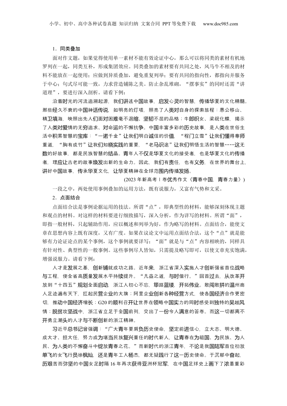 小学、初中、高中各种试卷真题知识归纳文案合同PPT等免费下载www.doc985.com写作训练1写作“爱材”,用之有道复习任务掌握考场上素材运用的方法,能够根据不同素材类型使用不同的运用方法。活动一掌握“一材多用”与“多料合用”的方法存材、选材和用材是作文材料使用上的三个完整环节。“一则金素材,半篇好文章”,说的是考场作文素材运用的妙处。可是,不少考生一到考场,感觉平时积累存储的素材一点也用不上。其实,无论你准备了多么丰富的素材,也不可能完全切合作文要求。这时,你需要尽量地、巧妙地把平时存贮的素材往文题上拉一拉,靠一靠,甚至扭一扭。这里就有一个“打通素材运用最后一公里”的问题,即要掌握考场素材运用的方法。(一)一材多用一则好的素材往往是立体的、多元的,根据立意不同,可以从材料中得到不同的需要。我们要学会使用不同的方法寻找素材与作文立意对应的“契合点”,合理有效地加以运用。1.陈材新用(1)转换常规解读视角新颖的材料未必就是新近发生的故事,“新”还来源于视角的转换。“横看成岭侧成峰,远近高低各不同”正是材料运用的最佳境界。当别人一窝蜂地从正面、从常规视角去使用材料时,我们不妨逆风而上,反其道而行之,运用逆向思维,从反面看常规,即颠倒一下观察认识的角度,其新奇之处和材料价值就一下子显露出来了,这样就能避开俗套,写出新意。例如,有篇《假如陶潜从政》的文章,就是一篇反弹琵琶的范文。陶渊明是大家很熟悉的人物,选陶渊明来写,材料很难出新。但作者独辟蹊径,选择不愿为官的陶渊明的“政绩”来写,“哪壶不开提哪壶”,陶渊明的政绩确实不显著。作者认为,陶渊明辞官归隐,是“社稷之幸,民族之幸”,是明智的选择。作者让我们看到陶渊明的另一面,材料有新意,文章因此也“亮”了起来。(2)内容上“化详为略”,形式上“化少为多”一般常见的素材因为为人熟知,使用起来不必详细展开,而要按照观点的需要点到为止。在形式上多用这样的素材铺排,形成“化少为多”。这种做法,不但没有减弱论证作用,反小学、初中、高中各种试卷真题知识归纳文案合同PPT等免费下载www.doc985.com而因为以形式取胜,让观点显得更加普遍、合理。请看下例:本小,但就像一空容器,书虽个时“于,集于灌木黄鸟飞”的美意象、丽“金戈,铁马万里如虎气吞”的宏大景、场“究天人之,通古今之际变”的深沉思考……古今中外都可尽收其中。人翻籍,就如同打了一的精神世界。们开书开个辽阔(李拯《,看更的世界》读书见开阔)文中“黄鸟于飞,集于灌木”出自《诗经·葛覃》,“金戈铁马,气吞万里如虎”出自辛弃疾的《永遇乐·京口北固亭怀古》,“究天人之际,通古今之变”出自司马迁的《报任安书》。这些源于教材的素材,由于我们比较熟悉,只需选取能论证观点(“人们翻开书籍,就如同打开了一个辽阔的精神世界”)的部分内容就可以了。素材的恰当运用,尽管篇幅很短,但照样能让人觉得作文有文采。如源于社会现实的示例:一粒米,江邱谷村的村民碱让苏沭阳“尝”到了致富新滋味;一部,电视剧让“在深养闺”的湖南家界牧笛溪村成了张“打卡地网红”;信坚“苦点累点,日子不差会”的云南昆明夫,用搏下向上的故事张顺东妇拼书写奋发脱贫……段以,各大媒体在这时间来纷纷“奋斗百年路,航新征程启”目栏开设“同心奔小康”子目,广大者激情走基,栏记满怀进层满腔情近群,情行中,者述一精彩的中故事。热贴众倾书写进国为读讲个个国(李《脚下沾有泥土,心中沉淀情》伟红真)这些源于社会现实的素材,尽管素材的典型性显得一般,但由于从不同地域(“江苏沭阳邱谷村的村民”“湖南张家界牧笛溪村”“云南昆明张顺东夫妇”)列举了三个事例,从而让广大记者走进基层,书写精彩中国故事这种现象在当今中国显得比较普遍,自然就增强了文章观点提出的可信度。2.虚拟推演虚拟推演是指在素材积累和运用过程中,考生要有意识、有条理地去分析一种社会现象、一个人物、一个事件。因此,我们可以把推演的过程当成写作的过程。只有经历这样的过程,我们在写作时才能快速、有序、有质量地展现自己的逻辑思维。例如,在下面的学生习作《人间有味是优...