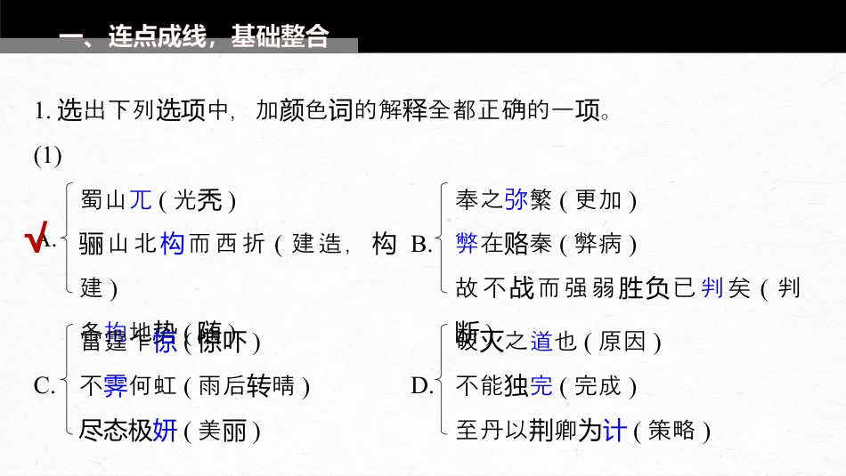 《阿房宫赋》《六国论》必修下册(五)连点成线整合突破一、连点成线,基础整合1.出下列中,加色的解全都正确的一。选选项颜词释项(1)A.蜀山兀(光秃)山北骊构而西折(建造,构建)各抱地势(随)C.B.D.奉之弥繁(更加)弊在秦赂(弊病)故不而强弱已战胜负判矣(判断)雷霆乍惊(惊吓)不霁何虹(雨后晴转)尽态极妍(美丽)破之灭道也(原因)不能独完(完成)至丹以卿荆为计(策略)√B判:定,确定。项决C:震。项惊响D完:保全。项(2)A.覆压三百余里(覆盖)高低冥迷(分辨不清)立缦远视(姿美好态)C.B.D.思厥先祖父(祖、父辈辈)五终继国迁灭(亡灭)可谓智力孤危(智和力量谋)秦爱奢纷(繁奢侈华)管弦呕哑(音低沉声)日益固骄(固骄横顽)至于覆颠(亡灭)下而六破亡之从国故事(矩、制旧规度)或未易量(易判轻断)√A立:久立。项缦C:音。项呕哑声杂乱D故事:事。项旧2.出下列各中,加色的意思代完全相同的一。选项颜词与现汉语项(1)A.瓦缝差参B.思厥先祖父C.一日之,一之,而内宫间候气不齐D.而得者,与战胜其实百倍√A古今都是项义“短、高低、大小不长齐”。B古:泛指祖、父。今:父的父。项义辈辈义亲亲C古:天。今:一定地里多年察所得到的括性的项义气义区经过观概象情。气况D古:的量。今:表示所的是情项义它实际数义说实际况(承上文,多含折意转)。(2)A.楚之齐精英B.刺客不行C.斯用兵之效也D.可谓智力孤危√C古今都是项义“使用武力,行进战争”。A古:金玉珍等物。今:项义宝义(事物)最重要、最好的部分;出类拔萃的人。B古:不去行刺。今:不可以,不被允。项义义许D古:智和力量。今:人、理解客事物用知、项义谋义认识观并运识等解的能力,包括、察、想象、思考、判等。经验决问题记忆观断3.下列各中,加色的活用型分正确的一是项颜词语类类项①始速焉祸②魏之韩经营③燕之赵收藏④义不秦赂⑤得而谁族也灭⑥六王,四海毕一⑦以事秦之心礼天下之奇才⑧李牧连却之⑨朝歌夜弦⑩后人哀之而不鉴之⑪道行空,不何复霁虹⑫不能独完⑬辇于秦来A.①④⑤⑥⑦⑪⑫/②③/⑧⑩/⑨⑬B.①⑫/②③/④⑤⑦⑨⑪⑬/⑥/⑧⑩C.①⑫/②③/④⑤⑥⑦⑩⑪/⑧/⑨⑬D.①⑫/②③/④⑤⑦⑪/⑥/⑧/⑨⑬/⑩√①⑫均形容作,为词动词②③均作名,为动词词④⑤⑦⑪均名作为词,动词⑥作,为数词动词⑧使用法,为动⑨⑬均名作,为词状语⑩为意用法。动A.使之柱,多于南之夫负栋亩农五于秦赵尝战C.族秦者秦也,非天下也者无使威之所劫哉为国为积B.六者六也,非秦也灭国国六破,非兵不利,不善国灭战D.戍卒叫,函谷举牧以洎谗诛√4.下列各句子中,句式不相同的一是组组C判句项断/被句。动A均后置句。项为状语B均判句。项为断D均被句。项为动5.判下列文化常的正。断识误(1)所避,即遇到君主、尊、兄弟的名字相同的文字就采用某谓讳与长种方法加以回避。()×避不包括兄弟的名字。讳(2)“锱”和“铢”都是古代的位,二者用形容其微。货币单连极细()ד锱”和“铢”都是古代的重量位。单二、连点成线,微点突破1.120个实词积累、识记(1)易易易甲骨文小篆隶楷书书“易”是象形字,甲骨文又成写“”,像用装酒的杯子人斟酒。满给别是“赐”的本字,表示,引申赐给为“换”。义项例句①秦相,或未当与较易量(《六》国论)②以羊易之(《桓晋文之事》齐)③移风易俗,民以殷盛(《逐客》谏书)④以乱易整,不武(《之武退秦》烛师)⑤取之岂易而守之乎难(《太宗十思疏》谏)⑥,看不起轻视高祖亭,素为长易吏诸(《史记·高祖本》纪)⑦平坦地形险易知之尽(《策》战国)易轻替,交换换改,更改变替代容易“易”的基本意有:一是义两个“改,更变变”(日月,意日从从为月变换);一是“容易”(也古人日月是平常容易的事许认为变换吧)。由“改变”引申出“交,互换换”“修治,治理”的意;由义“容易”引申出“平坦”(平坦的路容易走)。【识记方法】[解加色字释颜]得和氏璧,秦王欲以城赵易()璧,相如蔺曰:“秦城不予,璧不可易()得。”秦王怒,左右欲刃相如,然相如面不易()色,自如,令秦王不应对易()相如。后完璧。归赵【迁移小练】,交换换容易,易轻,改变变轻视(2)奇奇奇小篆隶楷书书“奇”是形字,小篆声从“大”部,可声(古音相近)。表示奇特的、奇异的...