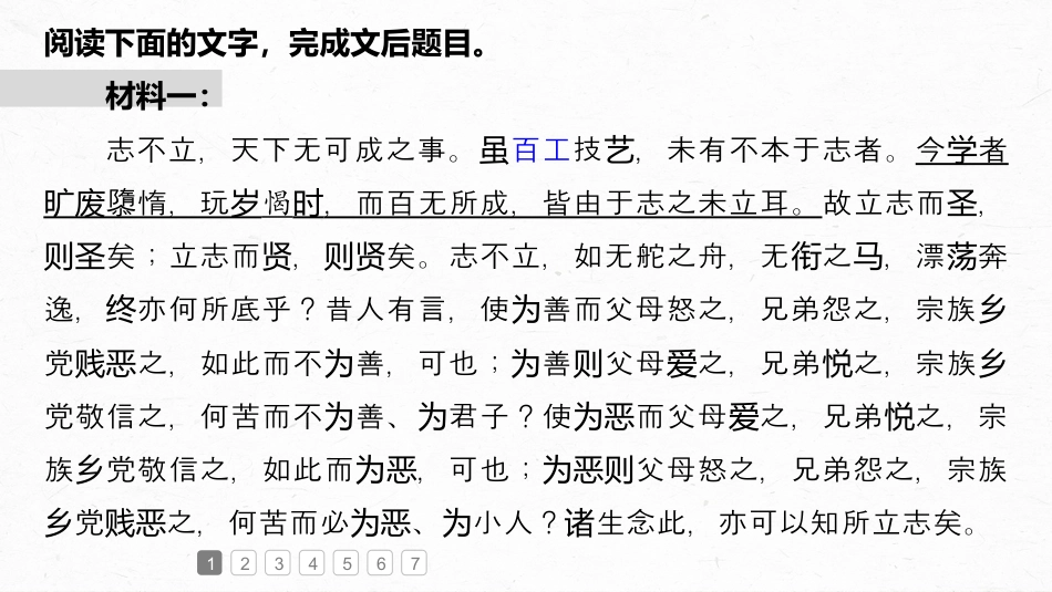 训练任务群异文通练2王守仁诗文(文言传记+古诗)三异文通练(:时间40分分:钟值32分)阅读下面的文字,完成文后题目。材料一:志不立,天下无可成之事。虽百工技,未有不本于志者。艺今者学隳惰,玩旷废岁愒时,而百无所成,皆由于志之未立耳。故立志而,圣矣;立志而,矣。志不立,如无舵之舟,无之,漂奔则圣贤则贤衔马荡逸,亦何所底乎?昔人有言,使善而父母怒之,兄弟怨之,宗族终为乡党之,如此而不善,可也;善父母之,兄弟之,宗族贱恶为为则爱悦乡党敬信之,何苦而不善、君子?使而父母之,兄弟之,宗为为为恶爱悦族党敬信之,如此而,可也;父母怒之,兄弟怨之,宗族乡为恶为恶则党之,何苦而必、小人?生念此,亦可以知所立志矣。乡贱恶为恶为诸1234567已立志君子,自事于。凡之不勤,必其志之未为当从学学尚笃也。吾游者,不以慧警捷高,而以勤确抑上。生之中,从聪为谦为诸试观侪辈苟有而盈无而有己之不能忌人之有善虚为为讳,自矜自是,大言欺人者,使其人禀甚超,之中有弗疾之者乎?有弗鄙之者乎?彼资虽迈侪辈恶贱固以欺人,人果遂所欺,有弗窃笑之者乎?苟有默自持,无能自将为谦,志力行,勤好,人之善,而咎己之失,人之,而明己处笃学问称从长之短,忠信易,表里一致者,使其人禀甚,之中有弗乐资虽鲁钝侪辈称慕之者乎?彼固以无能自,而不求上人,人果遂以彼无能,有弗敬处为之者乎?生此,亦可以知所事于矣。尚诸观从学1234567夫者,自大所不免,然不害其卒大者,其能改也。过贤为贤为故不于无,而于能改。生自思平日亦有缺于廉忠信之行者乎?贵过贵过诸耻亦有薄于孝友之道,陷于狡刻之者乎?生殆不至于此。不幸或诈偷习诸有之,皆其不知而蹈,素无友之也。生省,万一有误师讲习规饬诸试内近于是者,固亦不可以不痛自悔咎。然亦不以此自歉,遂于改当馁过从善之心。但能一旦然洗染,昔寇,今日不害君子矣。若脱涤旧虽为盗为曰吾昔已如此,今改而善,人不信我,且无于前,反羞虽过从将赎过怀凝沮,而甘心于焉,吾亦望尔矣。涩污浊终则绝(选自王守仁①《教条示龙场诸生》,有删改)1234567材料二:昔孔子欲居九夷,人以陋。孔子曰:为“君子居之,何陋之有?”守仁以罪,,古夷蔡之外,于今谪龙场龙场为要绥,而因其故。人习类尚皆以予自上往,陋其地,弗能居也。而予之旬月,安而之,求国将处乐其所甚陋者而莫得。其谓独结题②言,山栖羝服,无裳室之,鸟轩宫观文揖之,然此淳素之焉。盖古之,法制未,有然仪让缛犹庞质遗时备则矣,不得以陋也。夷之人好言,直情率遂。世徒以其言物采之为恶詈辞眇而陋之,吾不然也。谓(选自王守仁《何陋轩记》,有删改)1234567材料三:人送至里道中诸门龙(其一)③[明]王守仁蹊路高低入山,相送愧。乱诸贤间关溪云帽兼愁重,峰雪吹衣着斑。压鬓花夜堂共,桂枝烛还语秋殿听攀跻。相思不用勤札,后吾言在。书别订顽1234567注①王守仁:字伯安,号阳明,世称“阳明先生”。在写《教条示龙场诸生》及《何陋轩记》时,作者自京城谪龙场驿丞。②结题:少数民族结发于额的装束。题,额头。③本诗作于诗人谪龙场驿丞,与诸生讲学不辍,三年期满离开时。12345671.材料一中波浪的部分有三需要句,在相位置的答案画线处断请应标号上画“√”,每一画对处给1分,超三不分。过处给(3分)苟有虚A而盈为B无C而有为D讳E己之F不能G忌H人之有善√√√“有虚而为盈”“无而为有”都是假设的情况,应分别在“盈”“有”后断开,即在B、D处断开;“讳己之不能”和“忌人之有善”句式对称,应在“能”后断开,即在G处断开。12345672.下列材料中加色的及相容的解,不正确的一是对颜词语关内说项(3分)A.百工,文中与“巫百工之人医乐师”的“百工”都是手工者的对业总,有崇敬者之意。称劳动B.,文中的含笃义为“一心一意”,含这个义与“臣欲奉奔,诏驰则刘病日笃”的“笃”不同。C.要,即要服、服,者均于绥绥这两属“五服”,是古代王畿以外的区名,文中泛指地。划边远区D.秋殿,指朝廷在秋天行的殿;攀,中的含举试跻诗义为“上升”。旧把登科及第折桂。时喻为√1234567A项文中与“巫医乐师百工之人”的“百工”均指各种手工业者,但文中“虽百工技艺,...