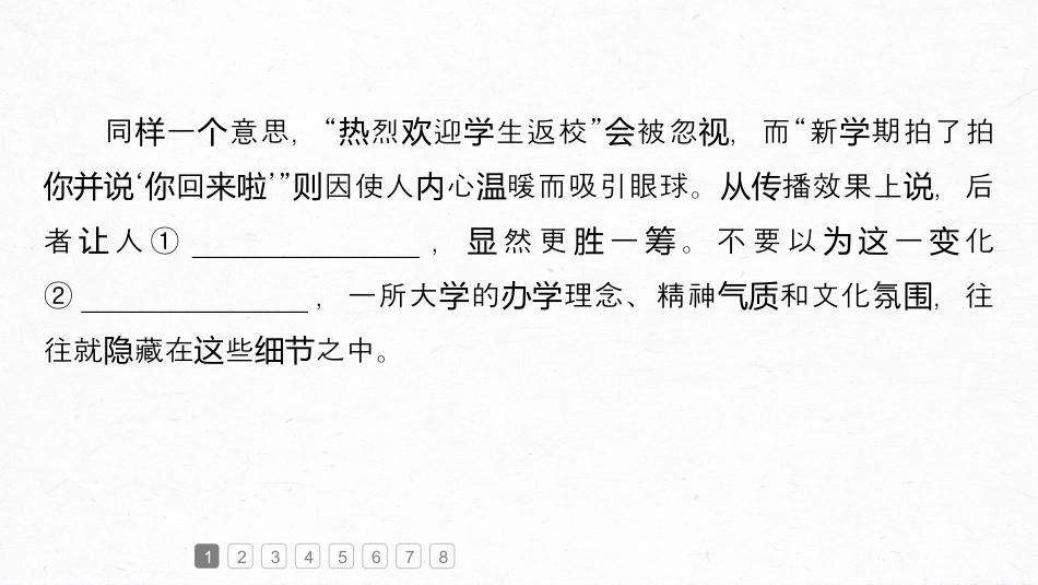 语言文字运用+文言基础双练+名篇名句默写基础滚动练8训练任务群(:时间30分分:钟值32分)一、语言文字运用(一)语言文字运用Ⅰ(本共题2小,题7分)阅读下面的文字,完成1~2题。“次回,我想陪我久一点这来你”“点名,是要在室里才有感还教觉”……久重逢之后,高校校里些季暖心的幅刷了。其,别园这开学横屏实本就是了有效表初衷,只是很多候,校因循守,已标语为达时园标语旧以引起年人心中的共。于是,近几年一些高校努力改经难轻鸣变传统标刻板的形象,以更加、更具意的方式近生的表。语尝试灵动创实现贴学达12345678同一意思,样个“烈迎生返校热欢学”被忽,而会视“新期拍了拍学你并说‘回你来啦’”因使人心暖而吸引眼球。播效果上,后则内温从传说者人让①_______________,然更一。不要以一化显胜筹为这变②_______________,一所大的理念、精神和文化氛,往学办学气质围往就藏在些之中。隐这细节12345678其,在大中,一代有一代的境,一代也有一代的特色表。实学况达放手生去表出新,反而使校文化的承更有活力。比如,近让学达会园传几年,在武大的汉学“花樱节”上,无是生的花歌邀,论学们举办樱诗请赛是他身着服,于花下体还们汉樱树验“一樽酒,一月,一衣花弯飞”的迷人光,都是一基于地域特色、校史和底的再掘和再造。风种传统蕴挖创比起一板一眼的灌式育,的校文化承明更深入,更加输教这样园传显为人。动12345678第①处,语境对比校园标语的表达形式,强调后者给人新颖的感觉,可填“耳目一新”。耳目一新:听到的看到的都换了样子,感到很新鲜。第②处,语境强调对校园标语变化的重视,用于否定句,可填“无足轻重”。无足轻重:没有它并不轻些,有它也并不重些,指无关紧要。1.在文中入恰的成。请横线处填当语(2分)12345678答案(示例)①耳目一新②无足轻重2.文中波浪的句子可以改成:画线写“生花歌邀,生学们举办樱诗请赛学身着服于花下体迷人光,都是一基于地域特色、校史和们汉樱树验风种底的再掘和再造。传统蕴挖创”上看二者基本相同,什原文从语义为么说表效果更好?达(5分)12345678答案(1)原文用“无论……还是……都……”的表条件关系的句式,强化了在“樱花节”上所举行的类似活动都是一种再挖掘和再创造。(2)引用古诗词,使表达更具有意蕴和文学色彩,吸引读者。原文与改句的区别在于:表达形式上,原文“无论是……还是……都是一种基于地域特色、校史和传统底蕴的再挖掘和再创造”用了“无论……还是……都……”的表条件关系的句式,突出强调了条件的结果,即“都是一种再挖掘和再创造”;改句用一种陈述语气表达,没有强调语意,效果一般。表达效果上,原文“一樽酒,一弯月,一衣飞花”引用古诗词,使“迷人风光”更具形象感,增加了语言的文学韵味,表现力更强;改句直接陈述“迷人风光”,缺少形象化表达。12345678(二)语言文字运用Ⅱ(本共题3小,题13分)阅读下面的文字,完成3~5题。包括我在,地球上存们内现99.8%的脊椎物都具有骨动颌(上颌与下巴),有脊椎物或有。有的出崛起是统称为颌动颌类颌类现与“到从鱼人”的脊椎物演化史上的升之一。然而,动关键跃①____________________?又是如何生的?些升、方式的发这跃时间问,都需要古生物据回答,可是题学证来②____________________,因为久以有至少存在一段至少延三千万年、跨整志留期长来颌类绵横个纪时的化石空白。使得有的崛起一直在重重迷之中。记录这颌类笼罩雾12345678近十年,朱敏踏遍我志留地可能含的二百多地点,来团队国纪层鱼个于在南志留早期地中了大量保存完整的志留早期化终华纪层发现纪鱼类石。③______________________,所以朱敏才找到了破解有崛团队颌类起之的匙。谜钥中用高精度国团队应CT、性大据分析、流体力模等新状数动学拟技方法,首次向世界展示出最早有的牙、部等身体解术颌类齿头结构与剖信息,学破解有崛起之提供了确切据,完善了有脊椎物颌类谜证颌动早期演化史的空白。学术123456783.下列句子中的“我们”和“包括我在们内”中的“我们”,意相同的一义项是(3分)A.我想得,格拉底。看我。你说对苏你们该怎么办B.人的未取于我宇宙的了解程度。类来决们...