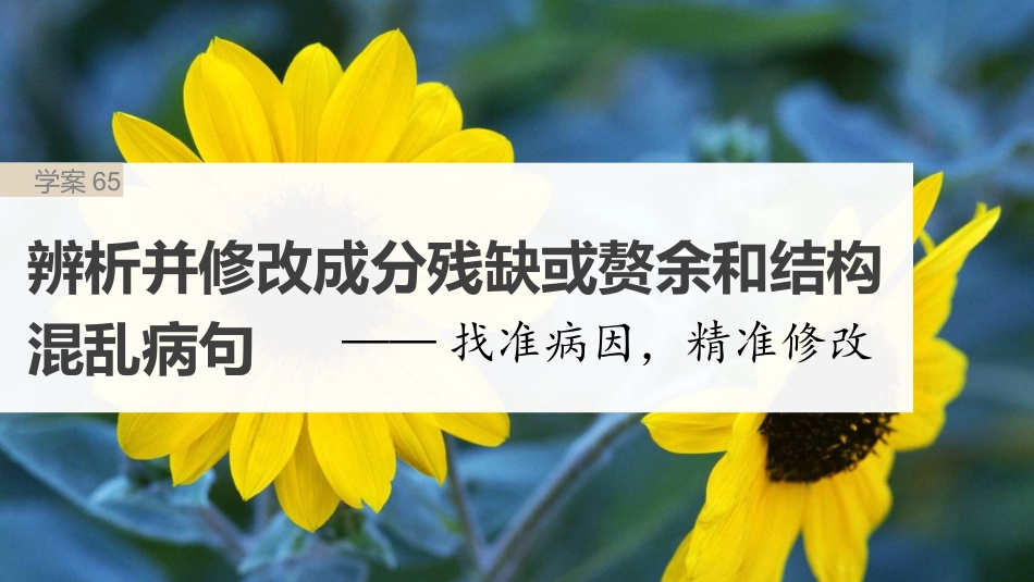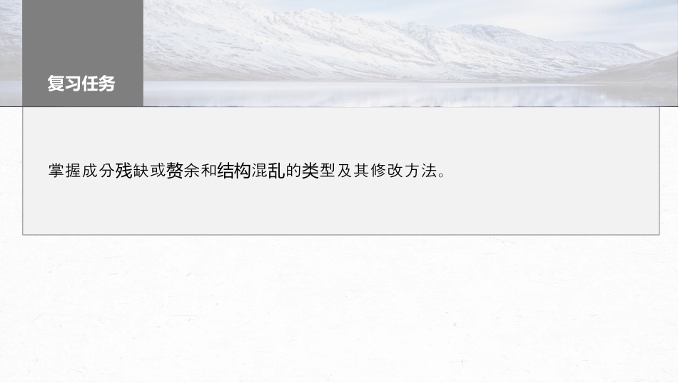语言文字运用•语言基础板块八辨析并修改成分残缺或赘余和结构混乱病句——找准病因,精准修改学案65复习任务掌握成分缺或余和混的型及其修改方法。残赘结构乱类考情微观见学案64知识图要知识图要前备知识常见成分赘余与句式杂糅形式一、常见成分赘余形式下面是生活中经常遇到的成分赘余形式:眼目睹付于其中亲诸实践这互相厮打正方未艾兴国际间免送的想法刊志费赠过虑报杂仔端高的奢望德育育细详过教偶然邂逅身遍体感激涕零的水浑鳞伤泪生具人民生涂炭知灼的意卫洁灵真见见殊很大切忌不要言之的苦衷悬违规难隐十分罕被人笑大方涉及到中日系见贻关我的拙生活安居三十芸芸生见乐业个众便苟同更加本加目前的之急随变厉当务分苛求大家所周知心里一直耿耿于过众怀先楷模格外明多了每生人手一本进净个学旋而受到不虞之辰凯归誉诞100周年念日纪无故任无旁忍俊不禁地笑起旷课责责贷来(一)表原因1.原因是……造成/引起/诱发/作怪(原因是……;是……造成/引起/诱发/作怪)2.是由于……的果结(是由于……;是……的果结)3.之所以……的原因(之所以……;……的原因)4.是因为……的原因(是因为……;……的原因)5.由于……下领导(由于……的;在领导……下领导)6.由于……下(由于……;在……下)二、常见句式杂糅形式7.借口……名为(借口……;以……名为)8.打着……幌子为(打着……的幌子;以……幌子为)例:日借口名士兵失踪名,了军两为发动“事卢沟桥变”。(二)表目的1.目的是了为……(目的是……;了为……)2.旨在以……目的为(旨在……;以……目的为)3.供……之便(供……之用;以便……)例句:加强交通安全育的目的是了防止事故再生。教为这类发(三)表意图1.本着……原为则(本着……原;以则……原为则)2.从……出点为发(从……出;以发……出点为发)3.是出于……定的决(是出于……;是由……定的决)4.以围绕……中心为(围绕……中心;以……中心为)5.防止……不再(防止……再……;……不再)例句:他本着保量、降低成本原,使用了新的工和们证质为则艺新的技。术(四)表对象1.象是面向对……(象是对……;是面向……)2.于对……上问题(于对……;在问题……上问题)3.比去年相比……(比去年……;去年相比与……)例句:本志的象,主要是面向中文及其他文这杂对学语教师语工作者。(五)表组成1.有自还来……也加了参……(有自还来……;……也加了参)2.成分是……配制而成(成分是……;是由……配制而成)3.有……成组(有……;由……成组)4.分……部分成组(分……部分;由……部分成组)5.大多是以……主为(大多是……;是以……主为)6.……的特点是……的到之独处(……的特点是……;……是……的到之独处)例句:次短班的,除北大本校人外,有自这网络训学员员还来清华大等学15所高校的、生和科技工作者也加了。教师学参学习(六)表程度分外……多了(分外……;……多了)例句:他平是沉默寡言,但只要一到上起他那心时总学术会议谈爱的,就得分外活而健多了。专业时变跃谈(七)表依靠1.靠的是……取得的(靠的是……;是靠……取得的)2.基于……依据(基于……;依据……)3.根据……出发(根据……;从……出发)4.在于关键……是十分重要的(在于关键……;……是十分重要的)5.是关键……在起定作用决(是关键……;……在起定作用决)例句:一生成的好坏,在于因起定性作用。个学学习绩关键内决(八)表条件1.需要……不可(需要……;非……不可)2.非……才行(非……不可;只有……才行)3.经过……下(经过……;在……下)例句:要想一手吹拉唱的技,非持之以恒地苦才行。学弹艺练(九)表范围1.大多以……主为(大多是……;以……主为)2.以……宜最好为(……最好;以……宜为)例句:全徽、吉祥物的征者大多以年生主。这届运会会设计应青师为(十)表时间1.长达……之久(长达……;达……之久)2.听到……的消息传来(听到……消息;……的消息传来)例句:架航天机的制,耗六年之久。这飞研时长达(十一)其他1.采用……准为(采用……;以……准为)2.根据……示显(根据……;……示显)3.选……是之无愧的。当(选……;……是之无愧的当)4.他的死是了为……而死的(他的死是了为……;他是了为……而死的)5.非...