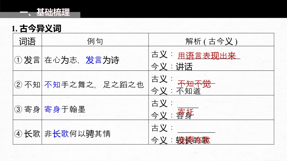 文言文阅读•教材文言文复习板块五《上枢密韩太尉书》《古代文论选段》学案40词语例句解析(古今义)①言发在心志,为言发为诗古:义_______________今:义讲话②不知不知手之舞之,足之蹈之也古:义_________今:不知道义③寄身寄身于翰墨古:义_____今:容身义④歌长非歌长何以其情骋古:义_________今:的歌义较长一、基础梳理1.古今异义词用言表出语现来不知不觉寄托放高歌声词语例句意义(1)负①或负戈外戍②山苍负雪,明天南烛(《登泰山》记)③故不而强弱战胜负已判矣(《六》国论)④犯乃死,重见负国(《武》苏传)⑤使负之柱栋(《阿房》宫赋)⑥秦,贪负其强(《廉相如列》颇蔺传)仗恃2.多义实词背背,引申覆盖负为失败辜负承担(2)或①或骨朔野横②或命巾,车或棹孤舟(《去兮》归来辞)③秦相,当与较或未易量(《六》国论)④道,别从东或失道(《汉书·霍去病》传)通“惑”,迷惑(3)形①以文者之所为气形②不者不能者之为与形(《桓晋文之事》齐)③自以心既为形役(《去兮》归来辞)④日星曜,山岳潜隐形(《岳》阳楼记)⑤之,视形若土狗《促》织有的人有时或许表现情形形体形迹形象,形状例句活用型及类释义①入周公、召公则②出方叔、召虎则③无高山大野可登以自览广④一言以自闻壮⑤不志其大⑥嘉寄以会诗亲⑦根情,苗言,华,声实义3.词类活用名作,在朝词状语内名作,出征词状语形容的使用法,使词动……广宽形容的使用法,使词动……壮名的意用法,以词动……志为/形容词作名,大的方面词形容作,表密词动词现亲名的意用法,以词动……根为/苗/例句句式特点(指出志标词)①而也未之焉辙见②听其之宏辨议论③其容貌之秀观伟④莫先乎情,莫始乎言⑤此等皆非大人不能语词道⑥恐晏、公所不也欧诸许4.特殊句式前置句,志:未宾语标词(否定词)之(宾语)定后置句,志:之语标词定后置句,志:之语标词后置句,志:乎状语标词判句,志:非断标词被句,志:动标词为……所5.文化常识(1)《上密枢太尉》韩书密:密院是唐、五代、宋、、元等朝代的官署名,官密枢枢辽称长称枢使,唐代密使主要掌管枢______,似秦的太尉,故琦太尉。类汉时称韩为(2)太尉事执事:侍执从(侍君王左右,侍奉的人随随从)。不直接方,而称对称“执事”,表示______方,可对译为“您”。政军敬称(3)《毛序》,是一篇诗_________文章。一孔丘弟子子夏所作,专论说为一宏《》所作的序,分大序和小序。大序《说为东汉卫为诗经为为关雎》解之后作者所作的全部《》的的序言,小序是三百零题诗经总诗经五篇中每一篇的序言。一般而言的《毛序》是指大序。诗(4)《典论·文》,三魏文帝论国_______所撰,是一篇非常重要的文论著作,在中文理批史上具有代的意。国学论评划时义(5)《品》,是南朝梁诗国_______所著的著,是存最早的评诗专现诗论著,的出志着中古代文理文批展到新段,被专它现标国艺论与学评发阶代之祖。视为历诗话歌理诗论曹丕钟嵘(6)《人》是王所著的一部间词话国维__________著作。已初具理它论体系,是以最有影的著作之一。晚清来响“境界”是《人》的核说间词话心,是王文批的出点,也是其文思想的宿。既国维艺评发艺总归文批学评二、重点巩固(一)名句默写1.出下列句子中的空缺部分。补写(1)《上密太尉》中,就文章方面表了自己的看法,其中枢韩书苏辙写发表明作者点的句子是:观“_________________,___________________,______________。”(2)《上密太尉》中枢韩书“________________,___________________”句作者居家十九年交往的象。两写对以文者之所形为气然文不可以而能学可以而致气养其居家所游者与不其里党之人过邻乡(3)在《古代文段论选·毛序》中,作者先是诗对“诗”下了定,义认为诗歌是“____________”,接着了歌在和在外的表形式是阐释诗内两种现“__________,__________”。(4)在《古代文段论选·典论·文》中,曹丕论从“有利于家国”和“有益于自身”角度高度价两个评“文章”的大功能的句子是两“_________,____________,____________”。(5)《古代文段论选·品序》中,表明《》作用的句诗诗经总结是“______________,________”。(6)《古代文段论选·人》中,间词话“_______,________...