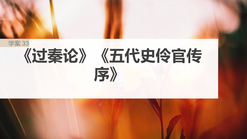 文言文阅读•教材文言文复习板块五《过秦论》《五代史伶官传序》学案33例句指出通假本字及意义①孝公既没②合从交缔③粮而赢景从④而倔起阡陌之中⑤非及乡之士也时一、基础梳理1.通假字同“殁”,死同“纵”,合是六合起共同付秦纵国联来对的策略国同“影”,像影子一样同“崛”,起兴同“向”,先前词语例句解析(古今义)①人爱厚而宽人爱古:义_________今:丈夫或妻子,中男女的一方义恋爱②中人才能不及中人古:义_________今:方介、解等做的义为双绍买卖调纠纷并见证人③人事非岂人事哉古:义_________今:人的离合、境遇、存亡等情,于工作义况关人的用、培、配、等工作员录养调奖惩2.古今异义词人爱护别平常的人人的作为④事从遣则事从以一少牢告庙古:义________________________今:投身到义(事中去业);(按某法种办)理处⑤意气其意气之盛古:义______今:意志和,志趣和性格,由于主和偏义气概观激而生的情产绪⑥前驱盛以囊,锦而负前驱古:义__________今:在前面起引作用的人或事物义导官名,里泛指一般官这属气势向前奔驰词语例句意义(1)固①秦孝公据崤函之固②君臣固守以周室窥③寡固不可以敌众(《桓晋文之事》齐)④夫子固拙于用大矣(《五石之瓠》)⑤夫之心,日益独骄固(《阿房》宫赋)⑥根不固而求木之长(《太宗十思谏疏》)3.多义实词固的地险势牢固地本来确实固、固执顽固稳(2)遗①惠文、武、昭襄蒙故,因业遗策②秦无亡矢遗之镞费③至匈奴,置既币遗于单(《武》苏传)④乎如飘飘遗世立独(《赤壁》赋)(3)归①而皆背晋以归梁②君臣相,不知所顾归③尽归使路充等汉国(《武》苏传)④后五年,吾妻来归(《脊志》项轩)⑤一日克己,天下复礼归仁焉(《论》语)留下的遗来失丢送赠离、离开脱附归返回使……归女子出嫁、称赞称许(4)徒①氓隶之人,而徙之迁徒也②郯子之徒,其不及孔子贤(《》师说)③仲尼之徒无道桓文之事者(《桓晋文之齐事》)④妾不堪使,驱徒留无所施(《孔雀南》东飞)⑤强秦之所以不敢加兵于者,赵徒以吾人在两也(《廉相如列》颇蔺传)只是、仅仅服役的犯人劳一人类徒、弟子门徒然、白白地(5)率①率疲弊之卒,百之将数众②六互,国丧率秦耶赂(《六》国论)③子路率尔而曰对(《子路、曾、冉有、公西皙侍坐》华)④此吾所以敢率性就死不汝也顾(《妻》与书)率领全都,一概率轻遵循、沿着(6)却①却匈奴七百余里②却坐促弦弦急转(《琵琶行》)③王者不却庶众(《逐客》谏书)④却看妻子愁何在,漫卷喜欲狂诗书(杜甫《官收河南河北》闻军)⑤何共剪西窗,当烛却巴山夜雨话时(李商《夜雨寄北》隐)⑥才下眉,头却上心头(李照《一剪梅》清)使退却,退击退回推、拒辞绝回头表示重或,复继续、再还表折转例句活用型及类释义①履至尊而制六合/子孙帝王万世之也业/然涉陈瓮牖绳之子枢②有席卷天下,包宇,举内囊括四海之意/天下云集响,粮而应赢景从③追亡逐北4.词类活用名作,履,登上;帝王,词动词帝王;瓮,用瓮做;,用称称绳草系绳名作,席,像席子一;词状语样包,像包裹一;囊,像口袋一样;云,像云一;,像回样样响声一;景,像影子一样样作名,逃走的人动词词④尊贤而重士⑤且夫天下非小弱也⑥外衡而连斗侯诸/流血漂橹/二周而吞亡侯诸/却匈奴七百余里/序八州而朝同列⑦以愚黔首/盟而会谋弱秦⑧函梁君臣之首,形容作名,人;重,意贤词词贤动用法,以……重为形容作,小,小;弱,弱词动词变变使用法,斗,使动……斗;漂,使争……漂浮;亡,使……亡;却,使灭……退却;朝,使……朝见使用法,愚,使动……愚蠢;弱,变使……弱变名作,用匣子装词动词⑨可以忧劳兴,逸豫可国以亡身⑩夫患常于祸积忽微,而智勇多困于所溺使用法,,使动兴……盛;亡,使兴……亡灭形容作名,忽微,小的事;智勇,词词极有才智勇的人气例句句式特点(指出志标词)①此四君者,皆明智而忠信……②然涉瓮牖之子陈绳枢……③子帝王万世之也孙业④以金人十二铸为⑤身死人手,天下笑者为⑥仁不施义5.特殊句式判句,志:皆断标词判句,无志断标词判句,志:也断标词定后置句,中心是语词“金人”,“十二”是定,无志语标词被句,志:动标词为前置句,正常序宾语语为“不施仁义”,无志标词⑦燕...