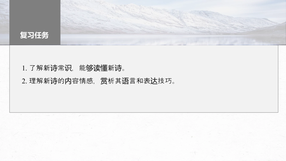 板块四文学类阅读•新诗与戏剧新诗阅读与鉴赏——先,析要读懂为赏为学案20复习任务1.了解新常,能新。诗识够读懂诗2.理解新的容情感,析其言和表技巧。诗内赏语达知识图要前备知识新诗分类及特征一、概念与分类1.新念诗概新是相于古典歌而言的,是指五四以后的歌;五四诗对诗运动诗运之前的歌叫古典歌,上把古典歌叫古。动诗诗习惯诗诗新是由古代歌展而的。由古代渡到代,里生了诗诗发来过现这发两大革:一是歌的外形韵律,打破了字的限度韵律范;二是变诗与数与规抒情的深度度生了巨大的化,超出了古抒悲愁的范。与宽发变远远诗发围就一点,新也叫自由,古代歌叫格律。然,新中也这来讲诗诗诗诗当诗包含今人的古体写诗(上体习惯称旧诗)。如毛的《七律泽东·征》,长是体,也是新。它旧诗诗2.新分诗类(1)按作品容的表方式,分事和抒情。内达为叙诗诗①事:中有比完整的故事情和人物形象,通常以人叙诗诗较节诗满激情的歌唱方式表。史、故事、体小等都于一。怀来现诗诗诗说属这类②抒情:主要通直接抒人的思想感情反映社生活,不诗过发诗来会要求描述完整的故事情和人物形象。如情歌、歌、哀歌、挽歌、牧节颂歌等。(2)按作品言的音韵格律和形式,分格律、自由和散语结构为诗诗文。诗①格律:按照一定格式和成的歌。的行、诗规则写诗它对诗数诗句的字数(或音节)、音韵、仗、句式排列等有格的定。声调词语对严规②自由:近代美新展起的一体。不受格律的限制,诗欧发来种诗它无固定的格式,注重自然的、在的奏,押大致相近的韵或不押韵,内节字、行、句式和音都比自由,言比通俗。数数调较语较③散文:兼有散文和的特点的一文体裁。作品中有的诗诗种学诗意境和激情,常常富有哲理,注重自然的奏感和音美,篇幅短小,节乐像散文一不分行,不押韵。样二、基本特征1.分行排列,整散合。结分行排列是代歌于其他文体现当诗区别样式最基本的外在形式;言上整散合,富有奏感、韵律感。语结节2.立意新,含深情。颖饱立意新、致,抒情感、人,颖别发真挚动体人人生、社的新奇和特深刻的感悟。现诗对对会发现独3.想想象,跳自如。联跃用丰富的想、想象,描生活中的事运联写物等抒情感。在描程中,意象的用、情感的抒等都具有跳来发写过选发性。跃4.言凝,形象生。语练动代歌能用凝、准确、生的现当诗够练动语言,集中地反映生活,勾生活景等。画图5.合,意境美。虚实结优人往往通具体的意象,的角度诗过从虚实描不离,又能超越的景物、面等,通主感受把绘既脱现实现实画并过观描的容一步升,丰富的境界。写内进华创设艺术活动一掌握新诗内容理解题的答题技巧知识图要阅读下面的诗歌,完成后面任务。金的稻束黄[注]敏郑金的稻束站在黄割的秋天的田里,过我想起无疲倦的母,数个亲昏路上我看那了的美的,黄见皱丽脸收日的月在获满高的上,耸树巅暮色里,山远着我的心,围们边有一雕像能比更默。没个这静肩荷着那大的疲倦,伟你们在伸向的一片这远远秋天的田里低首沉思,默。默。史也不是静静历过脚下一流去的小河。条而,站在那,你们儿成人的一思想。将为类个注本自《集诗选诗1942—1947》,作者敏是郑20世纪40年代后期出的现“中新派国诗”(也叫“九叶派”)的代表人之一。诗1.诗歌导图精读这一篇,会读这一类2.九叶诗派是抗后期和解放期的一具有代主向的歌流派。它战战争时个现义倾诗成主要有辛笛、穆旦、敏等。因集出版集《九叶集》而得名。员郑结诗在文念上首先主的是它学观张“人的文学”“人民的文学”和“生命的文学”的合。反逃避的唯,也反扼的唯功利综既对现实艺术论对杀艺术,企在之求得恰的平衡。论图现实与艺术间当强反映掘心的一,作野,具有强烈的它调现实与挖内统诗视开阔时代感、史感和精神。历现实在上,持反浪漫主,致力于新的艺术坚对义诗风诗“代化现”建和设“感受力的革命”,自追求主代派的融合。觉现实义与现一、理解词句内涵1.中的诗“大的疲倦伟”“默静”“思想”是理解意的三,分诗个关键词语请三的涵。别说说这个词语内练透这一群,会做这一类答案(1)“大的疲倦伟”:“疲倦”指母在亲“金的稻束黄”成收长与获过程中的辛辛;辛辛看似平凡,大,包含着母劳与艰这种...