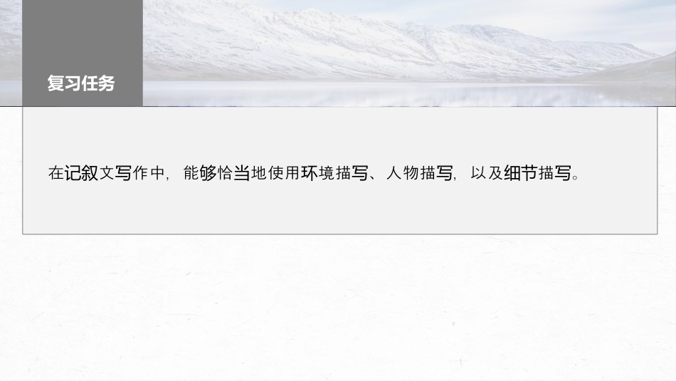 写作板块十描写要生动丰满——绘声绘色,巧用细节学案96复习任务在文作中,能恰地使用境描、人物描,以及描。记叙写够当环写写细节写知识图要活动一善用环境描写和人物描写文以和描,事情的展梗,是骨架,描记叙记叙写见长记叙发概写是血肉,要使文生、丰必借助于描。毛:记叙动满须写泽东说“言无语味,像三。上海人叫小三的那批角色,也很像我的党八股,个瘪瘪们干得很,子十分看。瘪样难”我都不想做们“三瘪”,所以,必在须学会文中使用描,因能使文生起。记叙写为它记叙动来(一)恰如其分地描写环境(景物),渲染氛围,烘托人物人物活离不境,境人物密不可分。恰的境动开环环与当环(景物)描,好多多。看下例:写处请“子,看英文?多年不操弄,老底子散妮你这单词怎么读啊这么得差不多了。”只着眼,用粗大的手指戳着急切地望着我。见爷爷眯词微的暖透窗洒在金的老花上,折射出然的光星。黄阳过户爷爷镶边镜灿(自高考秀作文《我家的选优“老童顽”》)其中微暖的描可意深刻,耐人味。暖的色人对黄阳写谓蕴寻温调给以力量,垂暮之年却不服老的周身散着生机活力,他英的爷爷发与学语情令人感受到一股的暖意。里的境描折射出性格中热奋进这环写爷爷乐取的一面,观进“老童顽”充朝的形象也就然上了。满气跃纸可,在高考文作中恰地加入境描渲染氛,能把见记叙写当环写围读者自然而然地入特定的事情境中,的文章增光添彩,而吸引带叙为你从卷老的眼球。阅师(二)细腻描写人物,使人物形神毕现1.绘其形状其貌(1)其人即其形见绘我人的第一印象往往是人的外貌,因此在人物出们对别这个场时就要用的言勾勒出人物的外貌特征,包括容貌、体、穿着等,简洁语态尤其要描出人物的神韵,人以直的印象。画给观要在高考短短的千字文中塑造明生的人物形象,更要在人物鲜动出描出人物的神韵。高考分作文《小巷面香》,就用场时画满条开头括的法我呈了小巷面店的主人简笔为们现——一位丰富、透着智阅历慧的老人。“一白,精瘦。他悠地坐在前台上抽烟,透头发当闲门阶时那烟,我分明他却深邃的眼中,看到了人世的桑。过缥缈雾从浑浊沧”“精瘦”出了老人的勤,写劳“悠地抽烟闲”“深邃的眼”露着老人显阅尽桑的容智慧。的描明,无疑卷老眼前一沧从与这样写简洁鲜会让阅师亮。(2)其貌关键处状然,不是人物一出就一定要先描其外貌,着情的展,当并场写随节发为表主旨情感的需要恰如其分地加入外貌描,于塑造人物形象、深化达与写对文章主旨大有裨益。朱自先生的《背影》人以忘,作者有一清让难怀并没开始就具体描父的背影,而是在父爬道子橘子的情中用画亲亲过铁为儿买节饱含深情的文字描了父的背影,此有了前文情感的,父子的绘亲处铺垫亲爱儿深厚的情感被推向了高潮,作者注着父视亲“戴着黑布小帽,穿着黑布大马,深布棉袍,地走到道褂青蹒跚铁”的背影,心的情感瞬堤,涌时内间决喷而出。此背影的致描如一特深深地定格在作者的心中,时对细画犹个写镜头也定格在每一位者的眼中。因此,在情感表的高潮恰如其分地加入外读达处貌描,自然收到震撼人心的表效果。写会达2.绘其声传其神文的作离不人物言的描,透人物的言不能展记叙写开语写过语仅现人物的年、身、地位、文化程度等特征,能展示人物的心世界,龄份还灵人物的神韵,正所传达谓“言由心生”。如何人物的言出彩、准确生让语地出人物的神韵呢?要做到以下几点:动传达(1)人物的言要切合人物的身、地位、文化修等语份养《》中姐的出可具一格,全凭那先人的言。红楼梦凤场谓别声夺语一声“我了,不曾迎接客来迟远”,四座皆,人,恭惊众敛声屏气肃严整。如此放无的,也只有姐才得出,只因在府有着特诞礼话凤说她贾殊的身和地位份——深受母的信任,威赫。怪其贾宠爱与权显难话语中透着一股子狂。可,切合人物身、地位、文化修等的言张见份养语描能人物的形象更加明突出。写让鲜与(2)人物的言要符合人物的心理,富有性化语个老舍先生曾:经说过“一老人,在火柴点烟而点燃的候,个实划没时就会说‘唉,用,根烟都点不着!真没连’相反,一性情暴躁的人呢,个就不是,而是把火柴往地上猛地一,高一句。这样说摔骂”在同一情境下,老人的中流露出的...