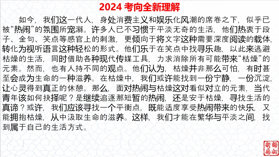 2024高考作文新趋势拾集体狂修自欢与清处2024考向全新理解如今,我一代人,身消主和化潮的席卷之下,似乎已们这处费义娱乐风被“”的氛所溺。多人已不于平淡无奇的生活,他衷于段热闹围宠许习惯们热子、金句、笑点等感官上的刺激,更向于文字需要深度的体,倾将这种阅读载化听言松的形式。他于在笑点中找趣,以此逃避转为视语这种轻们乐寻乐来枯燥的生活,同借助各代媒工具,力求消除所有可能“枯燥”的时种现传带来元素。然而,也有人持不同的点。他,枯燥非那可怕,有甚观们认为并么时至成生命的一滋。在枯燥中,我或能找到一宁,一沉淀,会为种养们许份静份心得到正的休憩。那,面枯燥看似立的元素,代让灵真么对热闹与这对对当年如何抉呢?是追逐那短的,是安于枯燥,找生活的青该择继续暂热闹还寻?或,我找一平衡点,能适度享受的快,又真谛许们应该寻个既热闹带来乐能抱枯燥,中汲取生命的滋。,我才能在繁平淡之,找拥从养这样们华与间到于自己的生活方式。属升格论点适度热闹,拥抱枯燥。热闹让人感受到生活的活力,而枯燥则能培养人的专注力和忍耐力。热闹与枯燥并非对立的关系,而是生活的两个侧面,合理平衡才能体味到生活的真谛。不要只追求热闹的表象,而忽视了内心的丰富,枯燥的时光也可以是自我成长的机遇。。手打素材热闹是表面的浮华,很少有人在觥筹交错的吵闹中敞开心扉、交换秘密。——青年作家鱼樵指出人们不会在热闹的场合吐露心声,可用于文章开头,引出话题。手打素材我发现,世界越来越喧闹,而我的日子越来越安静了。我喜欢过安静的日子。——哲学家周国平从自我角度来看安静,注入了个人的情怀,可用于主体段。手打素材一个怀着满腔忧郁的人,偏偏被投到一个欢乐和热闹的场合里,充当一个与自己的心情极不调和的配角,那实在是莫大的苦痛。——英国作家司各特指出热闹场后对于心情不好的人来说,是一种痛苦。可用于论证段,作为反面论据。手打素材五色令人目盲,五音令人耳聋。——《道德经》指出热闹的弊端,可用作反面论据。手打素材常常是心中很寂寞,说出口的却是词不达意的热闹。这个世界已经够喧哗的了,现在需要的只是静静面对内心。——当代作家毕淑敏面对外界的热闹,人们更喜欢寻求内心的安静。可用于论证段的开头,引出话题“枯燥”。手打素材热闹的社交场合,人们用鼓噪的喧哗去封堵每一个沉默的空隙。否则,整个场面的荒谬将被任何一个静默的片刻揭穿。——作家张方宇揭示热闹与静默的关系,可用于主体论证段。手打素材生活在社交人群当中,必然要求人们相互迁就和忍让。因此,人们聚会的场面越大,就越容易变得枯燥乏味。——德国哲学家叔本华指出场面越热闹就会越枯燥,可直接引用,论证观点。手打素材倘若世界上所有的事情都是热闹、有趣味,那么还会有枯燥与热闹之分吗?二者之所以有区分,是因为生活本就是多姿多彩的,它们相互抗衡,又相互协作。当你感觉枯燥之时,才会去想哪里热闹,可以这么说——枯燥是热闹之母。——佚名辩证阐述“热闹”与“枯燥”的关系。可用在文章开头,提出观点,统领全文。下水文段与批注枯燥塑造着灵魂,沉淀着人生。(提出观点)冰心说:“心灵的灯,在寂静中光明,在热闹中熄灭。”把热闹和浮躁摒弃在外,用一盏心灵之灯,照亮人生坦途,此所谓“圣人为腹不为目,故去彼取此”。(引用论证,延伸观点)雷殿生,靠着双脚坚定不移地成为“枯燥”的信徒。他是全世界连续徒步最远的人,也是孤身穿越罗布泊无人区第一人。多年以来,他始终贯彻着“枯燥”原则,接受着“枯燥”的淬炼,最终,“枯燥”造就了这位“当代徐霞客”。(举例论证,举雷殿生的事例论证观点)“枯燥”如沃土,你若想不耕而食,可谓天方夜谭;你若精耕细作,再难养活的鲜花也终会在这片沃土上娇艳绽放。比喻论证,增强语言的形象性与可读性。下水文段与批注枯燥往往意味着沉淀。(观点句,领起全段)没有樊锦诗的坚守戈壁滩,我们何以见到精美绝伦的敦煌飞天?设,有赵忠尧的默默奉献,中国原子能何以发展到今天?没有运动员们日复一日的艰苦训练,《义勇军进行曲》何以多次响彻奥运会赛场?(列举事例,构成排比,增强论证的气...