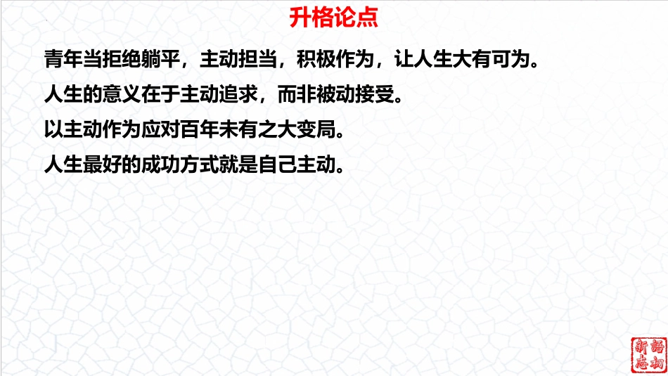 2024高考作文新趋势柒被平主行动躺与动动2024考向全新理解2023年冬季,哈尔成的旅游目的地,吸引了自全各地的游滨为热门来国客,他切地座城市“尔”。意十足的梨、梨咖,们亲称这为滨从创冻摆盘冻啡到令人的人造月亮、踏冰,哈尔了迎游客,不推出新,惊叹飞马滨为欢断陈展了特的魅力。此同,“南方小土豆”“薯公主”等趣味昵,以现独与时马铃称及“11‘小砂糖橘’成北”等登上搜,一步彰了哈个东团宠热门话题频频热进显尔的火爆程度。透一火爆象,我不哈尔的出圈非偶然。滨过这现们难发现滨并中人民大家展略究院究王水雄指出:“解放思想、提振信国学国发与战研研员心,主服和融入新展格局,是北振面的重要。”我地域动务发东兴临课题国辽,文化多,公文旅消的需求旺盛。北地一机遇,充分阔样众对费东区紧抓这自身的比,明确目定位,革新展念,成功价格洼地发挥较优势标发观将转变“价高地”,走出了一高量展的可持振之路。为值条质发续兴升格论点青年当拒绝躺平,主动担当,积极作为,让人生大有可为。人生的意义在于主动追求,而非被动接受。以主动作为应对百年未有之大变局。人生最好的成功方式就是自己主动。手打素材最令人鼓舞的事实,莫过于人类确实能主动努力以提升生命价值。——美国作家、哲学家梭罗强调主动作为对提升生命价值的意义,可直接用作文章观点。手打素材回顾百年历程,中华民族之所以能从近代历史低谷中走出,实现从站起来、富起来到强起来的伟大飞跃,一个极为重要的秘诀就在于,中国人民在党的领导下始终保持着精神上的主动。——北京师范大学前校长董奇揭示“精神上的主动”是中华民族在近代快速发展的重要秘诀,语言凝练,可用作论据。手打素材世界上没有被动成功,只有主动地奋斗。——马克思精炼的观点句,可作为分论点。手打素材当你背单词时,阿拉斯加的鳕鱼正跃出水面;当你算数学时,南太平洋的海鸥正掠过海岸;当你上晚自习时,地球的极圈正五彩斑斓;但少年,梦要你亲自实现,世界要你亲自去看。未来可期,拼尽全力!当你为未来付出踏踏实实努力的时候,那些你觉得看不到的人和遇不到的风景都终将在你的生命里出现。——“东方甄选”高级合伙人董字辉排比句式,揭示拼尽全力才能看到人生风景,可用于主体论证段。手打素材人生不只是被动地接受,更是主动地追求,才能获得你所需要的温度。——作家丁立梅强调主动追求对于人生的重要性,可用于段末总结。手打素材主动作为,就是“我想学而不是你要我学”。主动作为是一种好的方法,是一种好的人生态度,所以主动作为往往能成就大业。——西安交通大学前校长王树国阐释主动作为的内涵,揭示其积极意义,可在议论中引用,论证观点。手打素材主动作为,要在“作为”,意在担当,把该担的责任主动担起来,做到困难面前不回避、不退缩、不推诿,决不能怕担事、踢皮球、当鸵鸟。能担当有作为,不能喊在嘴上,须见诸行动。——《天津日报》强调主动作为既要勇担责任又要付诸行动,可直接用作论据。下水文段与批注主动不是躺在温床上空想,而是脚踏实地,积极行动。(观点句,领起全段)就我辈高中生而言,面对高考的“压力山大”,面对无尽的题山题海,面对学习征途中的每一道沟沟坎坎,该何去何从?有人选择“躺平”,有人干脆“摆烂”,不敢直面问题,不敢主动向困难发起冲锋,结果只能是问题越来越多,困难越来越大。(反面举例,揭示有些人面对问题与困难时缺乏主动意识)而有的人则“明知山有虎,偏向虎山行”,迎难而上,奋楫争先,不仅提高了成绩、实现了梦想,更充实了岁月、美丽了青春、无悔于成长!(正面举例,阐释主动作为的意义)这才是新时代青年应有的姿态——主动的姿态。得出结论,强化观点。下水文段与批注伟大的无产阶级革命家列宁曾说:“只要愿意学习,就一定能够学会。”诚如此言,主动是进步、成功的不二法门。(引用名言,提出观点)商鞅不远千里到达秦国,游说秦孝公变法图强,把自己的变法谋略主动奉上,为秦国的强盛开辟了坦途。试想,如果商鞅被动地待在卫国,痴痴地等待着国君的召见,那他的满腹才华与谋略,只能悄无声息地淹没在历史长河中,不会有名垂青...