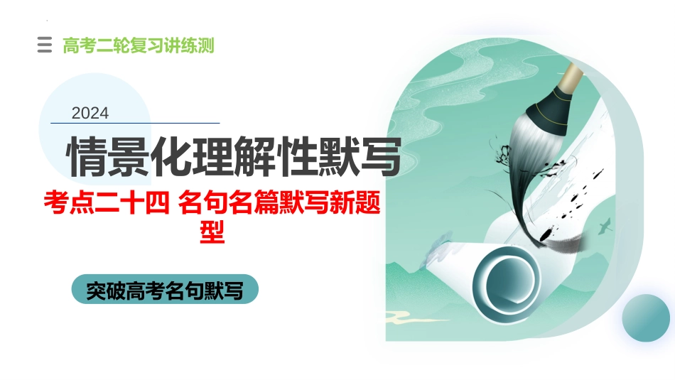 2024情景化理解性默写考点二十四名句名篇默写新题型突破高考名句默写高考二轮复习讲练测01020304目录CONTENTS考情分析知识图谱析真题研核心提炼05型特题训01考情分析题型指导1.流传必备古诗文版本众多:60篇,64篇,72篇。其实,国家考试委员会并没有明确考查哪一个版本,也没有明确哪些篇目。2.按照最新版本,人教版必修上下,选择性必修上中下课后要求背诵的篇目更少。但从往年高考考试的内容来看,仅课本上要求背诵的篇目,远远不够。3.初中课本及高中课本中的古诗、古文有可能都属于考查范围,特别是名篇(包括古诗、古文)。4.意象类不限篇目开放性理解性默写一直是高考关注的重点,建议备考时可以以“意象”为核心,把古诗中常用意象分类整理,让学生记忆。5.理解性默写的背诵只是前提,其核心还是在于“理解”,所以,要准备把握命题的角度和考查的相关知识点。6.常用的易错、易混、易忘的关键词是考查的重点。一般情况下,难以书写,不常使用,桀骜难懂的词语不再考查。•通过对2023年全国1卷、2卷、甲卷、乙卷高考情景默写题的分析。有以下几点体会:•1、分值都为6分,但是在篇目的选择上看,高中篇目和初中篇目均有涉及,但仍以高中必背篇目为主。•2、《赤壁赋》《劝学》《师说》等经典名篇不再成为热门考试篇目。《报任安书》《李凭箜篌引》《五代史伶官传序》《临安春雨初霁》《邹忌讽齐王纳谏》《行路难》等非传统经典篇目开始成为考查内容。•3、试题新颖灵活、思维跳跃性大;全国高考四套试卷第3道情景默写题均为开放性试题。(1)司马迁在《报任安书》中说,自己编写《史记》“________”,便遭遇了李陵之祸,因痛惜这部书不能完成,所以“__________”(2023年全国卷1卷)(3)小刚临摹了一幅诸葛亮的画像,想在上面题两句诗,却一直没想好。汪老师认为不妨直接用古人成句,比如“__________,_________”就很好。(2023年全国卷1卷)(3)小刚在他创作的历史小说《正气歌》中写道:文天祥月下独步于江边,眼前壮阔的景象使他不禁吟诵起前人的写景名句“___________,___________”。(2023年全国卷2卷)(3)花和雪都是古诗词中常见的物象,古代诗人常常以雪喻花,或以花喻雪,比如“___________,___________”。(2023年全国卷甲卷)(3)小刚因病不能参加比赛,汪教练给他发了一条信息。写道:“人生中的机遇绝非只有一次,古诗云:“_____________,_____________。”我对你永远充满信心!(2023年全国卷乙卷)4、单纯靠死记硬背得分、得满分的时代已经一去不复返了,必须在理解的基础上进行背诵才可以得满分。2023年高考情景默写规律小结02知识图谱2023年高考“情境式默写”更加开放,全国四套卷中,新课标I卷、新课标II卷和全国乙卷三套试题的命题情境都是围绕“小刚同学”创设的。这三道“小刚题”,除了情境创设,没有给予任何篇名提示。只是在题干中提示了核心词,要求考生利用这些核心词去找对应的句子。这种应用型默写题答案具有开放性,其目的不仅是引导考生注重古代诗词的积累,也在鼓励考生多参与语言实践活动,在真实的语言情境中灵活运用知识,培养自觉的审美意识和高尚的审美情趣。试题命题情境核心词答案[新课标I卷T17(3)]小刚临摹了一幅诸葛亮的画像,想在上面题两句诗,却一直没想好。汪老师认为不妨直接用古人成句,比如“,”就很好。题画诸葛亮示例一:出师未捷身先死,长使英雄泪满襟示例二:出师一表真名世,千载谁堪伯仲间示例三:三分割据纡筹策,万古云霄一羽毛试题命题情境核心词答案[新课标II卷T17(3)]小刚在他创作的历史小说《正气歌》中写道:文天祥月下独步于江边,眼前壮阔的景象使他不禁吟诵起前人的写景名句“,”创作小说月+江,壮阔的景象示例一:落木千山天远大,澄江一道月分明示例二:星垂(随)平野阔,月涌大江流示例三:野旷天低树,江清月近人示例四:滟滟随波千万里,何处春江无月明示例五:江天一色无纤尘,皎皎空中孤月轮试题命题情境核心词答案[全国乙卷T16(3)]小刚因病不能参加比赛,汪教练给他发了一条信息,写道:"人生中的机遇绝非只有一次,古诗云:“,”我对你永远充满信心!"发送短信鼓励他人,机遇,树立信心示...