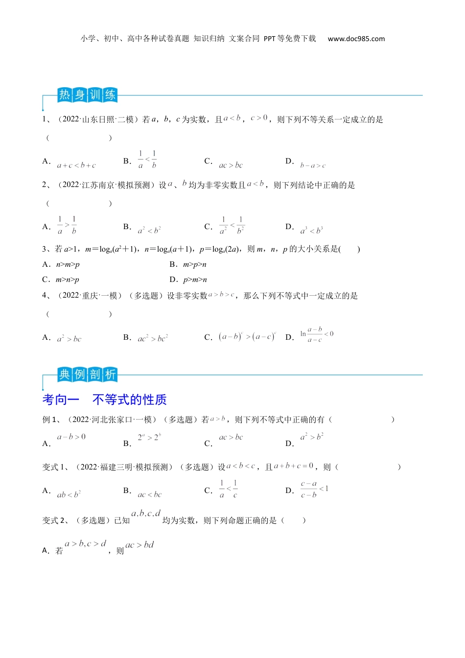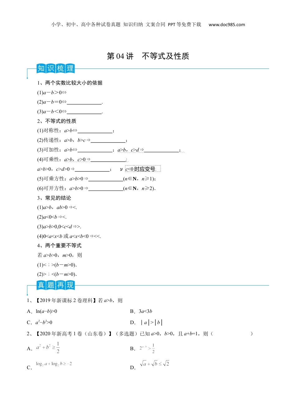 小学、初中、高中各种试卷真题知识归纳文案合同PPT等免费下载www.doc985.com第04讲不等式及性质1、两个实数比较大小的依据(1)a-b>0⇔(2)a-b=0⇔.(3)a-b<0⇔.2、不等式的性质(1)对称性:a>b⇔;(2)传递性:a>b,b>c⇒;(3)可加性:a>b⇔;a>b,c>d⇒;(4)可乘性:a>b,c>0⇒;a>b>0,c>d>0⇒;c<0.时应变号(5)可乘方性:a>b>0⇒(n∈N,n≥1);(6)可开方性:a>b>0⇒(n∈N,n≥2).3、常见的结论(1)a>b,ab>0⇒<.(2)a<0<b⇒<.(3)a>b>0,0<c<d⇒>.(4)0<a<x<b或a<x<b<0⇒<<.4、两个重要不等式若a>b>0,m>0,则(1)<;>(b-m>0).(2)>;<(b-m>0).1、【2019年新课标2卷理科】若a>b,则A.ln(a−b)>0B.3a<3bC.a3−b3>0D.│a│>│b│2、【2020年新高考1卷(山东卷)】(多选题)已知a>0,b>0,且a+b=1,则()A.B.C.D.小学、初中、高中各种试卷真题知识归纳文案合同PPT等免费下载www.doc985.com1、(2022·山东日照·二模)若a,b,c为实数,且,,则下列不等关系一定成立的是()A.B.C.D.2、(2022·江苏南京·模拟预测)设、均为非零实数且,则下列结论中正确的是()A.B.C.D.3、若a>1,m=loga(a2+1),n=loga(a+1),p=loga(2a),则m,n,p的大小关系是()A.n>m>pB.m>p>nC.m>n>pD.p>m>n4、(2022·重庆·一模)(多选题)设非零实数,那么下列不等式中一定成立的是()A.B.C.D.考向一不等式的性质例1、(2022·河北张家口·一模)(多选题)若,则下列不等式中正确的有()A.B.C.D.变式1、(2022·福建三明·模拟预测)(多选题)设,且,则()A.B.C.D.变式2、(多选题)已知均为实数,则下列命题正确的是()A.若,则小学、初中、高中各种试卷真题知识归纳文案合同PPT等免费下载www.doc985.comB.若,则C.若则D.若则变式3、(2022·山东济南·高三期末)(多选题)已知实数,,满足,则下列说法正确的是()A.B.C.D.的最小值为4方法总结:不等式性质应用问题的常见类型及解题策略:(1)不等式成立问题:熟记不等式性质的条件和结论是基础,灵活运用是关键,要注意不等式性质成立的前提条件;(2)与充分性、必要性相结合的问题:用不等式的性质分别判断p⇒q和q⇒p是否成立,要注意特殊值法的应用;(3)与命题真假判断相结合的问题:解决此类问题除根据不等式的性质求解外,还经常采用特殊值验证的方法.考向二不等式的比较大小例2、(1)已知a1,a2∈(0,1),记M=a1a2,N=a1+a2-1,则M与N的大小关系是________;(2)若a=,b=,则a______b;(填“>”或“<”)(3)若实数a≠1,比较a+2与的大小.变式1、已知M=,N=,则M,N的大小关系为________.变式2、设a>b>0,试比较与的大小.小学、初中、高中各种试卷真题知识归纳文案合同PPT等免费下载www.doc985.com方法总结:方法总结:比较大小的方法(1)作差法,其步骤:作差⇒变形⇒判断差与0的大小⇒得出结论.(2)作商法,其步骤:作商⇒变形⇒判断商与1的大小⇒得出结论.(3)构造函数法:构造函数,利用函数单调性比较大小考向三运用不等式求代数式的取值范围例3、已知-1<x<4,2<y<3,则x-y的取值范围是________,3x+2y的取值范围是________.变式1、(1)已知-1<x+y<4,2<x-y<3,求3x+2y的取值范围;(2)已知函数f(x)=ax2+bx,且1≤f(-1)≤2,2≤f(1)≤4,求f(-2)的取值范围;(3)已知1≤lg(xy)≤4,-1≤lg≤2,求lg的取值范围.方法总结:求代数式的取值范围一般是利用整体思想,通过“一次性”不等关系的运算求得整体范围1、(2022·江苏淮安市六校第一次联考)若a,b,c∈R,a>b,则下列不等式恒成立的是()A.<B.a2>b2C.>D.a|c|>b|c|2、(2021·广州市第一中学高三月考)十六世纪中叶,英国数学家雷科德在《砺智石》一书中首先把“=”作为等号使用,后来英国数学家哈利奥特首次使用“<”和“>”符号,并逐渐被数学界接受,不等号的引入对不等式的发展影响深远.若,则下列结论错误的是()小学、初中、高中各种试卷真题知识归纳文案合同PPT等免费下载www.doc985.comA.B.C.D.3、(2022·江苏无锡市第一中学高三10月月考)(多选题)若a>b>0,则一下几个不等式中正确的是...