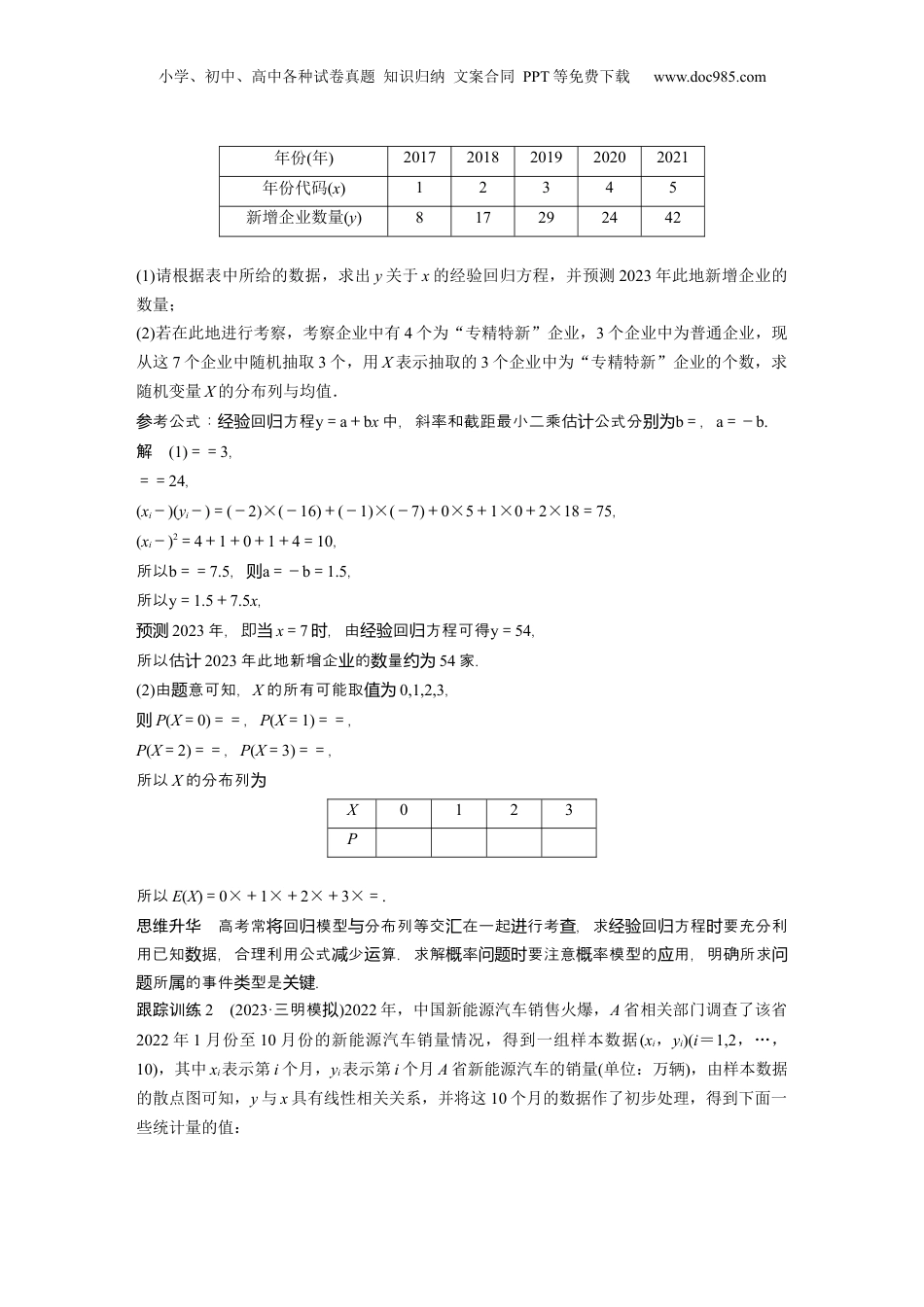 小学、初中、高中各种试卷真题知识归纳文案合同PPT等免费下载www.doc985.com§10.8概率与统计的综合问题题型一频率分布直方图与分布列的综合问题例12022年是中国共产主义青年团成立100周年,为引导和带动青少年重温共青团百年光辉历程,某校组织全体学生参加共青团百年历史知识竞赛,现从中随机抽取了100名学生的成绩组成样本,并将得分分成以下6组:[40,50),[50,60),[60,70),…,[90,100],统计结果如图所示.(1)试估计这100名学生得分的平均数;(2)从样本中得分不低于70分的学生中,用比例分配的分层随机抽样的方法选取11人进行座谈,若从座谈名单中随机抽取3人,记其得分在[90,100]的人数为ξ,试求ξ的分布列和均值;(3)以样本估计总体,根据频率分布直方图,可以认为参加知识竞赛的学生的得分X近似地服从正态分布N(μ,σ2),其中μ近似为样本平均数,σ2近似为样本方差s2,经计算s2=42.25.现从所有参加知识竞赛的学生中随机抽取500人,若这500名学生的得分相互独立,试问得分高于77分的人数最有可能是多少?考据:若机量参数随变X~N(μ,σ2),则P(μ-σ≤X≤μ+σ)≈0.6827,P(μ-2σ≤X≤μ+2σ)≈0.9545,P(μ-3σ≤X≤μ+3σ)≈0.9973.解(1)估计这100名生得分的平均学数为10×(45×0.010+55×0.015+65×0.020+75×0.030+85×0.015+95×0.010)=70.5.(2)本中得分不低于从样70分的生中,用比例分配的分机抽的方法取学层随样选11人行座进,其中得分在谈[90,100]的人数为×11=2.若座名中机抽取从谈单随3人,其得分在记[90,100]的人数为ξ,则ξ的所有可能取值为0,1,2.P(ξ=0)==,P(ξ=1)==,P(ξ=2)==,则ξ的分布列为ξ012P小学、初中、高中各种试卷真题知识归纳文案合同PPT等免费下载www.doc985.com所以E(ξ)=0×+1×+2×=.(3)由意知,题μ=70.5,σ2=s2=42.25,σ=6.5.P(X>77)=P(X>μ+σ)=≈0.15865,所以这500名生得分高于学77分的人最有可能数为0.15865×500≈79.思维升华高考常率分布直方分布列等交在一起行考,解要正确理解将频图与汇进查题时频率分布直方,能利用率分布直方正确算出各据.率以算主,往往和图频图计组数概问题计为相合,要注意理解的意,使之和相的率算起.实际问题结实际问题义应概计对应来跟踪训练1(2023·南模济拟)从某企业的某种产品中随机抽取100件,测量这些产品的一项质量指标值,由测量结果制成如图所示的频率分布直方图.(1)求这100件产品质量指标值的样本平均数(同一组数据用该区间的中点值作代表);(2)已知某用户从该企业购买了3件该产品,用X表示这3件产品中质量指标值位于[35,45]内的产品件数,用频率估计概率,求X的分布列.解(1)由已知得,=10×0.015×10+20×0.040×10+30×0.025×10+40×0.020×10=25.(2)因一件品,其量指位于为购买产质标值[35,45]的率内概为0.2,所以X~B(3,0.2),因为X的所有可能取值为0,1,2,3,所以P(X=0)=(1-0.2)3=0.512,P(X=1)=C×0.2×(1-0.2)2=0.384,P(X=2)=C×0.22×(1-0.2)=0.096,P(X=3)=0.23=0.008,所以X的分布列为X0123P0.5120.3840.0960.008题型二回归模型与分布列的综合问题例2(2022·德州模拟)工信部发布的《“十四五”促进中小企业发展规划》中明确提出建立“百十万千”的中小企业梯度培育体系,引导中小企业走向“专精特新”“小巨人”“隐形冠军”的发展方向,“专精特新”是指具备专业化、精细化、特色化、新颖化优势的中小企业.下表是某地2017-2021年新增企业数量的有关数据:小学、初中、高中各种试卷真题知识归纳文案合同PPT等免费下载www.doc985.com年份(年)20172018201920202021年份代码(x)12345新增企业数量(y)817292442(1)请根据表中所给的数据,求出y关于x的经验回归方程,并预测2023年此地新增企业的数量;(2)若在此地进行考察,考察企业中有4个为“专精特新”企业,3个企业中为普通企业,现从这7个企业中随机抽取3个,用X表示抽取的3个企业中为“专精特新”企业的个数,求随机变量X的分布列与均值.考公式:回方程参经验归y=a+bx中,斜率和截距最小二乘估公式分计别为b=,a=-b.解(1)==3,==24,(xi-)(yi-...