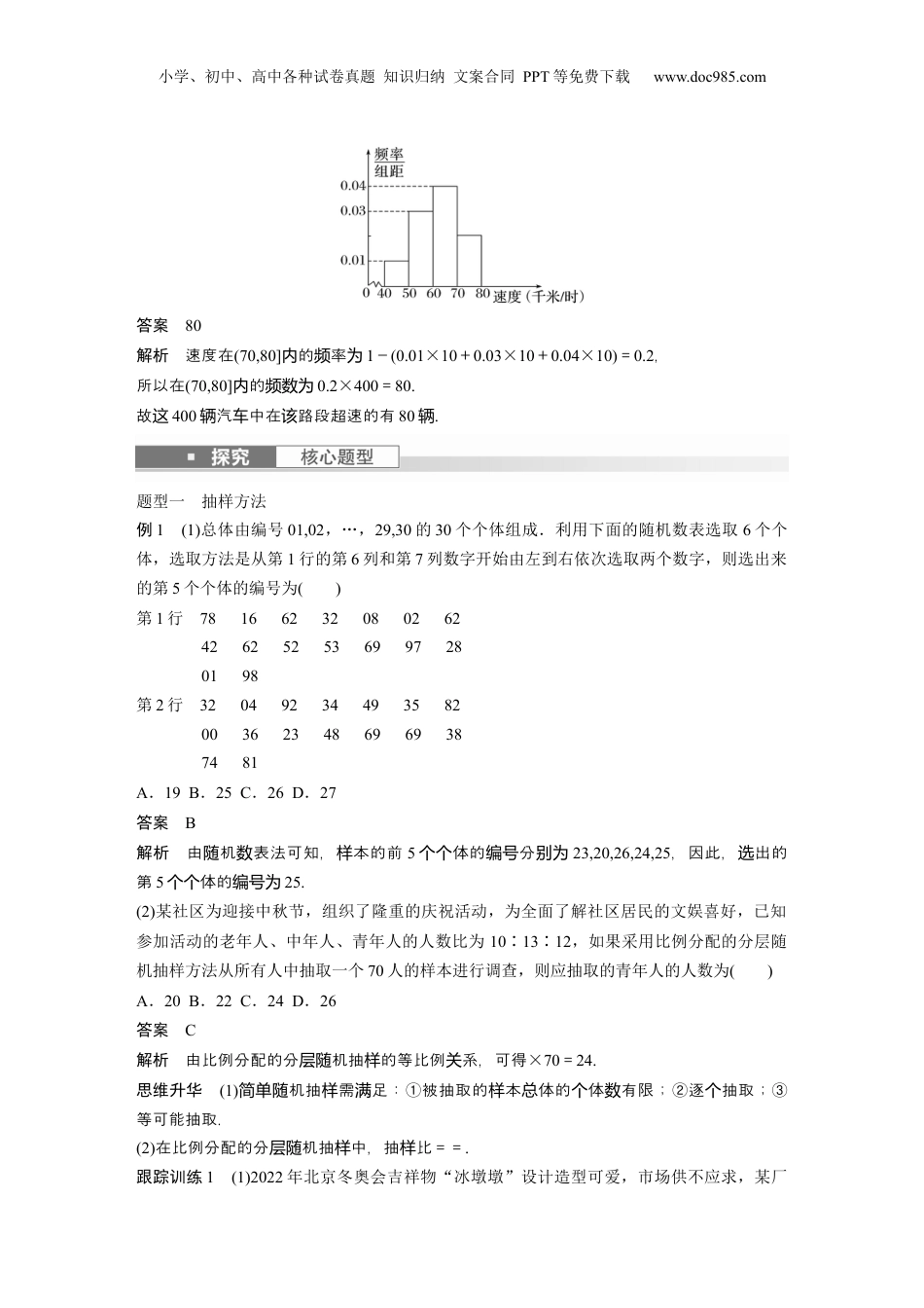 小学、初中、高中各种试卷真题知识归纳文案合同PPT等免费下载www.doc985.com§9.1随机抽样、统计图表考试要求1.了解获取数据的基本途径.2.会用简单随机抽样的方法从总体中抽取样本,了解分层随机抽样.3.能根据实际问题的特点选择恰当的统计图表,体会使用统计图表的重要性.知识梳理1.总体、个体、样本调查对象的全体(或调查对象的某些指标的全体)称为总体,组成总体的每一个调查对象(或每一个调查对象的相应指标)称为个体,在抽样调查中,从总体中抽取的那部分个体称为样本,样本中包含的个体数称为样本容量,简称样本量.2.简单随机抽样抽签法和随机数法是比较常用的两种方法.3.分层随机抽样一般地,按一个或多个变量把总体划分成若干个子总体,每个个体属于且仅属于一个子总体,在每个子总体中独立地进行简单随机抽样,再把所有子总体中抽取的样本合在一起作为总样本,这样的抽样方法称为分层随机抽样,每一个子总体称为层.4.统计图表(1)常见的统计图表有条形图、扇形图、折线图、频率分布直方图等.(2)作频率分布直方图的步骤①求极差;②决定组距与组数;③将数据分组;④列频率分布表;⑤画频率分布直方图.常用结论1.利用比例分配的分层随机抽样要注意按比例抽取,若各层应抽取的个体数不都是整数,小学、初中、高中各种试卷真题知识归纳文案合同PPT等免费下载www.doc985.com可以进行一定的技术处理,比如将结果取成整数等.2.在比例分配的分层随机抽样中,以层数是2层为例,如果第1层和第2层包含的个体数分别为M和N,抽取的样本量分别为m和n,第1层和第2层的样本平均数分别为,,样本平均数为,则=+=+.3.频率分布直方图中纵轴上的数据是各组的频率除以组距,不要和条形图混淆.思考辨析判断下列结论是否正确(请在括号中打“√”或“×”)(1)在机抽中,每体被抽到的机先后序有.简单随样个个会与顺关(×)(2)抽法和机法都是机抽.签随数简单随样(√)(3)在比例分配的分机抽中,每体被抽到的可能性及分有.层随样个个与层数层关(×)(4)在率分布直方中,小方形的面越大,表示本据落在的率越大.频图长积样数该区间频(√)教材改编题1.从某市参加升学考试的学生中随机抽查1000名学生的数学成绩进行统计分析,在这个问题中,下列说法错误的是()A.总体指的是该市参加升学考试的全体学生B.样本是指1000名学生C.样本量指的是1000名学生D.个体指的是该市参加升学考试的每一名学生答案C解析于对C,本量是样1000,故C.错误2.为了了解我国某品牌手机的销售情况,小张在某网站上下载了如图所示的统计图.小张是通过________获取数据.答案查询3.已知某一段公路限速70千米/时,现抽取400辆通过这一段公路的汽车的速度,其频率分布直方图如图所示,则这400辆汽车中在该路段超速的有________辆.小学、初中、高中各种试卷真题知识归纳文案合同PPT等免费下载www.doc985.com答案80解析速度在(70,80]的率内频为1-(0.01×10+0.03×10+0.04×10)=0.2,所以在(70,80]的内频数为0.2×400=80.故这400汽中在路段超速的有辆车该80辆.题型一抽样方法例1(1)总体由编号01,02,…,29,30的30个个体组成.利用下面的随机数表选取6个个体,选取方法是从第1行的第6列和第7列数字开始由左到右依次选取两个数字,则选出来的第5个个体的编号为()第1行78166232080262426252536997280198第2行32049234493582003623486969387481A.19B.25C.26D.27答案B解析由机表法可知,本的前随数样5体的分个个编号别为23,20,26,24,25,因此,出的选第5体的个个编号为25.(2)某社区为迎接中秋节,组织了隆重的庆祝活动,为全面了解社区居民的文娱喜好,已知参加活动的老年人、中年人、青年人的人数比为10∶13∶12,如果采用比例分配的分层随机抽样方法从所有人中抽取一个70人的样本进行调查,则应抽取的青年人的人数为()A.20B.22C.24D.26答案C解析由比例分配的分机抽的等比例系,可得层随样关×70=24.思维升华(1)机抽需足:简单随样满①被抽取的本体的体有限;样总个数②逐抽取;个③等可能抽取.(2)在比例分配的分机抽中,抽比==层随样样.跟踪训练1(1)2022年北京冬奥会吉祥物“冰墩墩”设计造型...