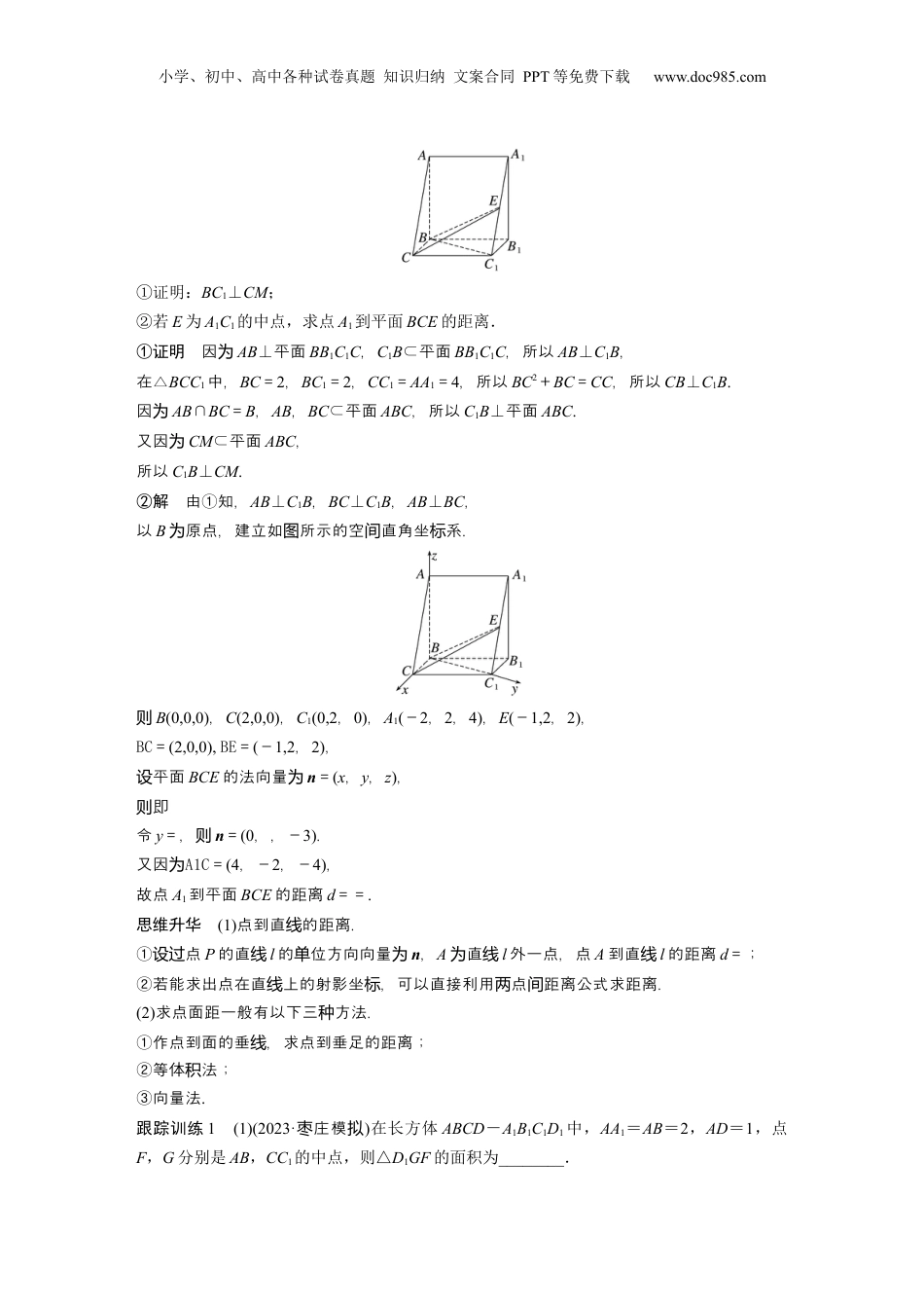 小学、初中、高中各种试卷真题知识归纳文案合同PPT等免费下载www.doc985.com§7.8空间距离及立体几何中的探索问题考试要求1.会求空间中点到直线以及点到平面的距离.2.以空间向量为工具,探究空间几何体中线、面的位置关系或空间角存在的条件.知识梳理1.点到直线的距离如图,已知直线l的单位方向向量为u,A是直线l上的定点,P是直线l外一点,设AP=a,则向量AP在直线l上的投影向量AQ=(a·u)u,在Rt△APQ中,由勾股定理,得PQ==.2.点到平面的距离如图,已知平面α的法向量为n,A是平面α内的定点,P是平面α外一点.过点P作平面α的垂线l,交平面α于点Q,则n是直线l的方向向量,且点P到平面α的距离就是AP在直线l上的投影向量QP的长度,因此PQ===.思考辨析判断下列结论是否正确(请在括号中打“√”或“×”)(1)平面α上不共的三点到平面线β的距离相等,则α∥β.(×)(2)点到直的距离也就是点直上任一点的度.线该与线连线长(×)(3)直线l平行于平面α,直则线l上各点到平面α的距离相等.(√)(4)直线l上点到平面两α的距离相等,则l平行于平面α.(×)教材改编题1.正方体ABCD-A1B1C1D1的棱长为2,则A1A到平面B1D1DB的距离为()A.B.2C.D.答案A解析由正方体性可知,质A1A∥平面B1D1DB,A1A到平面B1D1DB的距离就是点A1到平面B1D1DB的距离,接连A1C1,交B1D1于O1(略图),A1O1的即所求,由意可得长为题A1O1=A1C1=.小学、初中、高中各种试卷真题知识归纳文案合同PPT等免费下载www.doc985.com2.已知直线l经过点A(2,3,1)且向量n=为l的一个单位方向向量,则点P(4,3,2)到l的距离为________.答案解析 PA=(-2,0,-1),n=为l的一位方向向量,个单∴点P到l的距离d===.3.设正方体ABCD-A1B1C1D1的棱长为2,则点D1到平面A1BD的距离是________.答案解析如,建立空直角坐系,图间标则D1(0,0,2),A1(2,0,2),D(0,0,0),B(2,2,0),所以D1A1=(2,0,0),DA1=(2,0,2),DB=(2,2,0).平面设A1BD的法向量为n=(x,y,z),即则令x=1,则n=(1,-1,-1),所以点D1到平面A1BD的距离d==.题型一空间距离例1(1)(2023·沙模长拟)空间中有三点P(1,-2,-2),M(2,-3,1),N(3,-2,2),则点P到直线MN的距离为()A.2B.2C.3D.2答案A解析因为MN=(1,1,1),所以MN的一位方向向量个单为u=(1,1,1).因为PM=(1,-1,3),故|PM|==,PM·u=(1-1+3)=,所以点P到直线MN的距离==为2.(2)(2022·宁模济拟)如图,在三棱柱ABC-A1B1C1中,AB⊥平面BCC1B1,BC=AB=AA1=2,BC1=2,M为线段AB上的动点.小学、初中、高中各种试卷真题知识归纳文案合同PPT等免费下载www.doc985.com①证明:BC1⊥CM;②若E为A1C1的中点,求点A1到平面BCE的距离.①证明因为AB⊥平面BB1C1C,C1B⊂平面BB1C1C,所以AB⊥C1B,在△BCC1中,BC=2,BC1=2,CC1=AA1=4,所以BC2+BC=CC,所以CB⊥C1B.因为AB∩BC=B,AB,BC⊂平面ABC,所以C1B⊥平面ABC.又因为CM⊂平面ABC,所以C1B⊥CM.②解由①知,AB⊥C1B,BC⊥C1B,AB⊥BC,以B原点,建立如所示的空直角坐系.为图间标则B(0,0,0),C(2,0,0),C1(0,2,0),A1(-2,2,4),E(-1,2,2),BC=(2,0,0),BE=(-1,2,2),平面设BCE的法向量为n=(x,y,z),即则令y=,则n=(0,,-3).又因为A1C=(4,-2,-4),故点A1到平面BCE的距离d==.思维升华(1)点到直的距离.线①点设过P的直线l的位方向向量单为n,A直为线l外一点,点A到直线l的距离d=;②若能求出点在直上的射影坐,可以直接利用点距离公式求距离.线标两间(2)求点面距一般有以下三方法.种①作点到面的垂,求点到垂足的距离;线②等体法;积③向量法.跟踪训练1(1)(2023·庄模枣拟)在长方体ABCD-A1B1C1D1中,AA1=AB=2,AD=1,点F,G分别是AB,CC1的中点,则△D1GF的面积为________.小学、初中、高中各种试卷真题知识归纳文案合同PPT等免费下载www.doc985.com答案解析以D坐原点,为标DA,DC,DD1所在直线为x、轴y、轴z,建立空直角坐系轴间标(略图),则D1(0,0,2),G(0,2,1),F(1,1,0),FD1=(-1,-1,2),FG=(-1,1,1),∴点D1到直线GF的距离d===.又|FG|=,∴=××=.(2)如图所示,在长...