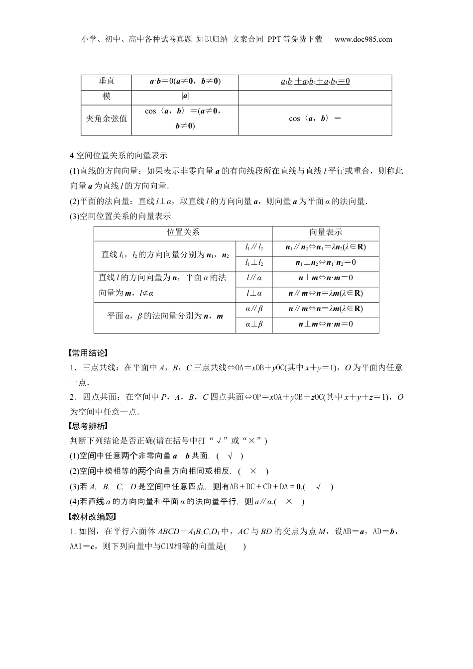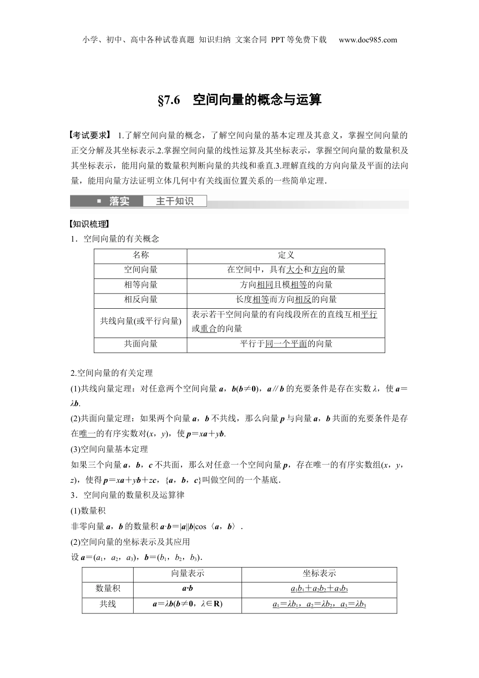 小学、初中、高中各种试卷真题知识归纳文案合同PPT等免费下载www.doc985.com§7.6空间向量的概念与运算考试要求1.了解空间向量的概念,了解空间向量的基本定理及其意义,掌握空间向量的正交分解及其坐标表示.2.掌握空间向量的线性运算及其坐标表示,掌握空间向量的数量积及其坐标表示,能用向量的数量积判断向量的共线和垂直.3.理解直线的方向向量及平面的法向量,能用向量方法证明立体几何中有关线面位置关系的一些简单定理.知识梳理1.空间向量的有关概念名称定义空间向量在空间中,具有大小和方向的量相等向量方向相同且模相等的向量相反向量长度相等而方向相反的向量共线向量(或平行向量)表示若干空间向量的有向线段所在的直线互相平行或重合的向量共面向量平行于同一个平面的向量2.空间向量的有关定理(1)共线向量定理:对任意两个空间向量a,b(b≠0),a∥b的充要条件是存在实数λ,使a=λb.(2)共面向量定理:如果两个向量a,b不共线,那么向量p与向量a,b共面的充要条件是存在唯一的有序实数对(x,y),使p=xa+yb.(3)空间向量基本定理如果三个向量a,b,c不共面,那么对任意一个空间向量p,存在唯一的有序实数组(x,y,z),使得p=xa+yb+zc,{a,b,c}叫做空间的一个基底.3.空间向量的数量积及运算律(1)数量积非零向量a,b的数量积a·b=|a||b|cos〈a,b〉.(2)空间向量的坐标表示及其应用设a=(a1,a2,a3),b=(b1,b2,b3).向量表示坐标表示数量积a·ba1b1+a2b2+a3b3共线a=λb(b≠0,λ∈R)a1=λb1,a2=λb2,a3=λb3小学、初中、高中各种试卷真题知识归纳文案合同PPT等免费下载www.doc985.com垂直a·b=0(a≠0,b≠0)a1b1+a2b2+a3b3=0模|a|夹角余弦值cos〈a,b〉=(a≠0,b≠0)cos〈a,b〉=4.空间位置关系的向量表示(1)直线的方向向量:如果表示非零向量a的有向线段所在直线与直线l平行或重合,则称此向量a为直线l的方向向量.(2)平面的法向量:直线l⊥α,取直线l的方向向量a,则向量a为平面α的法向量.(3)空间位置关系的向量表示位置关系向量表示直线l1,l2的方向向量分别为n1,n2l1∥l2n1∥n2⇔n1=λn2(λ∈R)l1⊥l2n1⊥n2⇔n1·n2=0直线l的方向向量为n,平面α的法向量为m,l⊄αl∥αn⊥m⇔n·m=0l⊥αn∥m⇔n=λm(λ∈R)平面α,β的法向量分别为n,mα∥βn∥m⇔n=λm(λ∈R)α⊥βn⊥m⇔n·m=0常用结论1.三点共线:在平面中A,B,C三点共线⇔OA=xOB+yOC(其中x+y=1),O为平面内任意一点.2.四点共面:在空间中P,A,B,C四点共面⇔OP=xOA+yOB+zOC(其中x+y+z=1),O为空间中任意一点.思考辨析判断下列结论是否正确(请在括号中打“√”或“×”)(1)空中任意非零向量间两个a,b共面.(√)(2)空中模相等的向量方向相同或相反.间两个(×)(3)若A,B,C,D是空中任意四点,有间则AB+BC+CD+DA=0.(√)(4)若直线a的方向向量和平面α的法向量平行,则a∥α.(×)教材改编题1.如图,在平行六面体ABCD-A1B1C1D1中,AC与BD的交点为点M,设AB=a,AD=b,AA1=c,则下列向量中与C1M相等的向量是()小学、初中、高中各种试卷真题知识归纳文案合同PPT等免费下载www.doc985.comA.-a+b+cB.a+b+cC.-a-b-cD.-a-b+c答案C解析C1M=C1C+CM=C1C+(CB+CD)=A1A+DA+BA=-a-b-c.2.如图所示,在正方体ABCD-A1B1C1D1中,棱长为a,M,N分别为A1B和AC上的点,A1M=AN=,则MN与平面BB1C1C的位置关系是()A.相交B.平行C.垂直D.不能确定答案B解析分以别C1B1,C1D1,C1C所在直线为x,y,z,建立空直角坐系.因轴间标为A1M=AN=,所以M,N,所以MN=,又C1(0,0,0),D1(0,a,0),所以C1D1=(0,a,0),所以MN·C1D1=0,所以MN⊥C1D1.因为C1D1是平面BB1C1C的一法向量,且个MN⊄平面BB1C1C,所以MN∥平面BB1C1C.3.设直线l1,l2的方向向量分别为a=(-2,2,1),b=(3,-2,m),若l1⊥l2,则m=________.答案10解析 l1⊥l2,∴a⊥b,∴a·b=-6-4+m=0,∴m=10.题型一空间向量的线性运算例1(1)在空间四边形ABCD中,AB=(-3,5,2),CD=(-7,-1,-4),点E,F分别为线小学、初中、高中各种试卷真题知识归纳文案合同PPT等免费下...