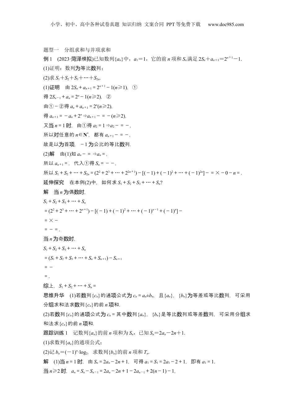 小学、初中、高中各种试卷真题知识归纳文案合同PPT等免费下载www.doc985.com§6.5数列求和考试要求1.熟练掌握等差、等比数列的前n项和公式.2.掌握非等差数列、非等比数列求和的几种常用方法.知识梳理数列求和的几种常用方法1.公式法直接利用等差数列、等比数列的前n项和公式求和.(1)等差数列的前n项和公式:Sn==na1+d.(2)等比数列的前n项和公式:Sn=.2.分组求和法与并项求和法(1)分组求和法若一个数列是由若干个等差数列或等比数列或可求和的数列组成,则求和时可用分组求和法,分别求和后相加减.(2)并项求和法一个数列的前n项和中,可两两结合求解,则称之为并项求和.形如an=(-1)nf(n)类型,可采用两项合并求解.3.错位相减法如果一个数列的各项是由一个等差数列和一个等比数列的对应项之积构成的,那么这个数列的前n项和即可用此法来求,如等比数列的前n项和公式就是用此法推导的.4.裂项相消法把数列的通项拆成两项之差,在求和时中间的一些项可以相互抵消,从而求得其和.常见的裂项技巧(1)=-.(2)=.(3)=.(4)=-.(5)=.常用结论常用求和公式小学、初中、高中各种试卷真题知识归纳文案合同PPT等免费下载www.doc985.com(1)1+2+3+4+…+n=.(2)1+3+5+7+…+(2n-1)=n2.(3)12+22+32+…+n2=.(4)13+23+33+…+n3=2.思考辨析判断下列结论是否正确(请在括号中打“√”或“×”)(1)如果列数{an}等比列,且公比不等于为数1,其前则n和项Sn=.(√)(2)求Sn=a+2a2+3a3+…+nan,只要把上式等同乘时号两边时a即可根据位相法求得错减.(×)(3)已知等差列数{an}的公差为d,有=则.(×)(4)sin21°+sin22°+sin23°+…+sin288°+sin289°=44.5.(√)教材改编题1.已知函数f(n)=且an=f(n)+f(n+1),则a1+a2+a3+…+a100等于()A.0B.100C.-100D.10200答案B解析由意,得题a1+a2+a3+…+a100=12-22-22+32+32-42-42+52+…+992-1002-1002+1012=-(1+2)+(3+2)-(4+3)+…-(99+100)+(101+100)=-(1+2+…+99+100)+(2+3+…+100+101)=-50×101+50×103=100.2.数列{an}的前n项和为Sn.若an=,则S5等于()A.1B.C.D.答案B解析因为an==-,所以S5=a1+a2+…+a5=1-+-+…-=.3.Sn=+++…+等于()A.B.C.D.答案B解析由Sn=+++…+,①得Sn=++…++,②①-②得,Sn=+++…+-=-,∴Sn=.小学、初中、高中各种试卷真题知识归纳文案合同PPT等免费下载www.doc985.com题型一分组求和与并项求和例1(2023·模菏泽拟)已知数列{an}中,a1=1,它的前n项和Sn满足2Sn+an+1=2n+1-1.(1)证明:数列等比列为数;(2)求S1+S2+S3+…+S2n.(1)证明由2Sn+an+1=2n+1-1(n≥1),①得2Sn-1+an=2n-1(n≥2),②由①-②得an+an+1=2n(n≥2),得an+1=-an+2n⇒an+1-=-(n≥2),又当n=1,由时①得a2=1⇒a2-=-,所以任意的对n∈N*,都有an+1-=-,故是以首,-为项1公比的等比列.为数(2)解由(1)知an-=⇒an=,所以an+1=,代入①得Sn=--,所以S1+S2+…+S2n=(22+23+…+22n+1)-[(-1)+(-1)2+…+(-1)2n]-=×-0-n=.延伸探究在本例(2)中,如何求S1+S2+S3+…+Sn?解当n偶,为数时S1+S2+S3+…+Sn=(22+23+…+2n+1)-[(-1)+(-1)2+…+(-1)n-1+(-1)n]-=×-=-=.当n奇,为数时S1+S2+S3+…+Sn=(S1+S2+S3+…+Sn+Sn+1)-Sn+1=-=.上,综S1+S2+…+Sn=思维升华(1)若列数{cn}的通公式项为cn=an±bn,且{an},{bn}等差或等比列,可采用为数分求和法求列组数{cn}的前n和.项(2)若列数{cn}的通公式项为cn=其中列数{an},{bn}是等比列或等差列,可采用分求数数组和法求{cn}的前n和.项跟踪训练1记数列{an}的前n项和为Sn,已知Sn=2an-2n+1.(1)求数列{an}的通项公式;(2)记bn=(-1)n·log2,求数列{bn}的前n项和Tn.解(1)当n=1,由时Sn=2an-2n+1,可得a1=S1=2a1-2+1,即有a1=1.当n≥2,时an=Sn-Sn-1=2an-2n+1-2an-1+2(n-1)-1,小学、初中、高中各种试卷真题知识归纳文案合同PPT等免费下载www.doc985.com...