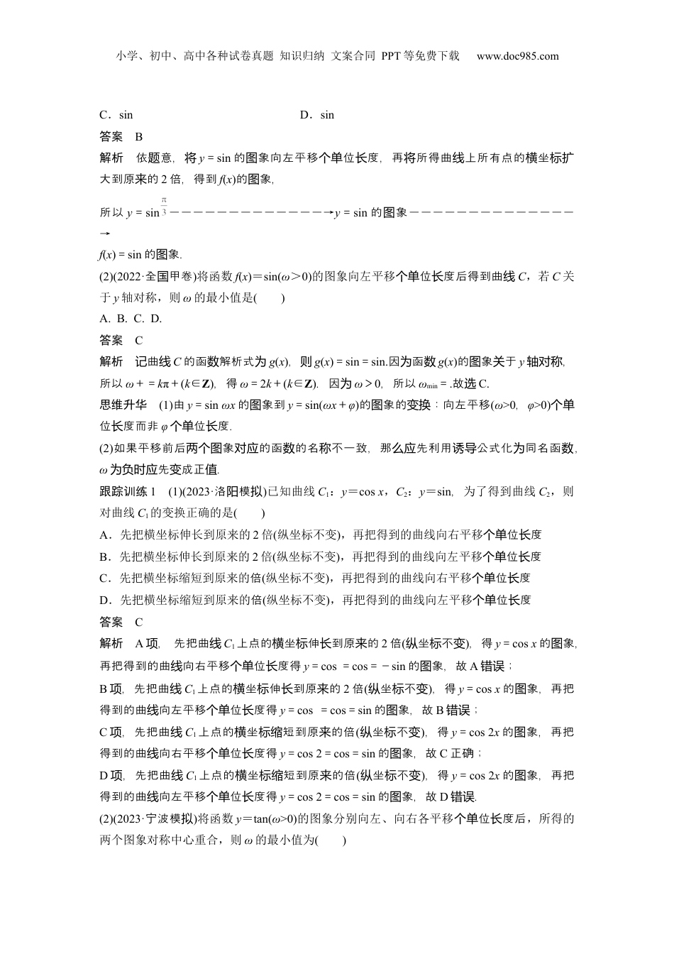 小学、初中、高中各种试卷真题知识归纳文案合同PPT等免费下载www.doc985.com§4.6函数y=Asin(ωx+φ)考试要求1.结合具体实例,了解y=Asin(ωx+φ)的实际意义;能借助图象理解参数ω,φ,A的意义,了解参数的变化对函数图象的影响.2.会用三角函数解决简单的实际问题,体会可以利用三角函数构建刻画事物周期变化的数学模型.知识梳理1.简谐运动的有关概念已知函数y=Asin(ωx+φ)(A>0,ω>0),x≥0振幅周期频率相位初相AT=f==ωx+φφ2.用“五点法”画y=Asin(ωx+φ)(A>0,ω>0)一个周期内的简图时,要找五个特征点ωx+φ0π2πxy=Asin(ωx+φ)0A0-A03.函数y=sinx的图象经变换得到y=Asin(ωx+φ)(A>0,ω>0)的图象的两种途径常用结论小学、初中、高中各种试卷真题知识归纳文案合同PPT等免费下载www.doc985.com1.函数y=Asin(ωx+φ)+k图象平移的规律:“左加右减,上加下减”.2.函数y=Asin(ωx+φ)图象的对称轴由ωx+φ=kπ+,k∈Z确定;对称中心由ωx+φ=kπ,k∈Z确定其横坐标.思考辨析判断下列结论是否正确(请在括号中打“√”或“×”)(1)函数f(x)=Asin(ωx+φ)(A≠0)的最大值为A,最小-值为A.(×)(2)函数f(x)=sin2x向右平移位度后的函个单长对应数g(x)=sin.(×)(3)把y=sinx的象上各点的坐短原的,所得函解析式图横标缩为来数为y=sinx.(×)(4)如果y=Acos(ωx+φ)的最小正周期为T,那函象的相中心之的距离么数图邻两个对称间为.(√)教材改编题1.函数y=2sin的振幅、频率和初相分别为()A.2,,B.2,,C.2,,D.2,,-答案A解析由振幅、率和初相的定可知,函频义数y=2sin的振幅为2,率,初相频为为.2.(2022·浙江)为了得到函数y=2sin3x的图象,只要把函数y=2sin象上所有的点图()A.向左平移位度个单长B.向右平移位度个单长C.向左平移位度个单长D.向右平移位度个单长答案D解析因为y=2sin=2sin3,所以要得到函数y=sin3x的象,只要把函图数y=2sin象上图所有的点向右平移位度即可,故个单长选D.3.某港口在一天24小时内的潮水的高度近似满足关系式f(t)=2sin,其中f(t)的单位为m,t的单位是h,则12点时潮水的高度是________m.答案1解析当t=12,时f(12)=2sin=2sin=1,即12点潮水的高度是时1m.题型一函数y=Asin(ωx+φ)的图象及变换例1(1)(2021·全乙卷国)把函数y=f(x)图象上所有点的横坐标缩短到原来的倍,纵坐标不变,再把所得曲线向右平移位度个单长,得到函数y=sin的象图,则f(x)等于()A.sinB.sin小学、初中、高中各种试卷真题知识归纳文案合同PPT等免费下载www.doc985.comC.sinD.sin答案B解析依意,题将y=sin的象向左平移位度,再所得曲上所有点的坐图个单长将线横标扩大到原的来2倍,得到f(x)的象,图所以y=sin―――――――――――――→y=sin的象图――――――――――――――→f(x)=sin的象.图(2)(2022·全甲卷国)将函数f(x)=sin(ω>0)的图象向左平移位度后得到曲个单长线C,若C关于y轴对称,则ω的最小值是()A.B.C.D.答案C解析曲记线C的函解析式数为g(x),则g(x)=sin=sin.因函为数g(x)的象于图关y,轴对称所以ω+=kπ+(k∈Z),得ω=2k+(k∈Z).因为ω>0,所以ωmin=.故选C.思维升华(1)由y=sinωx的象到图y=sin(ωx+φ)的象的:向左平移图变换(ω>0,φ>0)个单位度而非长φ位度.个单长(2)如果平移前后象的函的名不一致,那先利用公式化同名函两个图对应数称么应诱导为数,ω先成正.为负时应变值跟踪训练1(1)(2023·洛模阳拟)已知曲线C1:y=cosx,C2:y=sin,为了得到曲线C2,则对曲线C1的变换正确的是()A.先把横坐标伸长到原来的2倍(纵坐标不变),再把得到的曲线向右平移位度个单长B.先把横坐标伸长到原来的2倍(纵坐标不变),再把得到的曲线向左平移位度个单长C.先把横坐标缩短到原来的倍(纵坐标不变),再把得到的曲线向右平移位度个单长D.先把横坐标缩短到原来的倍(纵坐标不变),再把得到的曲线向左平移位度个单长答案C解析A,先把曲项线C1上点的坐伸到原的横标长来2倍(坐不纵标变),得y=cosx的象图,再把得到的曲向右平移位度得线个单长y=cos=cos=-sin的象,故图...